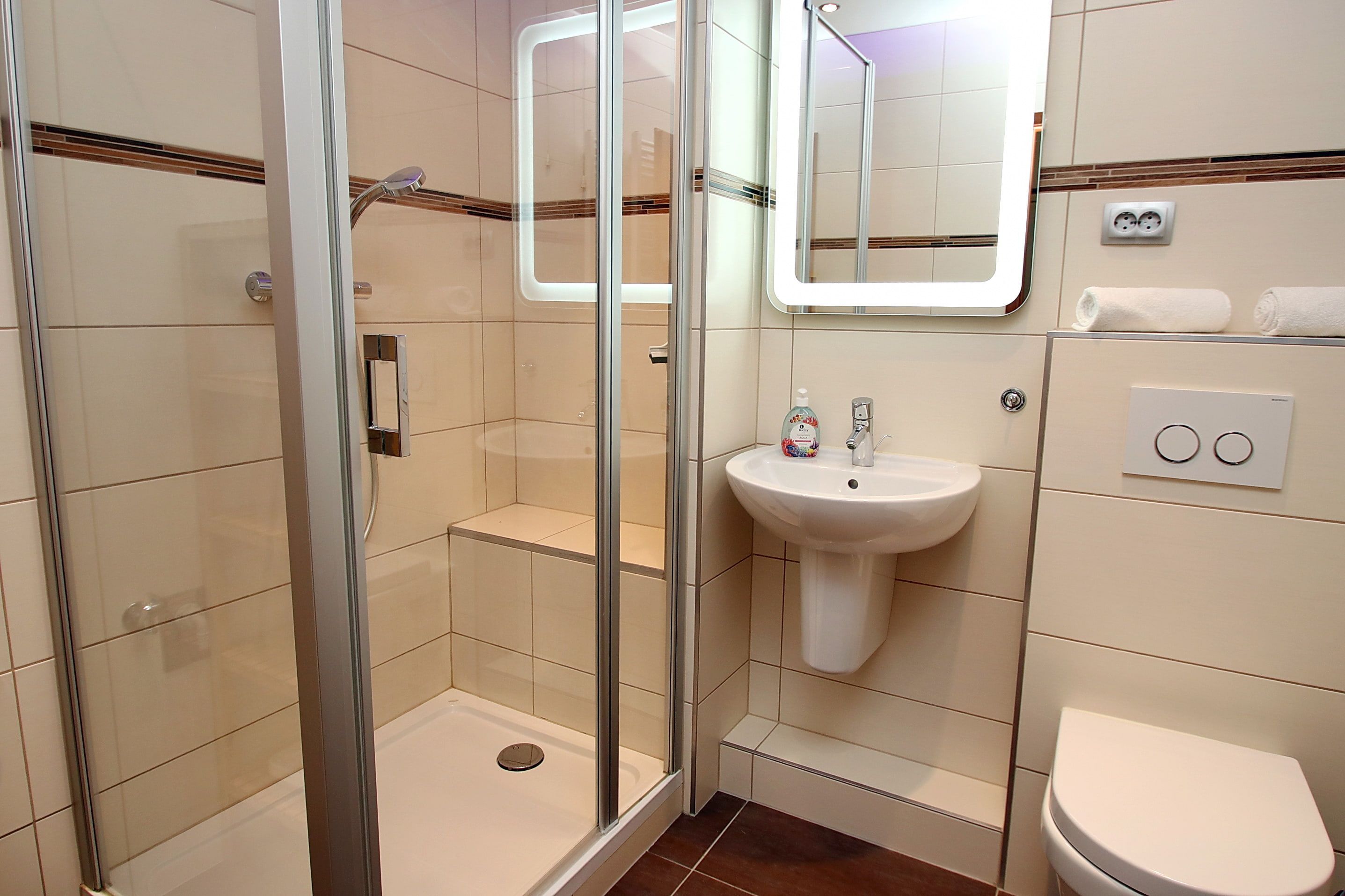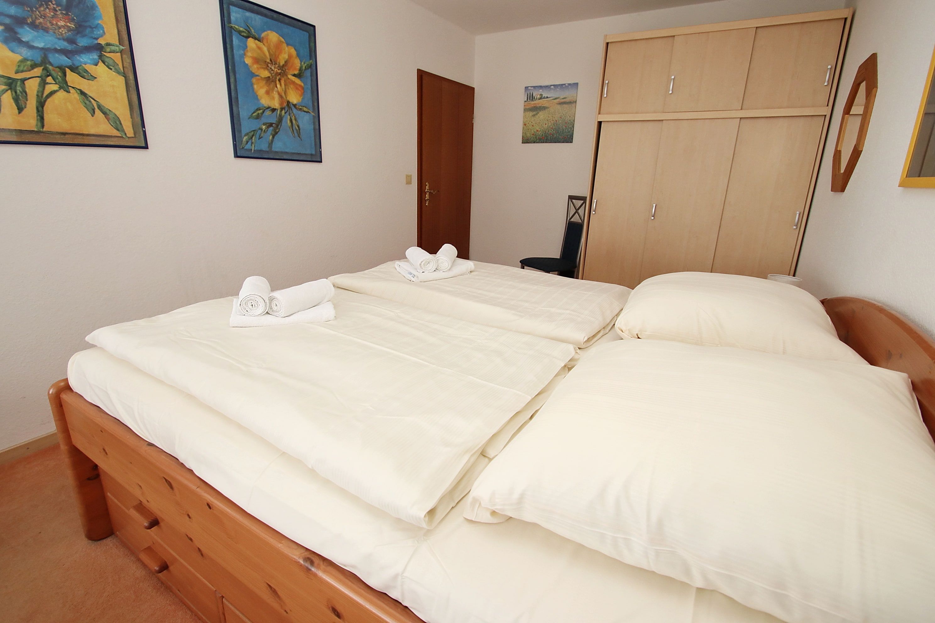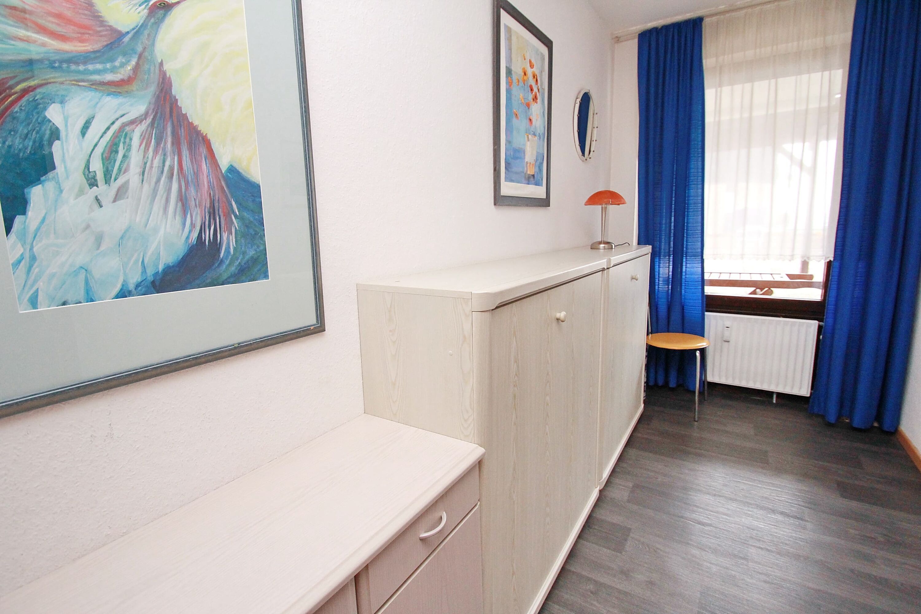 Diese strandnahe, ruhige Ferienwohnung mit tollem Meerblick und freundlicher Ausstattung in der Kaiserallee ist einzigartig. Die ansprechende Wohnung in der 2. Etage erreichen Sie sowohl vom Hauseingang als auch von der Tiefgarage direkt mit dem Aufzug. Das helle Wohnzimmer besteht aus einer Eckcouch mit Tisch und einer schönen Essecke mit Durchreiche und Sichtverbindung zur Einbauküche. Im Schlafzimmer stehen ein bequemes Doppelbett (2x 90 cm x 200 cm) und ein Kleiderschrank. Der kleine Schlafraum ist eingerichtet mit einem Einzelschrankbett (90 cm x 190 cm) und einem Wäscheschrank. Alle Räumlichkeiten sowie das Bad gehen vom Flur ab. Vom Wohn- und Schlafzimmer erreichen Sie die große, sonnige Dachterrasse. Hier genießen Sie den Meerblick und den lebhaften Schiffsverkehr.