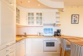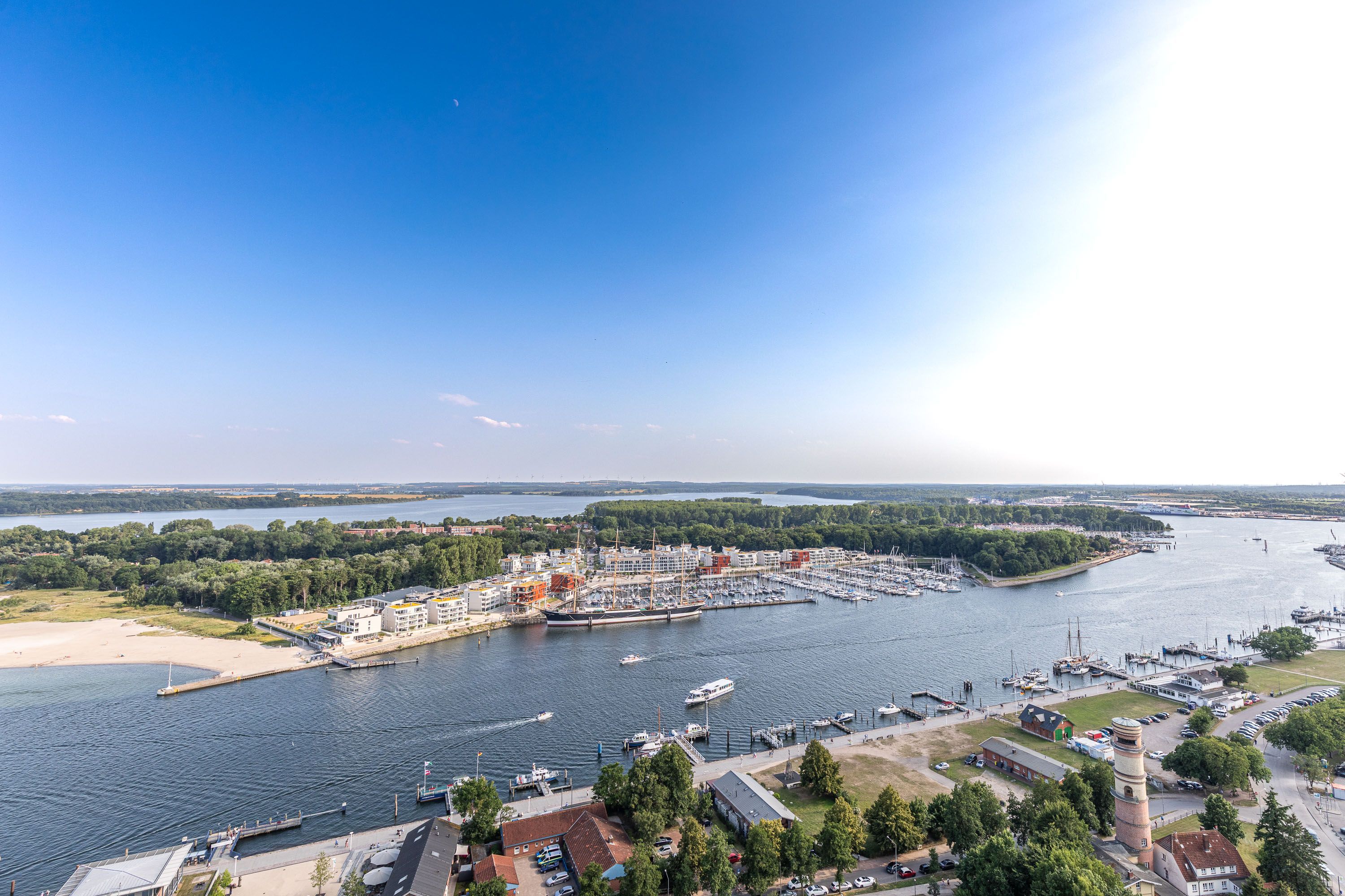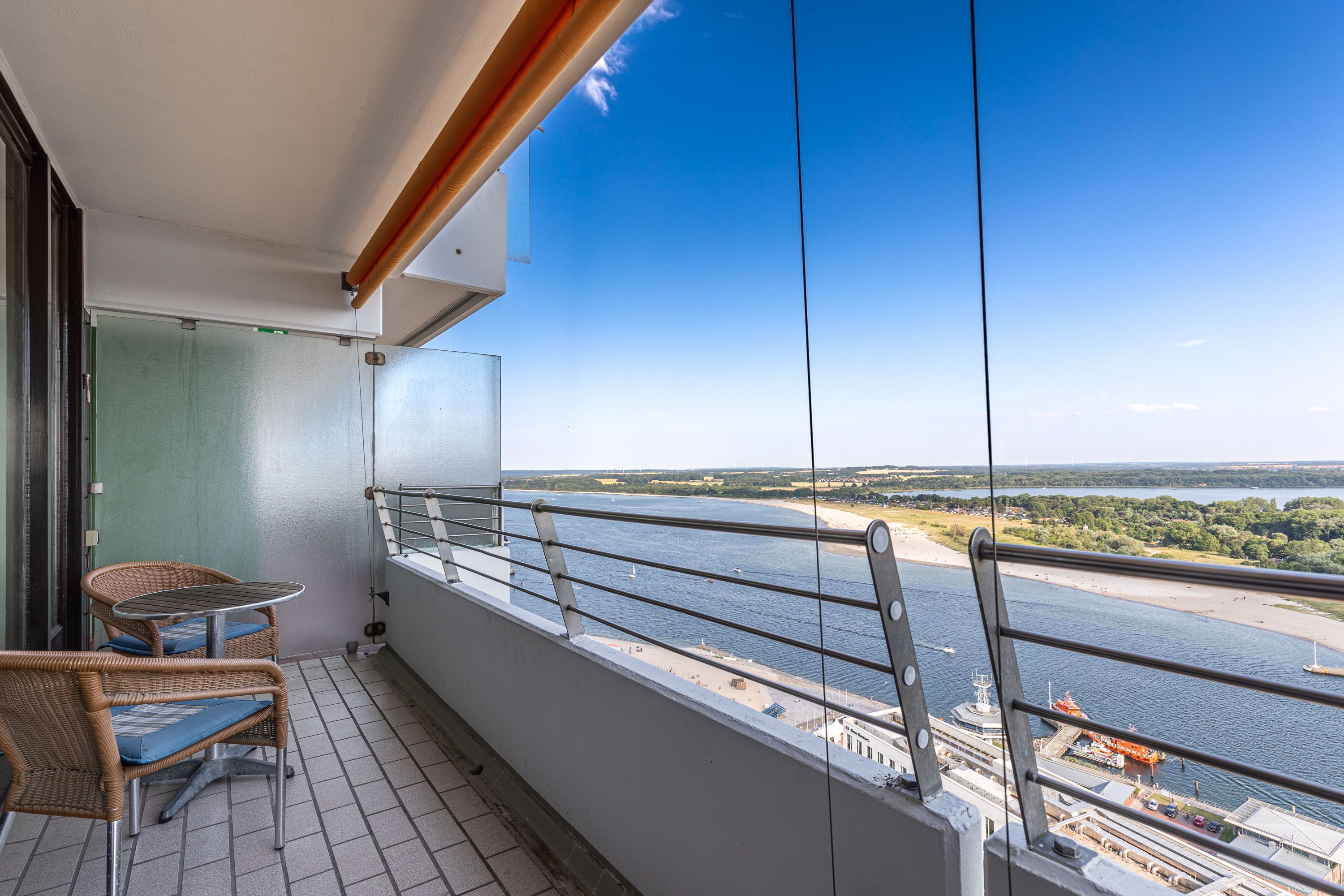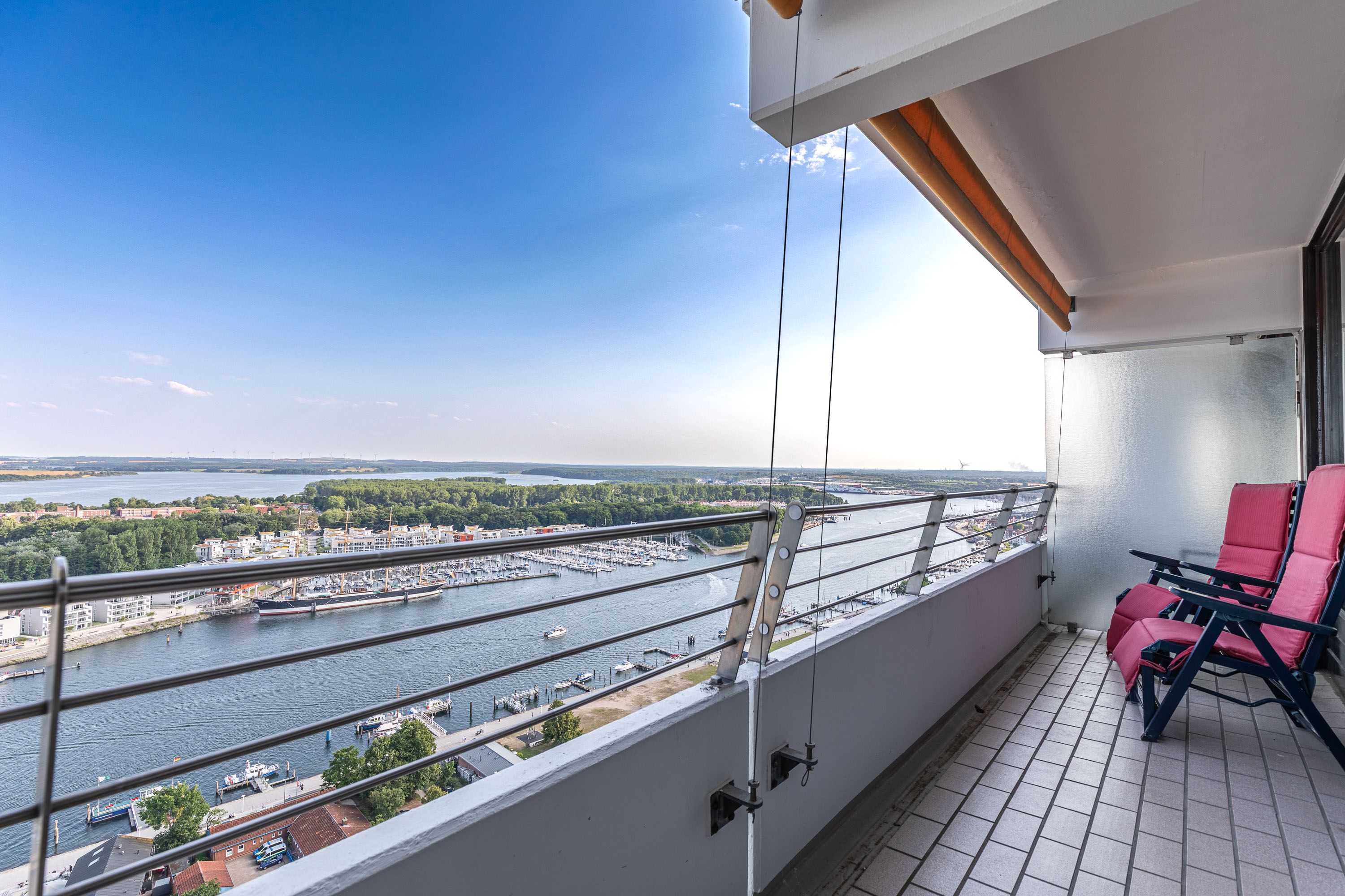 Dieses freundliche Appartement in traumhafter Lage hat eine ausgefallene und angenehme Einrichtung. Im hellen Wohnzimmer erwartet Sie eine offene Einbauküche mit Tresen und maritimen Hochstühlen. In der anderen Wohnraumhälfte befinden sich eine gemütliche zweiteilige Couchgarnitur mit einer Ottomane und einem Beistelltisch vor dem Fenster sowie ein antiker Vitrinenschrank. Im Schlafzimmer stehen ein bequemes Doppelbett (2x 90 cm x 200 cm) und ein schöner Kleiderschrank. Das moderne Bad geht vom Flur ab. Von beiden Wohnräumen haben Sie Zugang zum großen Balkon und genießen hier einen herrlichen Panoramablick direkt auf die Trave mit ein- und ausfahrendem Schiffsverkehr, auf die Lübecker Bucht und zum Hafen.