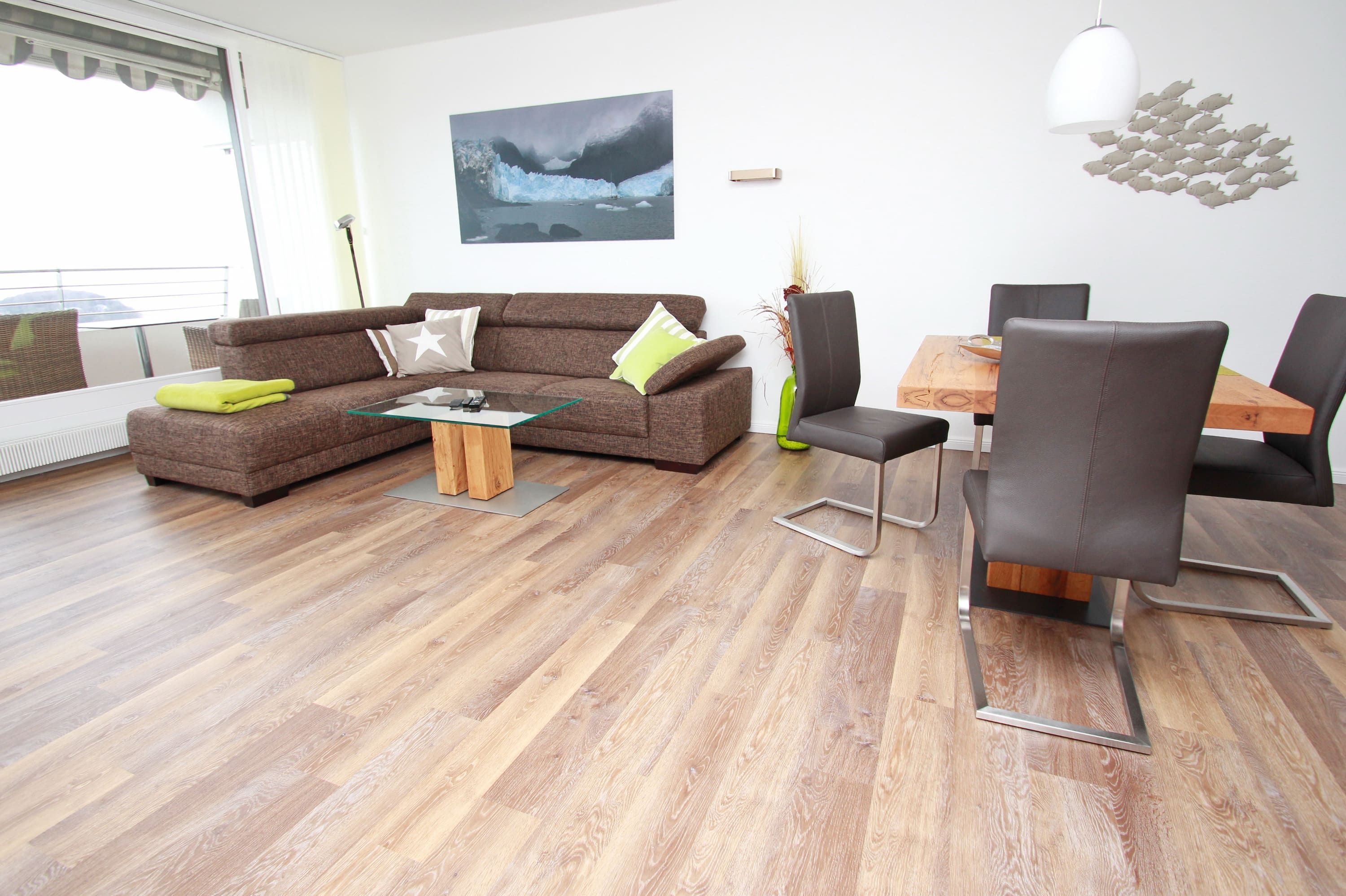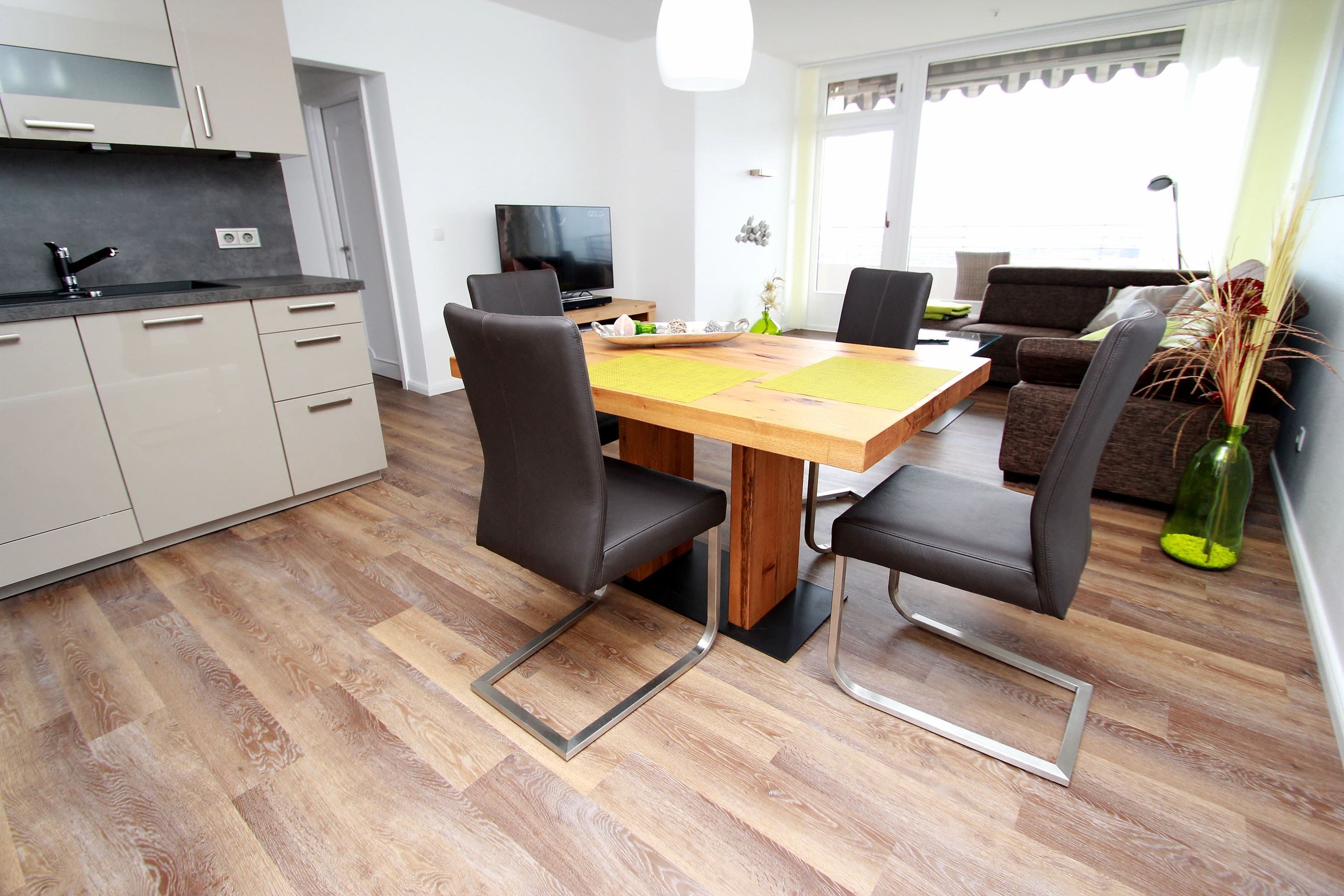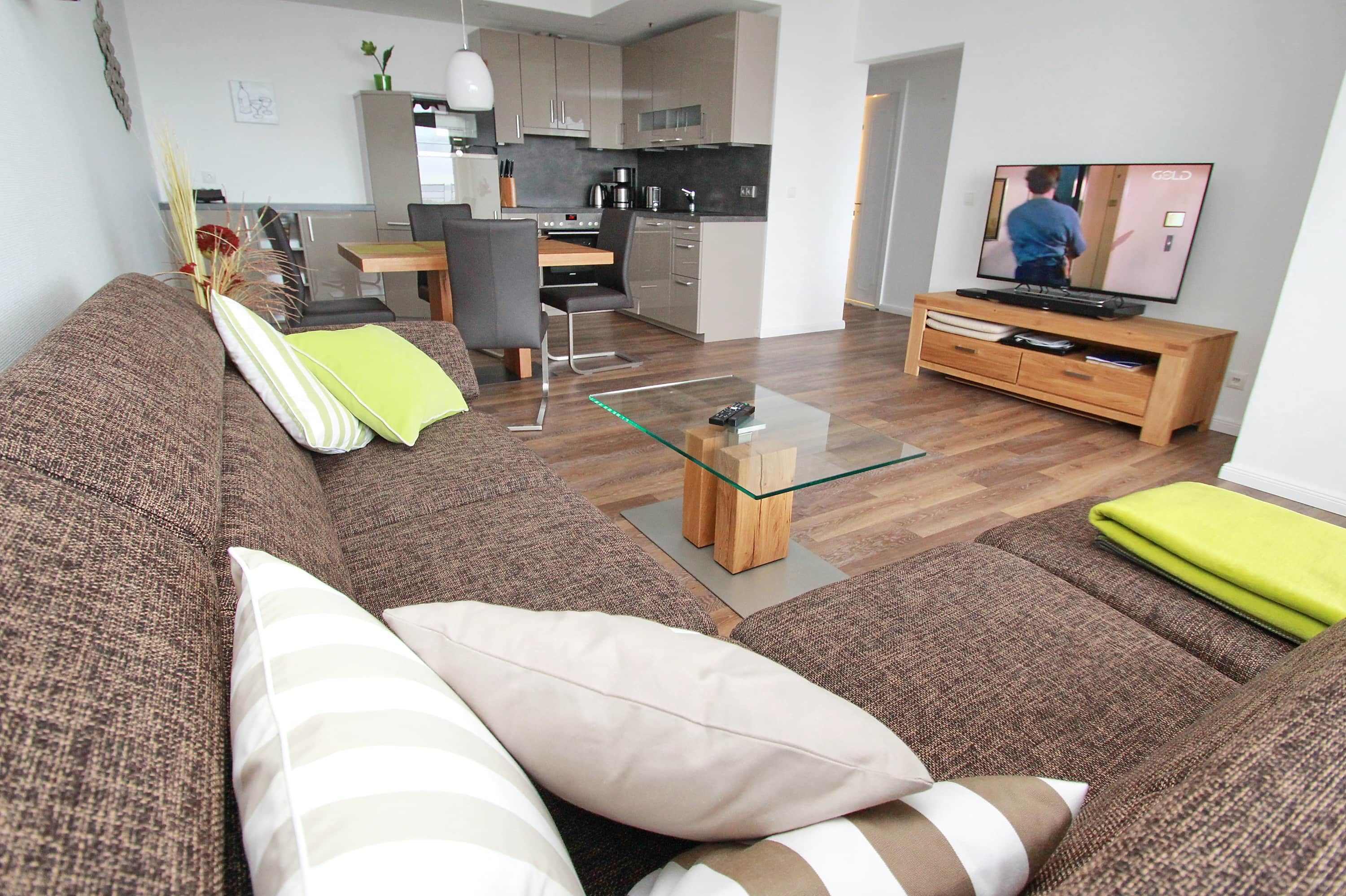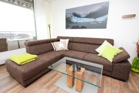 Balkon, Markisen, Küche, Geschirrspüler, Mikrowelle, Duschbad/WC, Fön, TV, DVD, Stereoradio mit CD, kostenl. W-Lan, Aufzug, inkl. Tiefgaragenstellplatz (Einfahrtshöhe: 1,85 m).