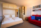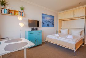 Dieses sehr modern und exklusiv ausgestattete Appartement gehört zur gehobenen Kategorie. Der in schönen, warm abgestimmten Farben eingerichtete Wohnraum ist mit einer Glastür zur Küchenzeile und separat abgehendem, hellen Bad im Flur getrennt. Ausgestattet ist der Wohnbereich mit einer bequemen Couch mit Tisch und einer Essecke mit zwei Sesseln direkt vor dem Fenster. Des Weiteren besteht die Einrichtung aus einer Kommode, einem komfortablen Doppelschrankbett (2x 80 cm x 200 cm) sowie einem Kleiderschrank mit integrierter Glasvitrine. Geschmackvolle Accessoires verleihen diesem Appartement ein besonderes Ambiente. Vom Balkon genießen Sie einen tollen Blick auf die Ostsee, die Strandpromenade und die Lübecker Bucht.