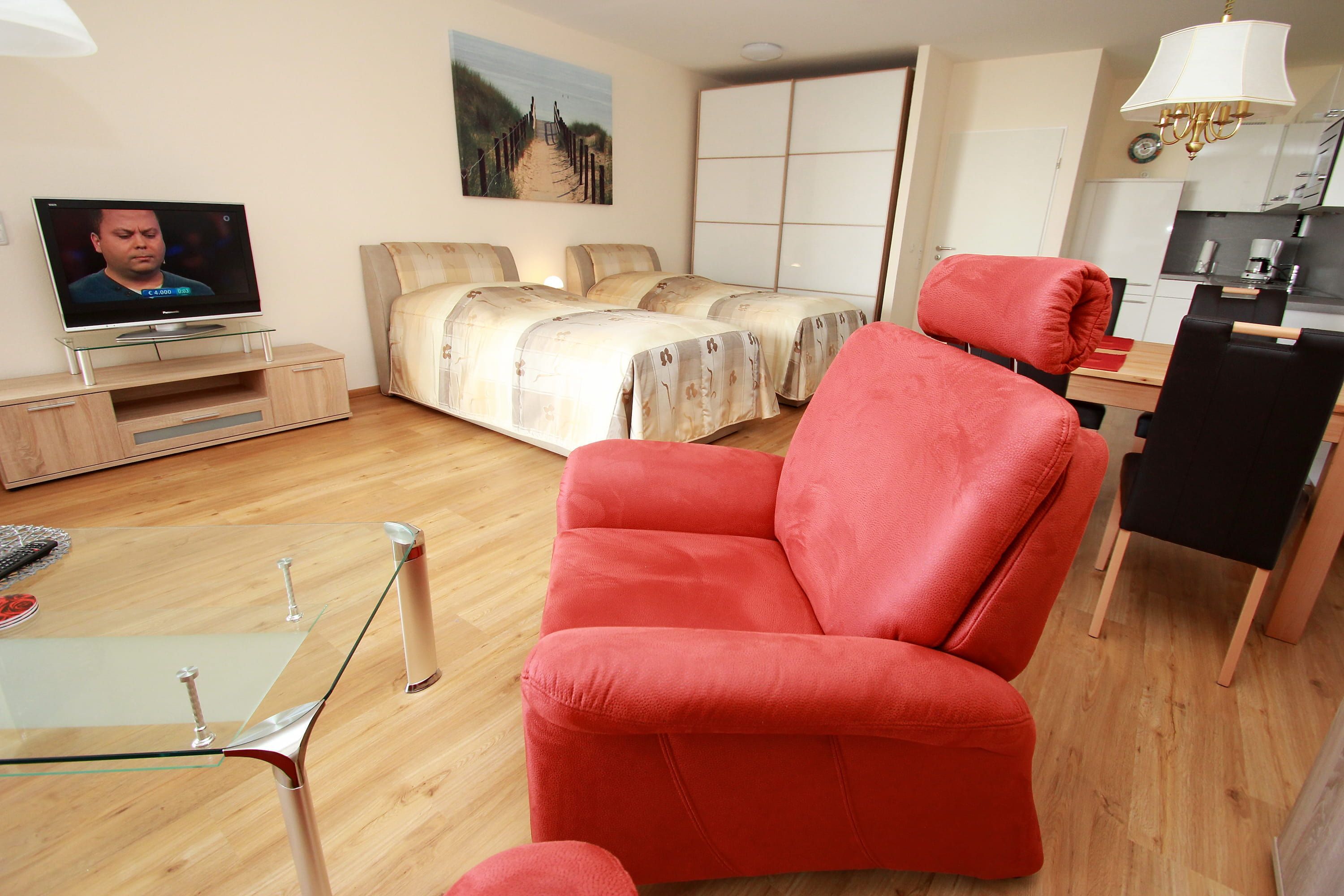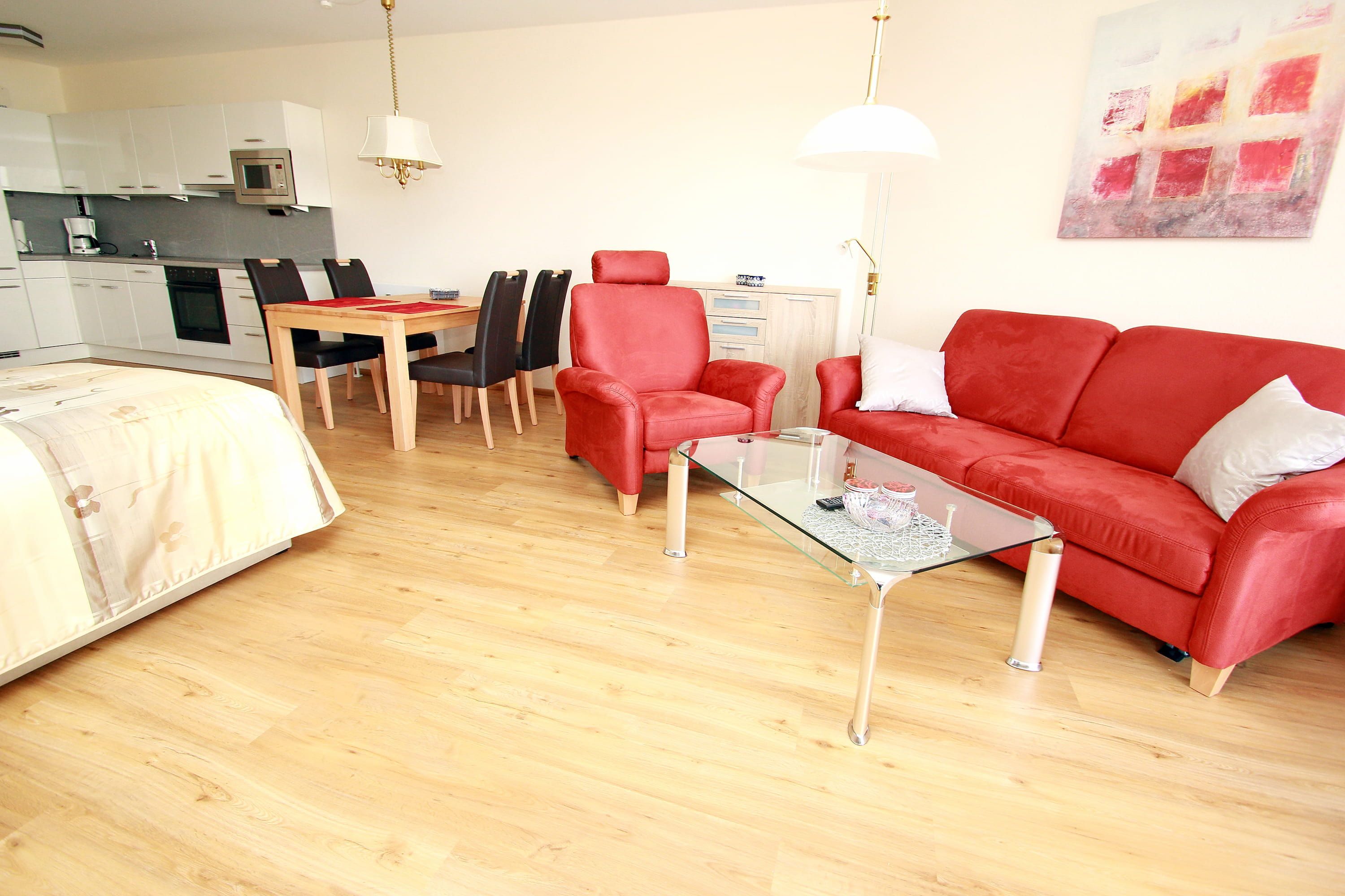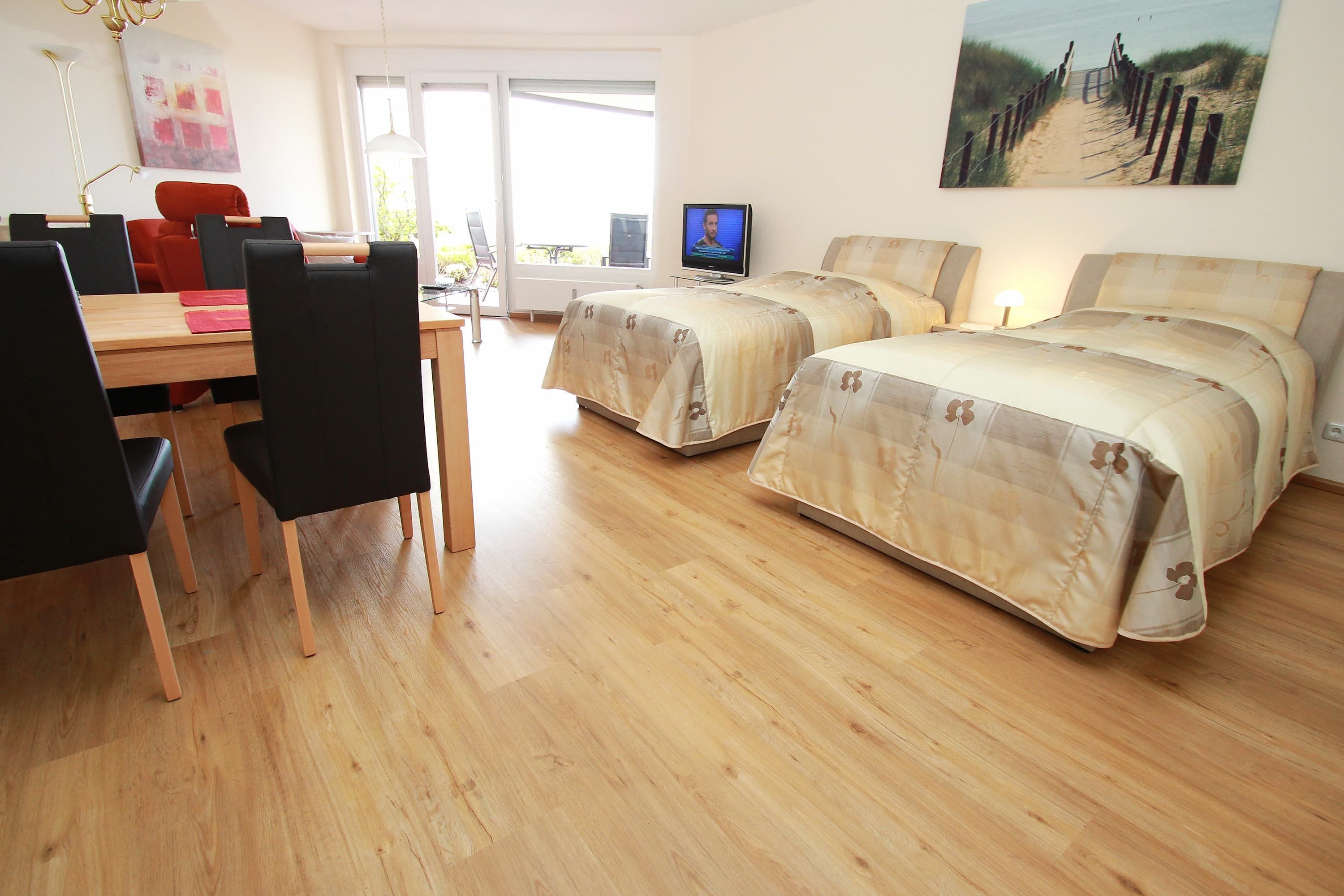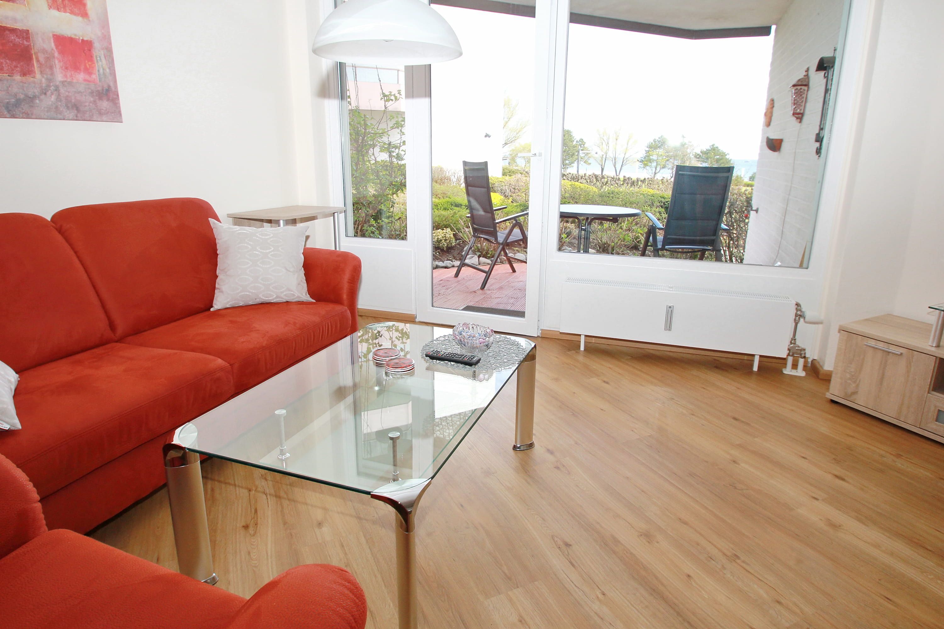 Dieses empfehlenswerte, hochwertige Appartement mit günstigen Übernachtungspreisen hat eine exklusive Ausstattung und lädt von Anfang an zum Wohlfühlen ein. Vom Wohnungseingang gelangen Sie in den Flur mit Garderobe, vom dem das helle, moderne Duschbad abgeht. Weiter geht es zum gemütlichen Wohnraum, wo Sie links eine offene Küche und eine Essecke vorfinden. Des Weiteren stehen im Wohnraum eine bequeme zweiteilige Couchgarnitur mit Tisch sowie zwei schöne Einzelbetten (je 100 cm x 200 cm) und ein Kleiderschrank. Auf der Terrasse genießen Sie zu jeder Jahreszeit den herrlichen Meerblick und können das beschauliche Spiel der Segelboote im Wind beobachten.