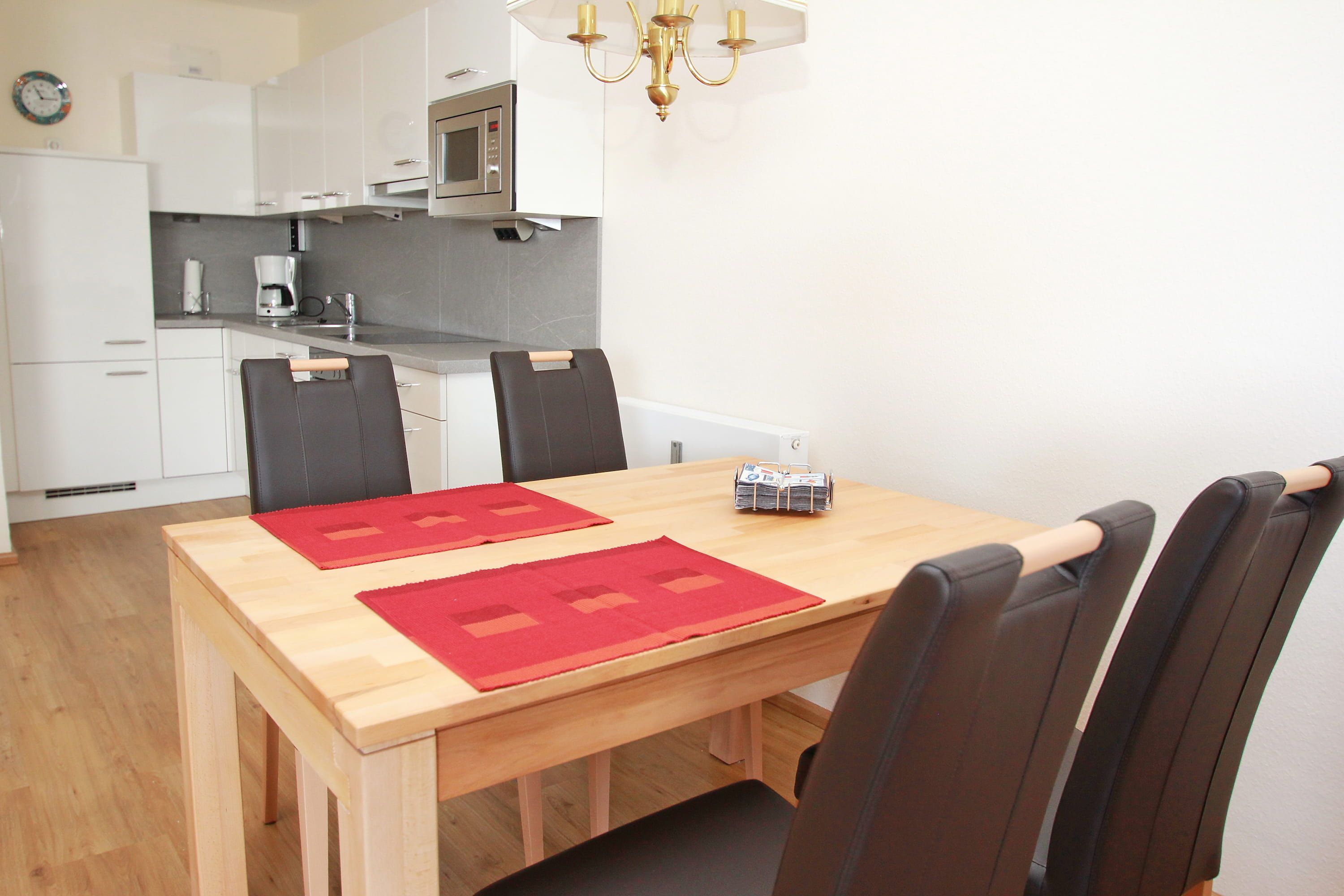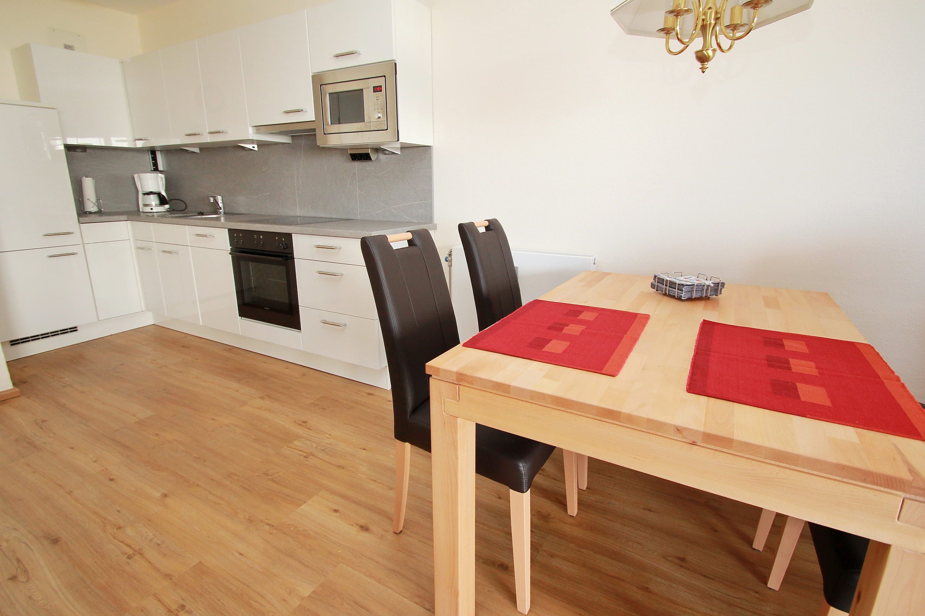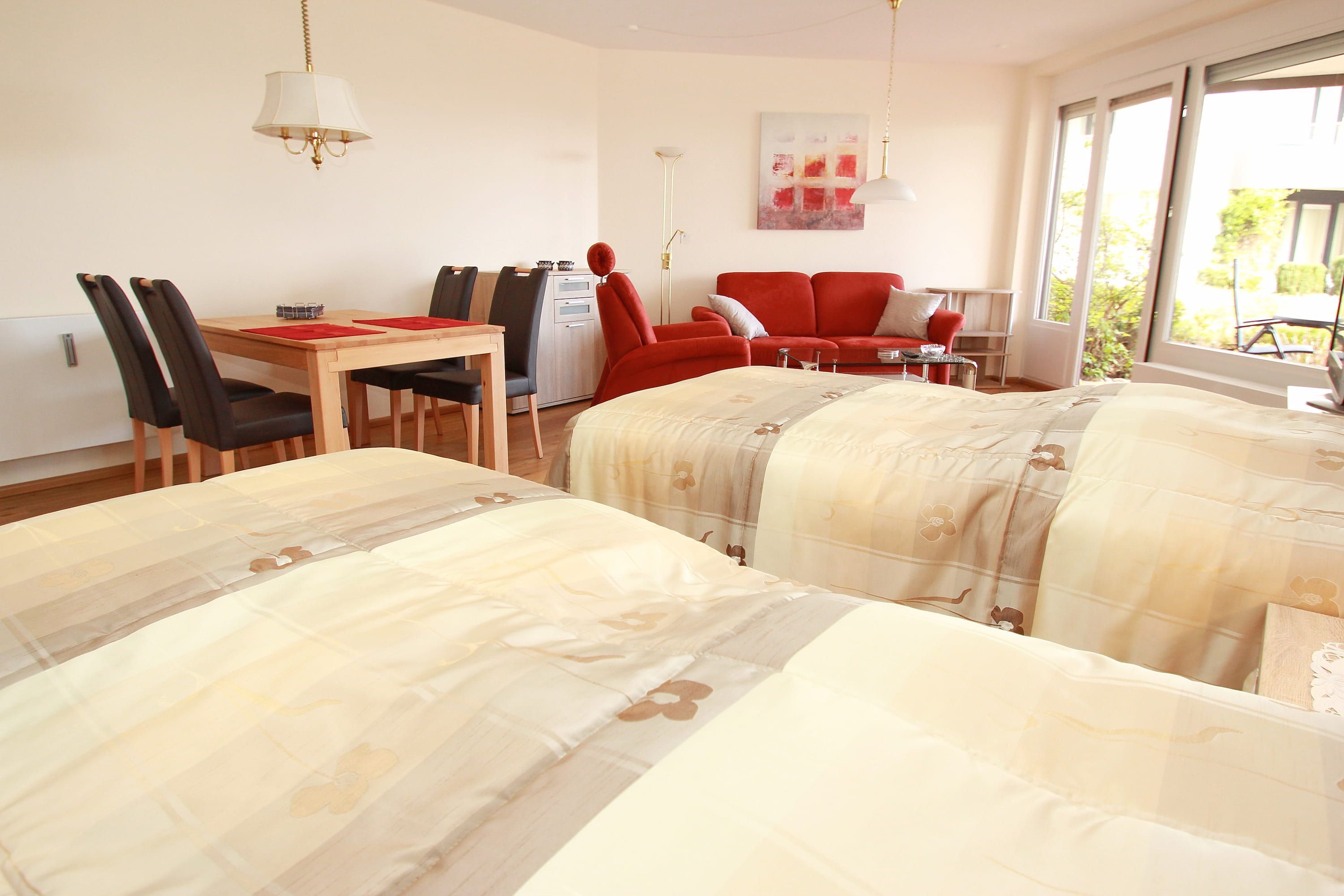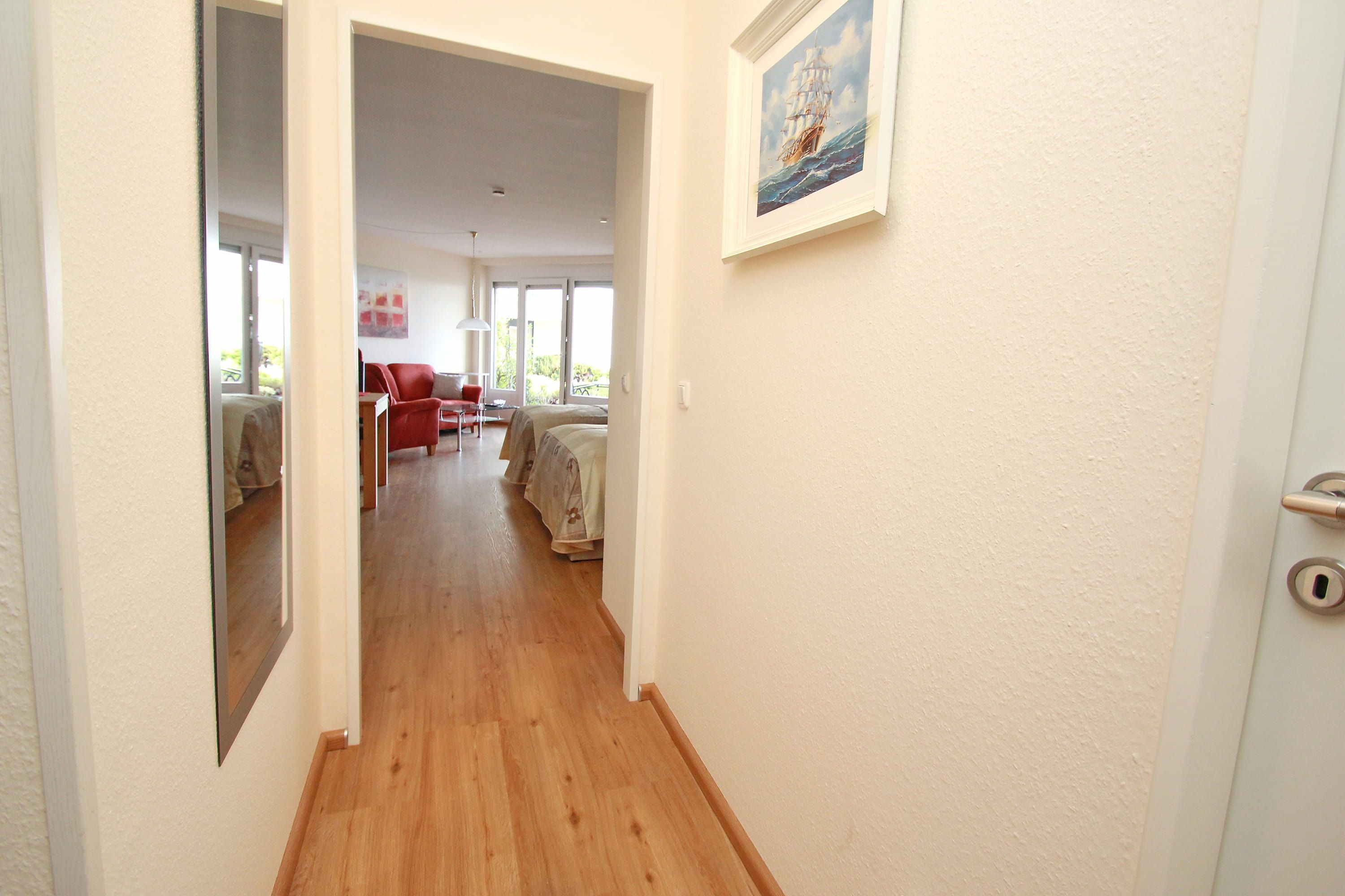 Dieses empfehlenswerte, hochwertige Appartement mit günstigen Übernachtungspreisen hat eine exklusive Ausstattung und lädt von Anfang an zum Wohlfühlen ein. Vom Wohnungseingang gelangen Sie in den Flur mit Garderobe, vom dem das helle, moderne Duschbad abgeht. Weiter geht es zum gemütlichen Wohnraum, wo Sie links eine offene Küche und eine Essecke vorfinden. Des Weiteren stehen im Wohnraum eine bequeme zweiteilige Couchgarnitur mit Tisch sowie zwei schöne Einzelbetten (je 100 cm x 200 cm) und ein Kleiderschrank. Auf der Terrasse genießen Sie zu jeder Jahreszeit den herrlichen Meerblick und können das beschauliche Spiel der Segelboote im Wind beobachten.