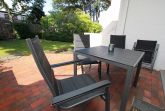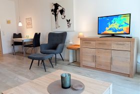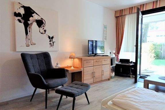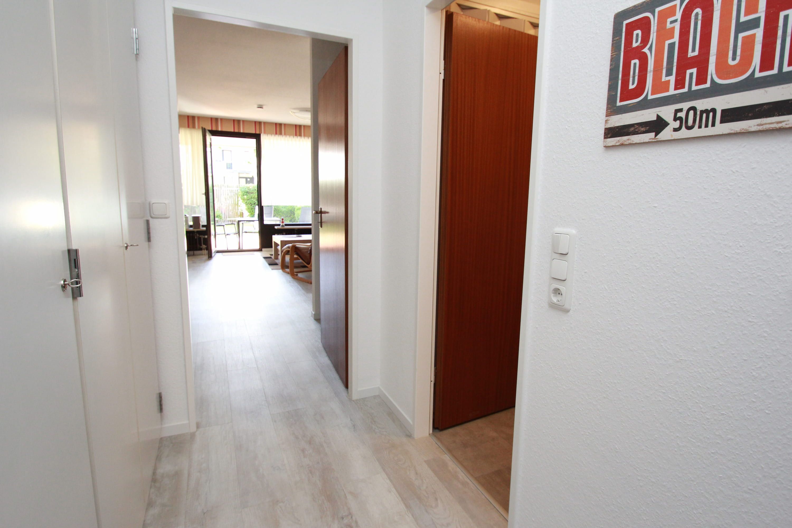 In einer gepflegten, ruhigen Wohnanlage erwartet Sie hier ein sehr schönes Appartement mit viel Komfort für Ihren Urlaub in strandnaher Lage. Der helle, gemütliche Wohnbereich besteht aus einer bequemen Couch mit einem Relaxsessel und einem Tisch. Des Weiteren befinden sich daneben eine Anrichte sowie zwei Einzelschrankbetten (je 90 cm x 190 cm). Gegenüber der Einbauküche steht eine schöne Essecke. Das neuwertige Bad geht separat vom Flur mit Garderobenschrank ab. Durch die Balkontür geht es zur großen, sonnigen Terrasse mit Gartenmöbeln. Hier genießen Sie die frische Seeluft und schauen in die gepflegte Grünanlage. Rundum ein Appartement zum Wohlfühlen.