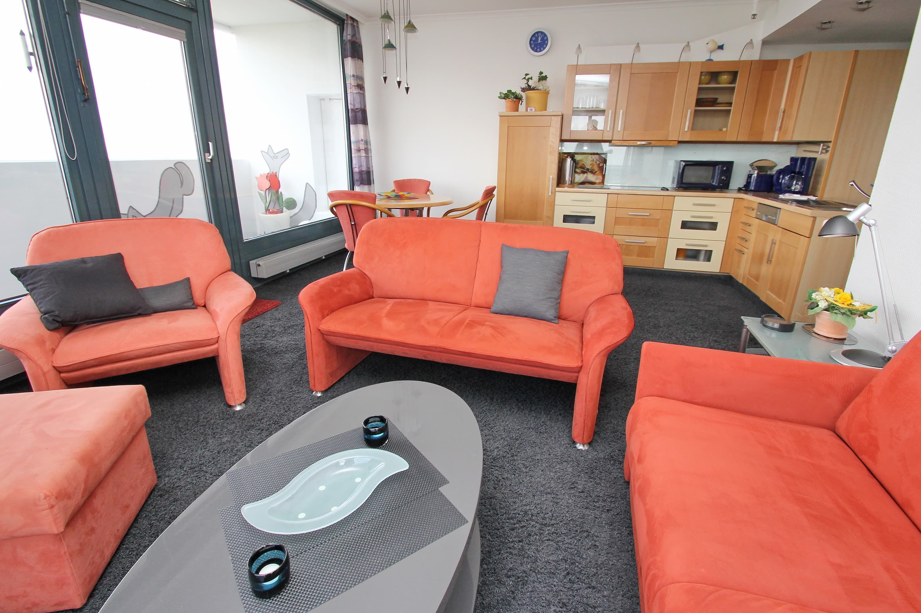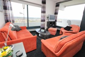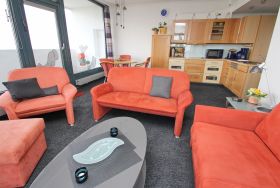 Umlaufende Loggia von ca. 21 m², Markise, Küche, Geschirrspüler, Mikrowelle, Duschvollbad/WC, Fön, 2x TV, Stereoanlage, Telefon, kostenl. W-Lan, Aufzug, inkl. Tiefgaragenstellplatz (Einfahrtshöhe: 1,85 m).