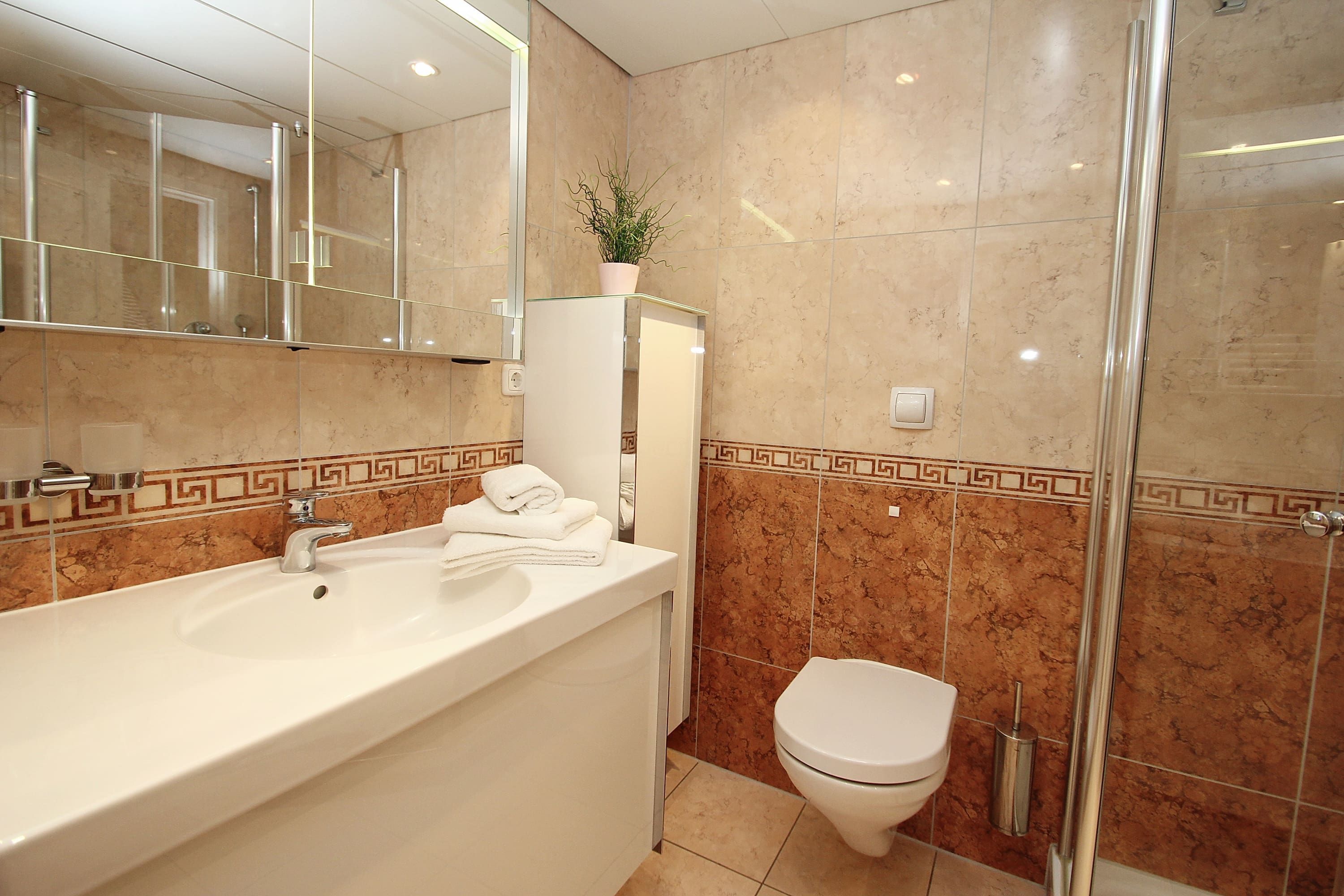 Umlaufende Loggia von ca. 50 m², Küche, Geschirrspüler, Mikrowelle, Duschbad/WC, Vollbad/WC, 2x Fön, Waschmaschine mit Trockner, 3x TV, Stereoanlage, Telefon, kostenl. W-Lan, Aufzug, inkl. 2 Tiefgaragenstellplätzen (Einfahrtshöhe 1,85 m).