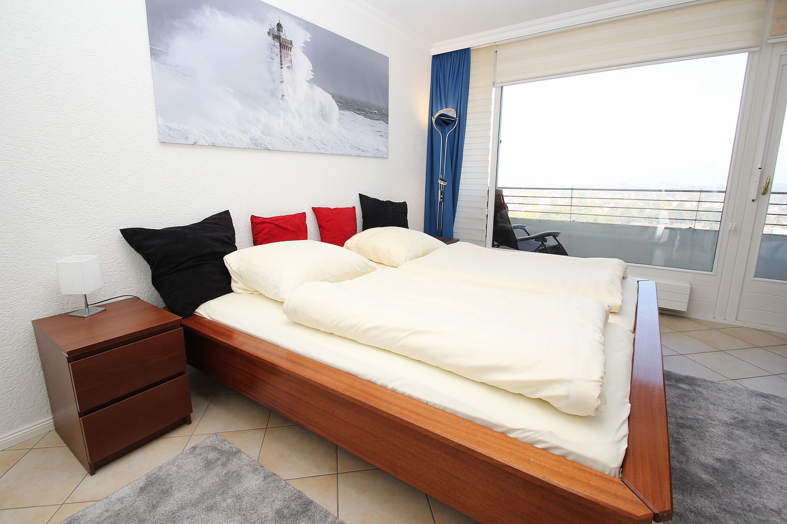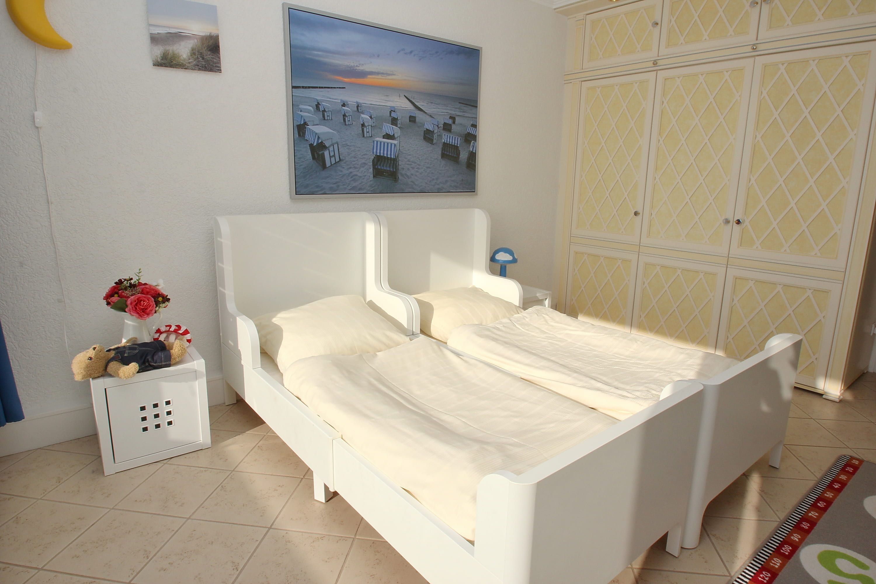 Es erwartet Sie ein extravagantes Feriendomizil der Spitzenklasse, das aus zwei großen Eck-Appartements besteht, ideal für Ihren Familienurlaub oder das Familientreffen. Der Wohnbereich auf der Meerseite beinhaltet eine zweiteiligen Couchgarnitur mit Tisch, zwei Sesseln und einer schönen Kommode. Außerdem befinden sich hier ein luxuriöses Duschbad und zwei Schlafzimmer. Eines ist mit einem Doppelbett (2x 100 cm x 200 cm) und einem Einbaukleiderschrank ausgestattet, das weitere mit einem Doppelbett (160 cm x 200 cm) und einem Einbaukleiderschrank. Auf der Traveseite befinden sich eine moderne Einbauküche, ein großzügiger Essbereich und zwei Schlafzimmer. Eines ist mit einem Doppelbett (2 x 90 cm x 200 cm) und einem Einbaukleiderschrank ausgestattet, das weitere mit zwei längenverstellbaren Kinderbetten (je 80 cm x max. 180 cm) und einem Einbaukleiderschrank. Ein weiteres Bad ergänzt die schöne Wohneinheit. Auf den großen Eckbalkonen zur Ostsee und zur Trave genießen Sie den einmaligen Panoramablick.