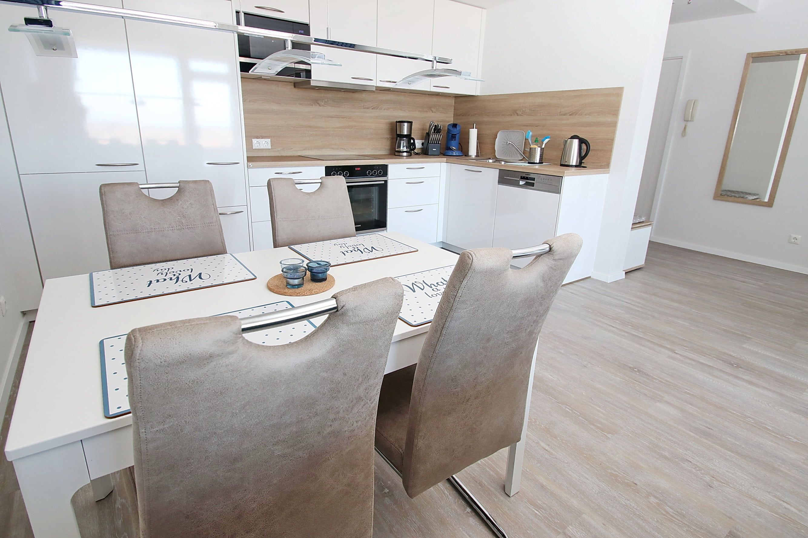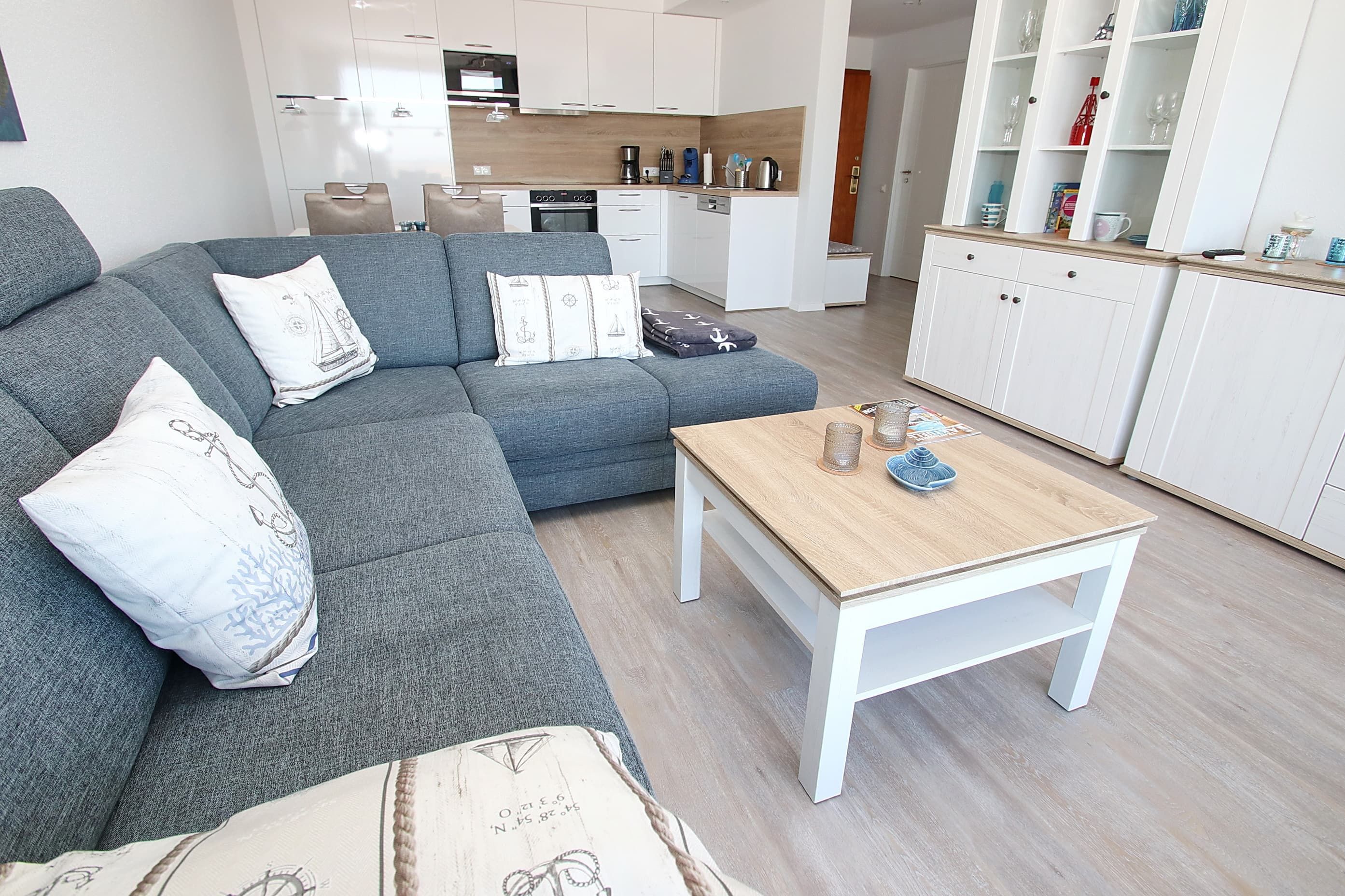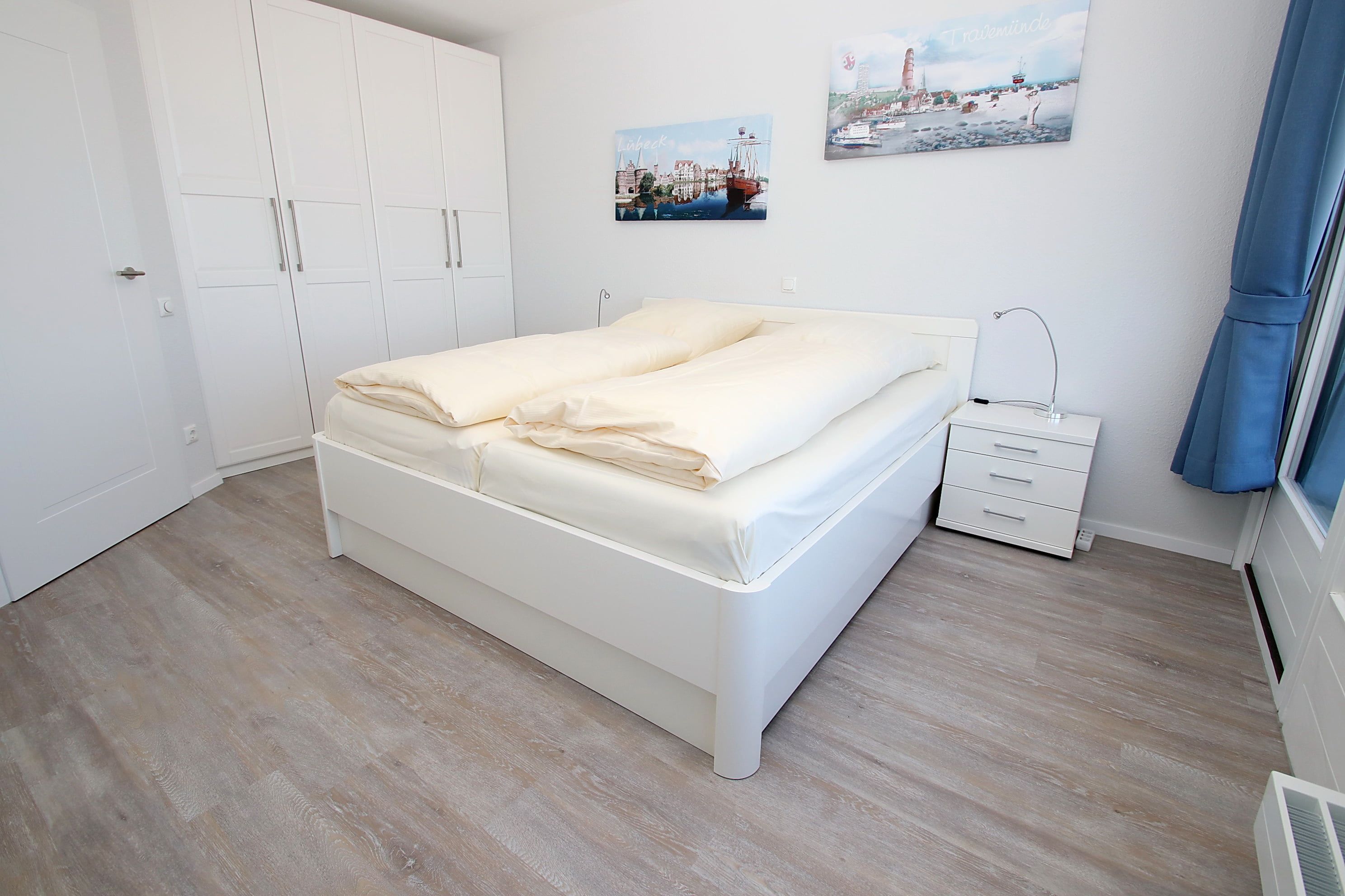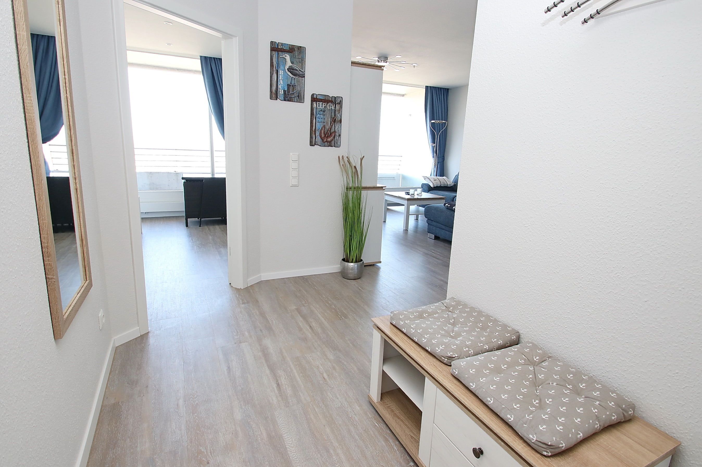 Direkt am Strand erwartet Sie hier ein modernes, im maritimen Stil möbliertes 2-Zimmer-Appartement mit allem Komfort zum Wohlfühlen. Im Wohnraum befinden sich eine gemütliche Eckcouch mit einem Couchtisch sowie ein Esstisch mit vier Stühlen. Dank der gut ausgestatteten Küchenzeile, die sich ebenfalls im Wohnraum befindet, können Sie entscheiden, ob Sie selber kochen oder sich durch die kulinarische Küche Travemündes schlemmen möchten. Im Schlafzimmer stehen ein bequemes Doppelbett (2x 90 cm x 200 cm) und ein Kleiderschrank. Das Duschbad, das Sie vom Flur erreichen, ist in warmen Farben gehalten. Die sehr geschmackvoll eingerichtete Wohneinheit lässt keine Wünsche offen und lädt zu einem wunderschönen Urlaub an der Ostsee ein. Den großen Balkon erreichen Sie von beiden Zimmern. Hier genießen Sie einen fantastischen Blick auf den Strand und die Lübecker Bucht.