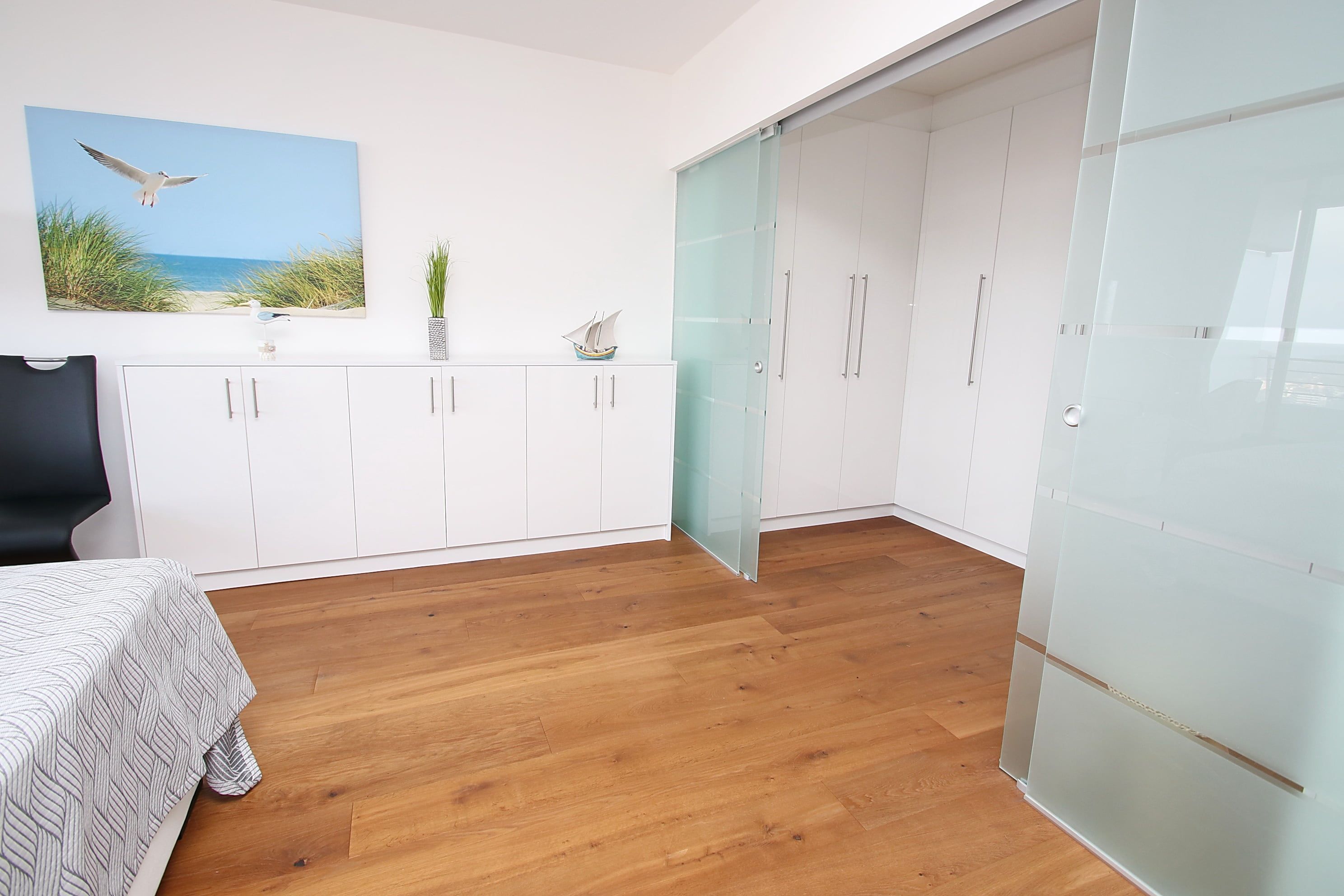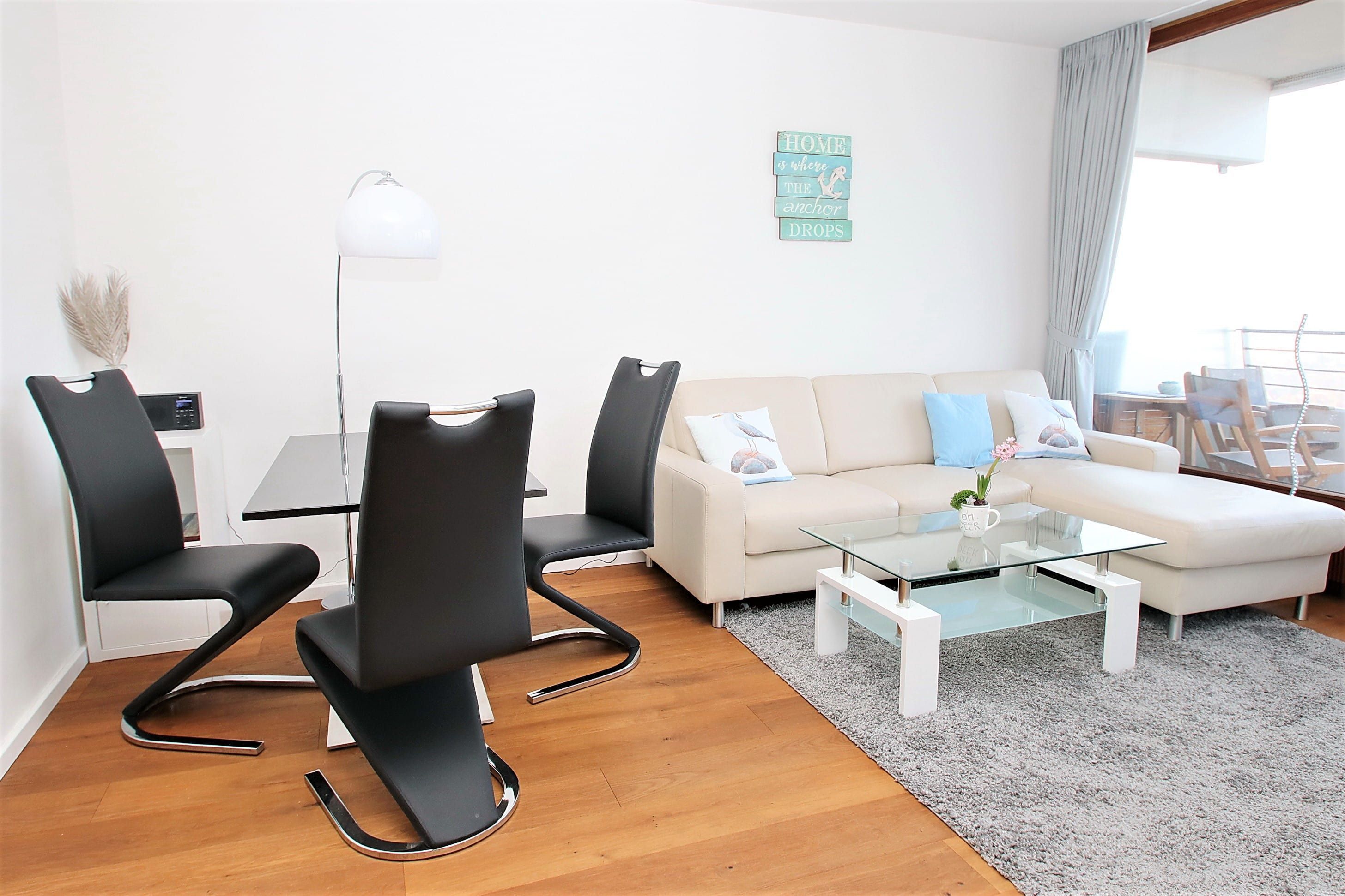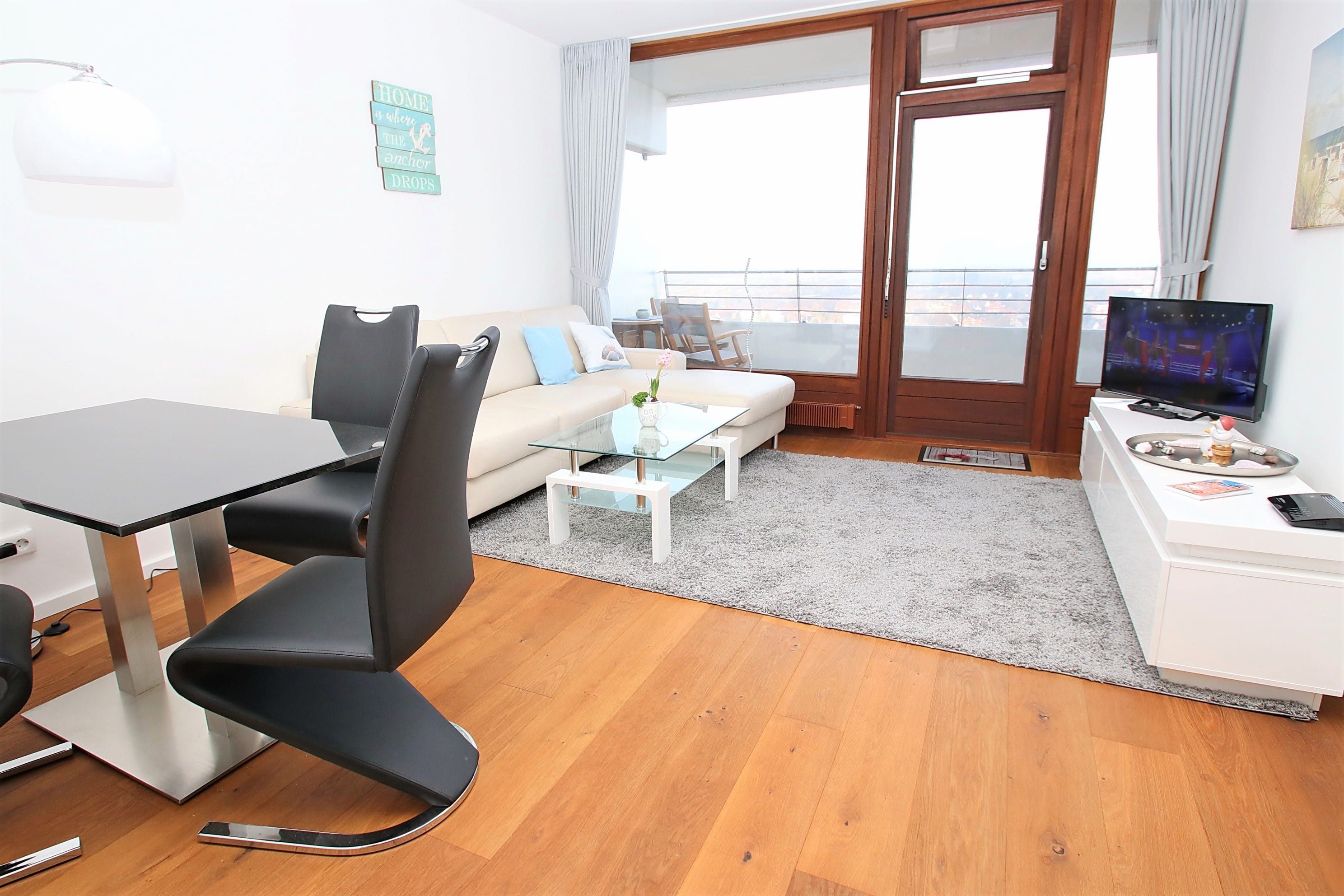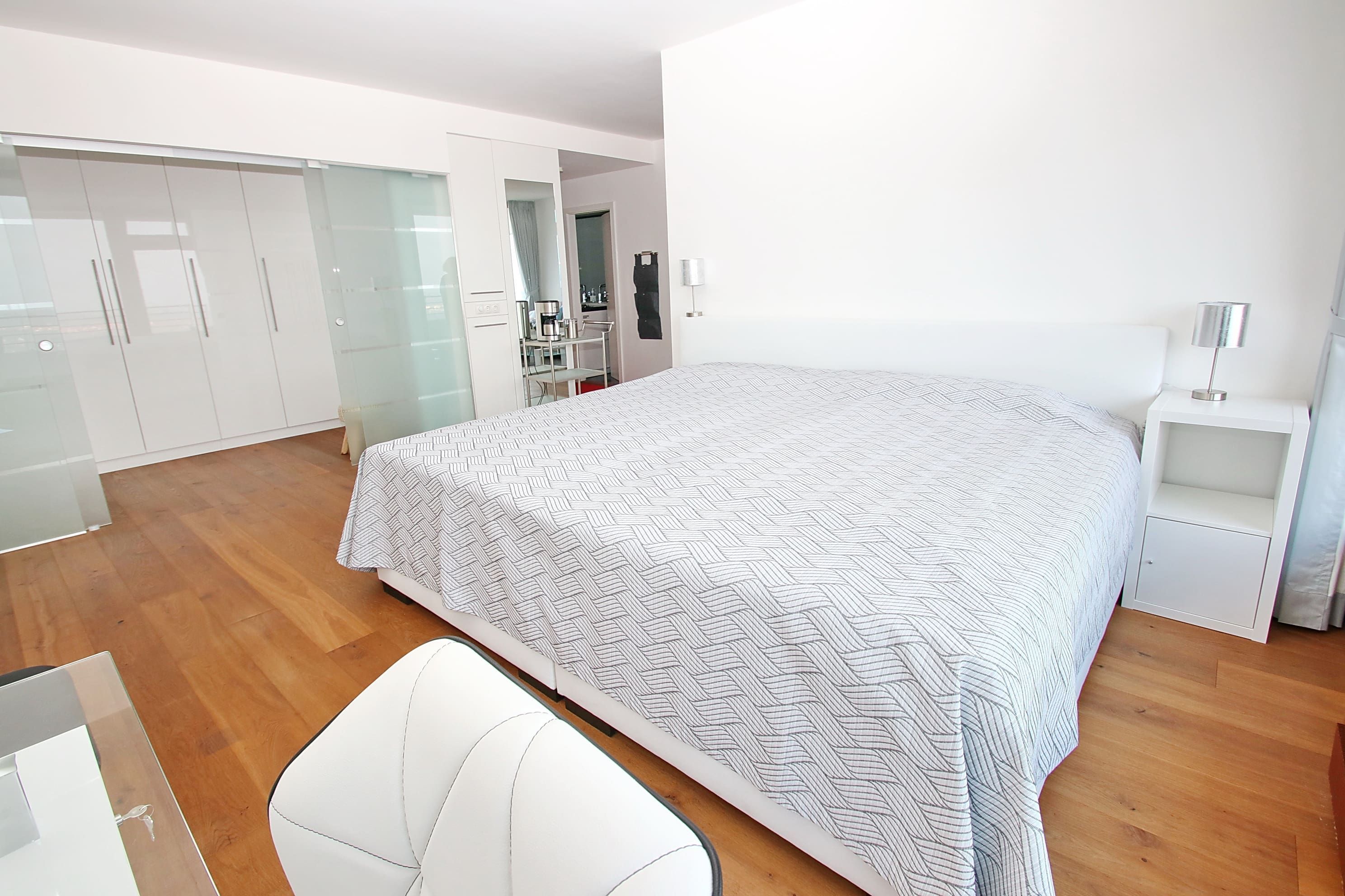 Dieses luxuriös und offen gestaltetes 2-Zimmer-Appartement mit allem Komfort zum Wohlfühlen, liegt direkt am Strand. Im hellen Wohnraum befinden sich eine gemütliche Eckcouch mit einem Couchtisch und eine schöne Essecke. Das elegante, offene Schlafzimmer ist mit einem schicken Sekretär und einem extra breiten Boxspringbett (240 cm x 200 cm) eingerichtet, für das ein Bettlaken von dem Eigentümer gestellt wird. Von hier aus erreichen Sie den großen und begehbaren Kleiderschrank. Die modern gestaltete Küche, die sich durch geschickte Abdeckungen nicht direkt als solche erkennen lässt, ist im Eingangsbereich integriert. Genau gegenüber gelangen Sie in das modern Badezimmer. Vom Wohn- und Schlafzimmer erreichen Sie den großen Balkon, um den traumhaften Ausblick auf die Ostsee, die Strandpromenade und die Lübecker Bucht zu genießen.