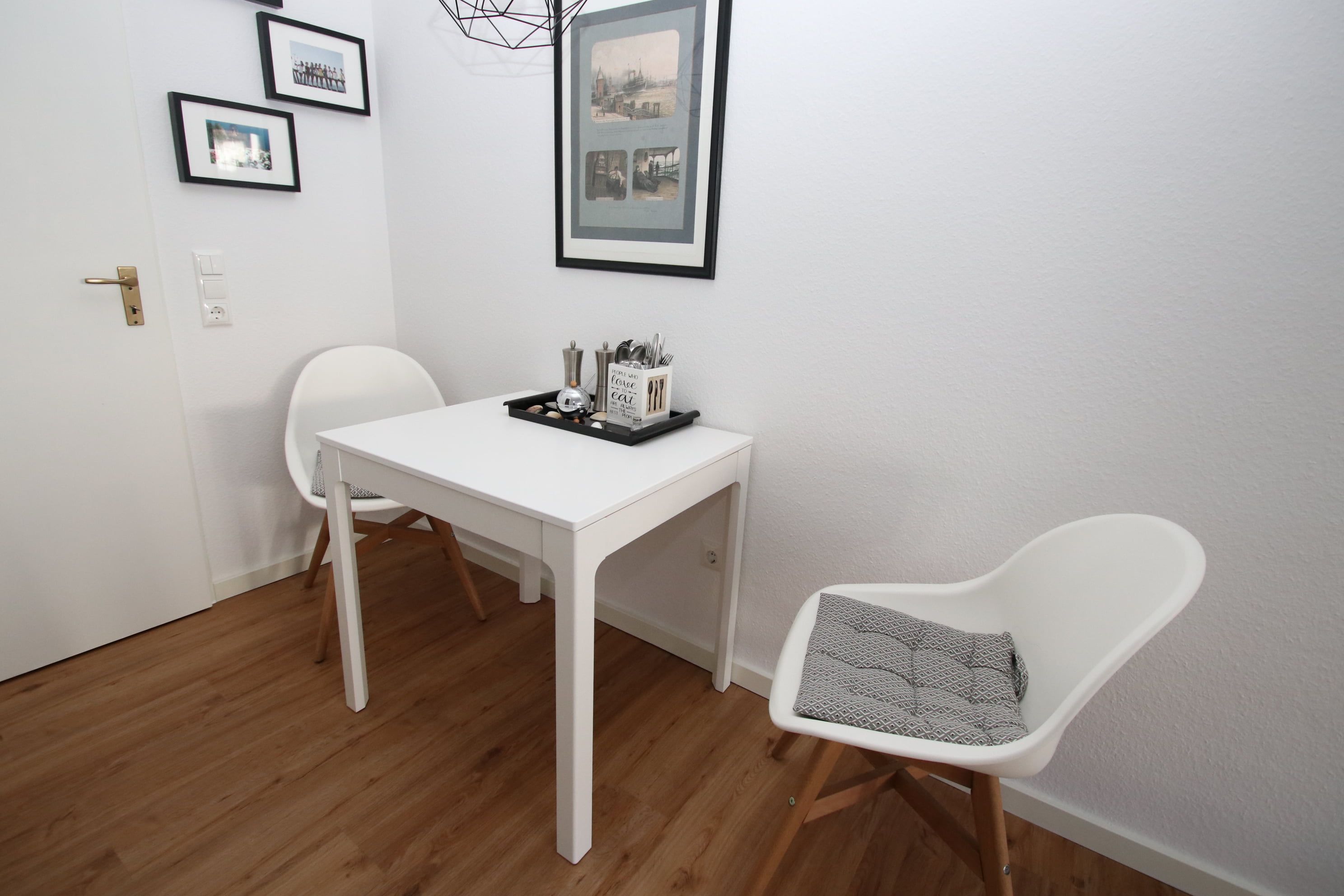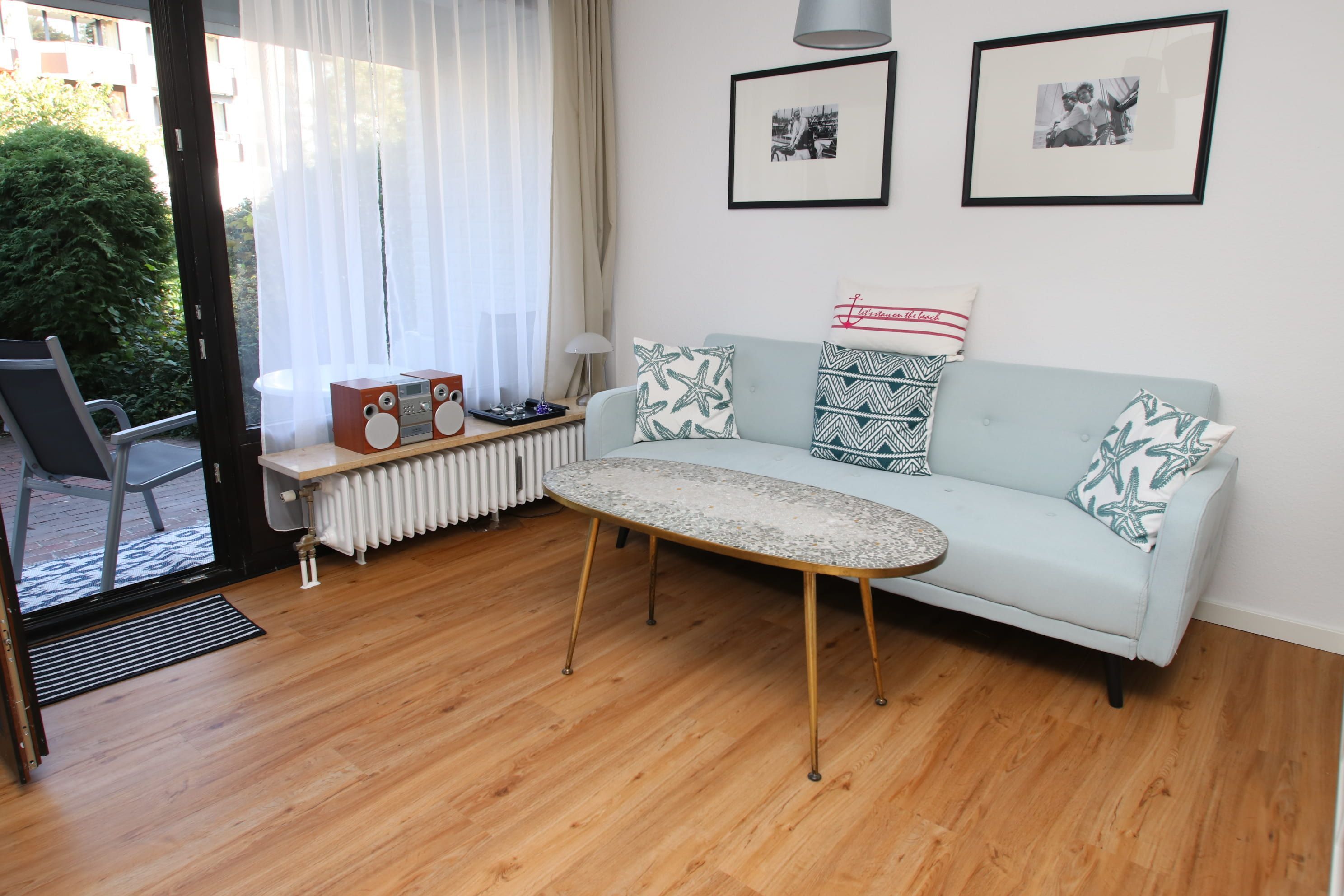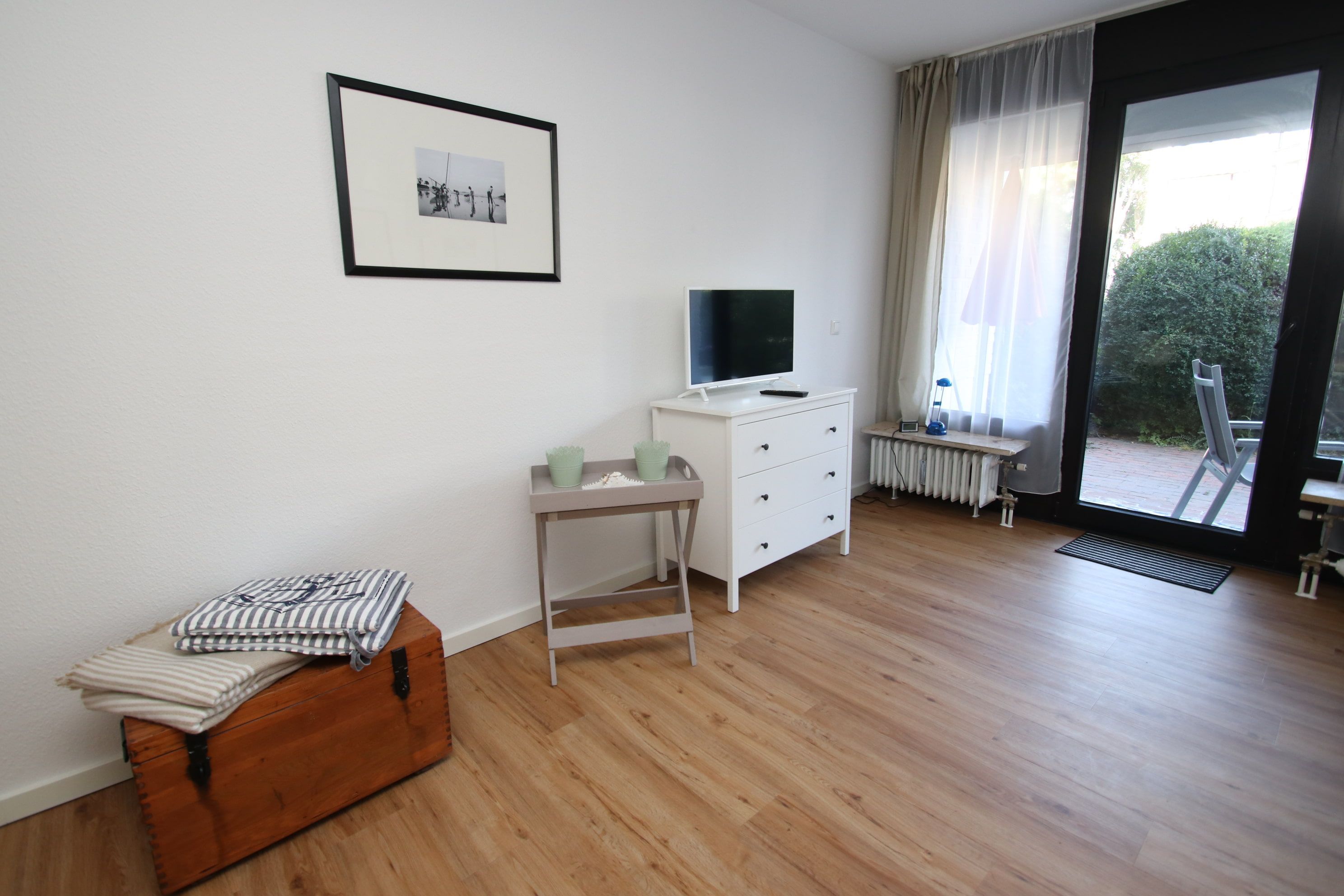Dieses maritim eingerichtet Appartement liegt sehr Strandnah und lädt zum Wohlfühlen ein. Im Wohnraum befinden sich eine gemütliche Couch mit Tisch, eine Anrichte und ein komfortables Doppelbett (180 cm x 200 cm). Gegenüber der modernen & separaten Küche steht eine Essecke. Im Flurbereich, von dem das helle Bad abgeht, finden Sie einen Kleiderschrank vor. Die sonnige Terrasse mit Blick in die Grünanlage lädt zum Verweilen ein.