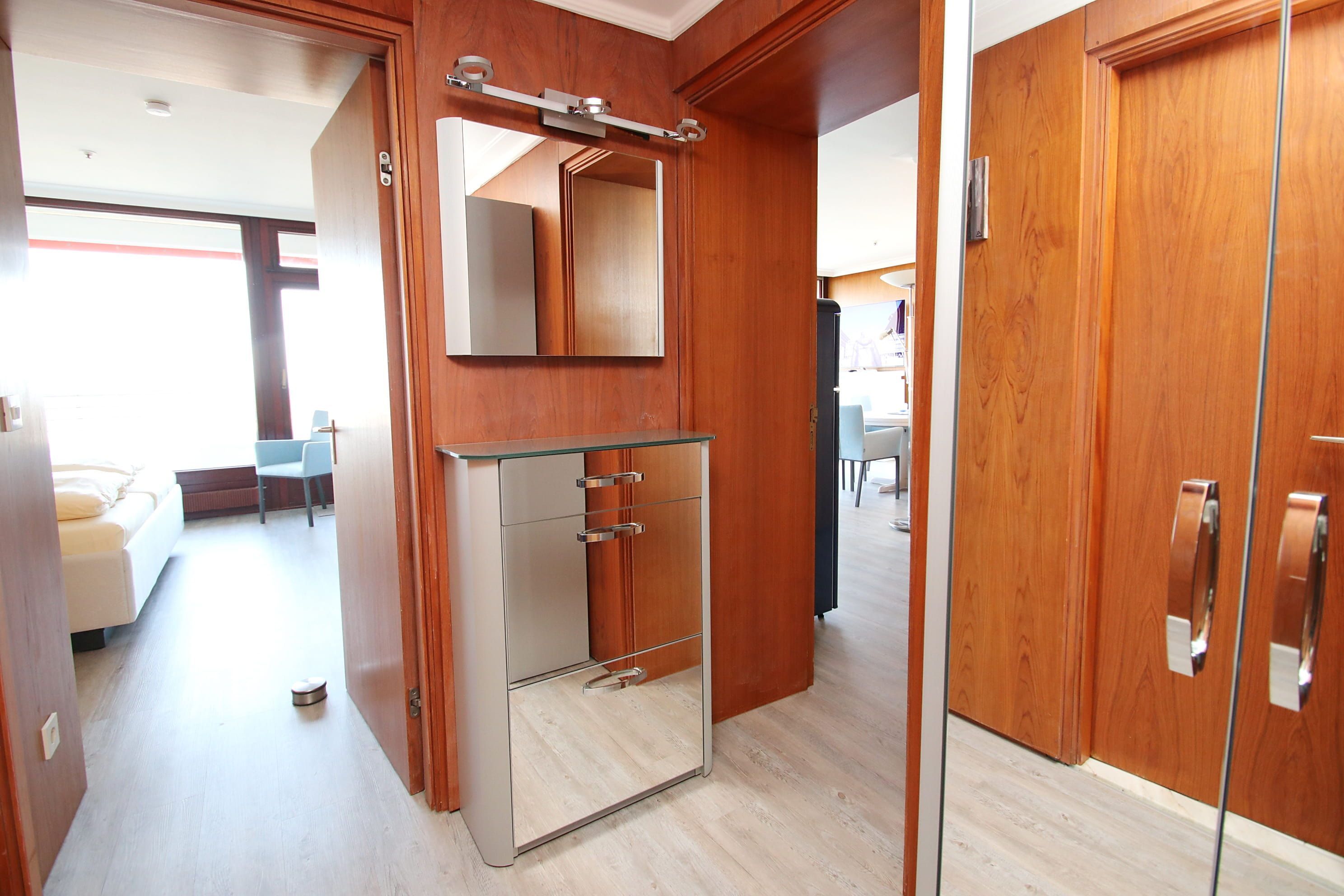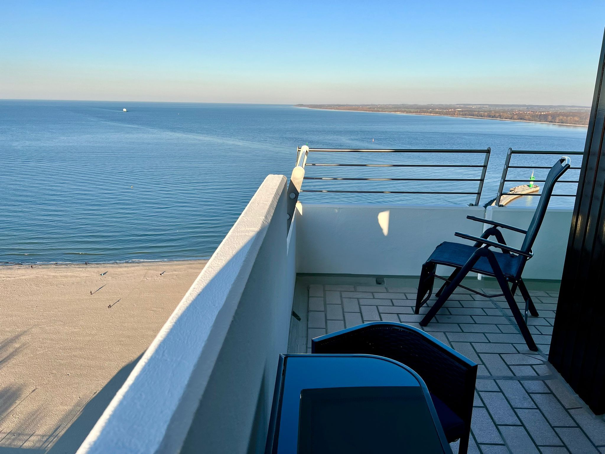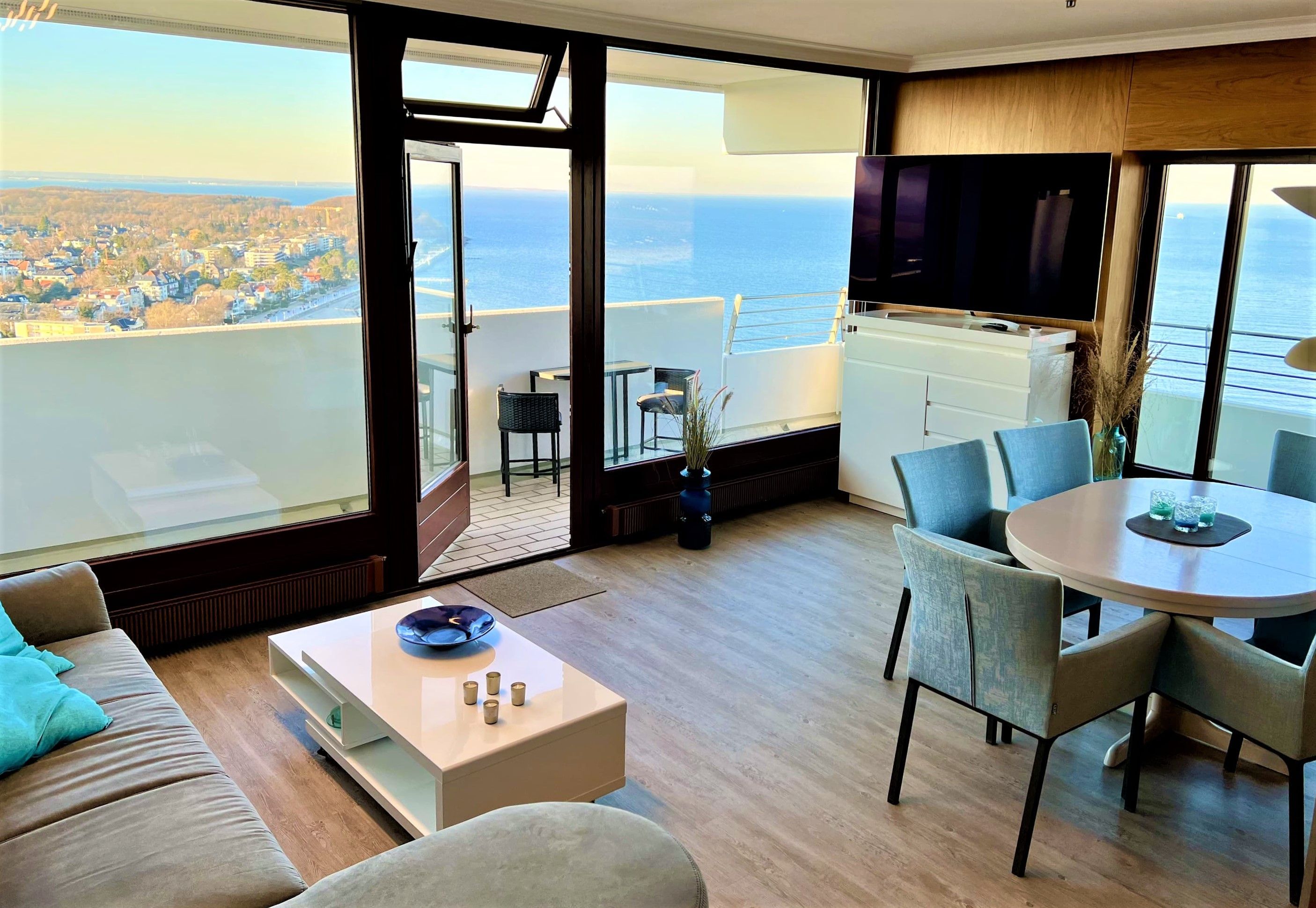 Dieses komfortable und elegante Appartement bietet ein Wohnerlebnis für höchste Ansprüche und lädt zum Wohlfühlen und Entspannen fern des Alltags ein. Highlight dieser, im Jahr 2021 komplett renovierten Ferienwohnung, ist der traumhafte Blick über die Lübecker-Bucht mit lebhaftem Schiffsverkehr. Der großzügige Wohnraum besteht aus einer bequemen Eck-Couch mit Tisch, einem Sideboard, einem großen Smart-TV, sowie einem Esstisch mit 6 bequemen Lounge-Stühlen. Im großen Schlafzimmer befindet sich ein gemütliches Doppelbett (2x 90 cm x 200 cm) und ein großer Einbauschrank sowie ein Smart-TV. Das zweite Schlafzimmer ist ebenfalls mit einem bequemen Doppelbett (160x cm x 200 cm) und einem Kleiderschrank ausgestattet. In der Küche finden Sie unteranderem einen Geschirrspüler sowie einen amerikanischen Designer-Kühlschrank vor. Das modernisierte Duschbad, erreichen Sie vom Eingangsbereich aus . Alle Wohn- und Schlafräume verfügen über einen direkten Zugang auf den überdimensionalen Eckbalkon mit herrlichem Blick über die Ostsee. Zusätzlich steht Ihnen das Schwimmbad im Haus kostenlos zu Verfügung.