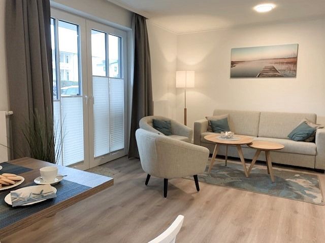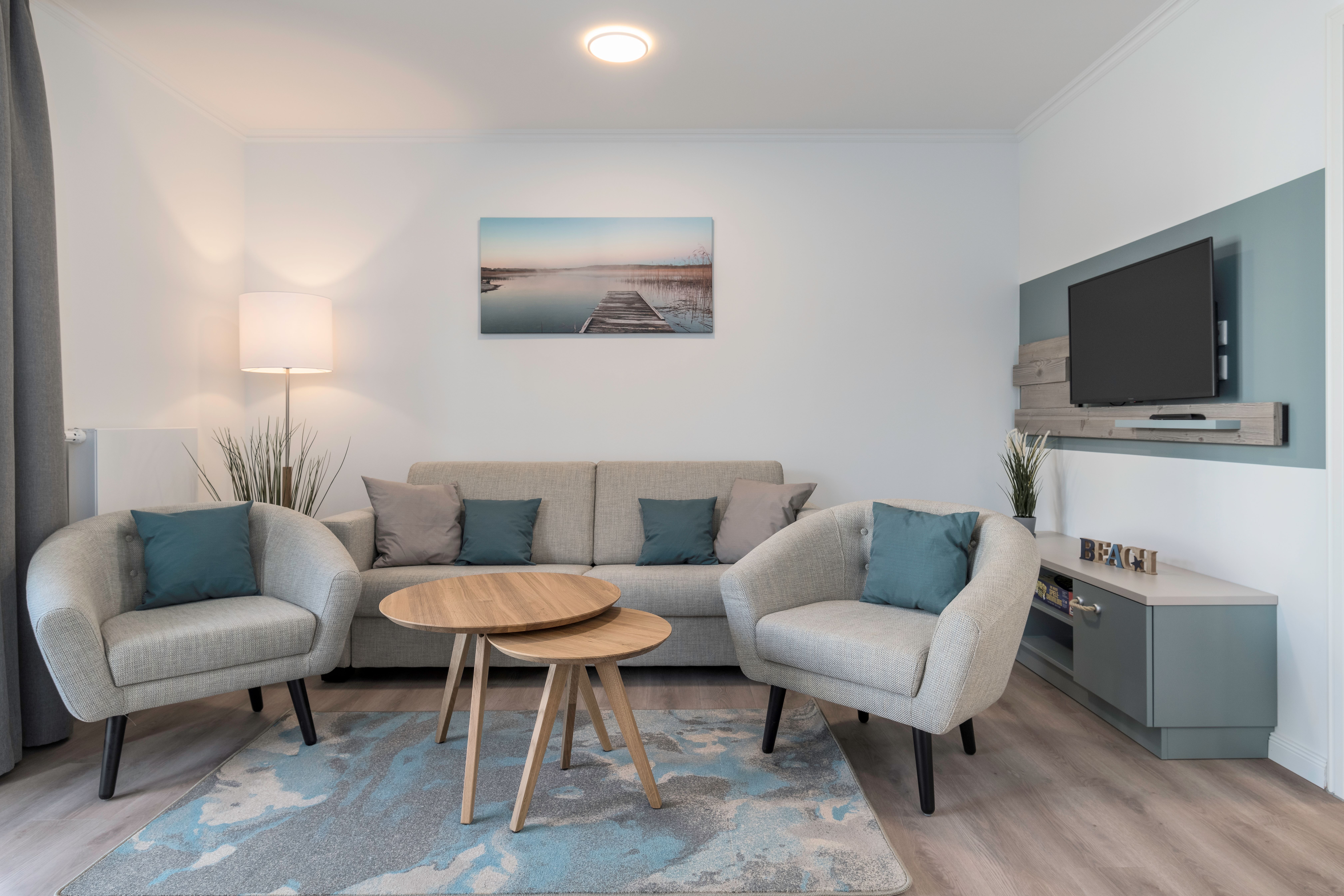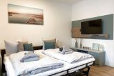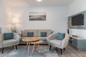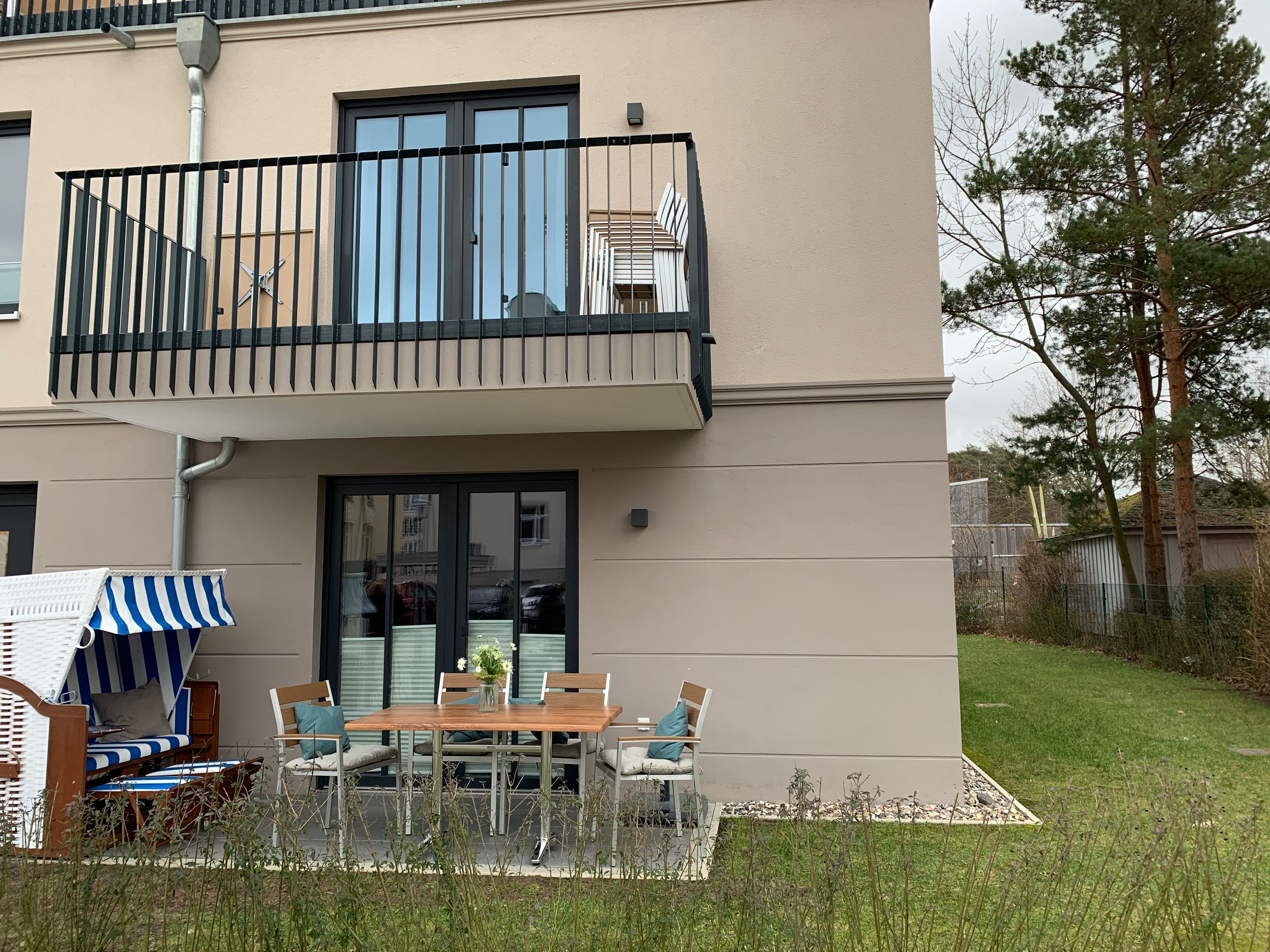 Ihr neues Apartment bietet mit seinen zwei Zimmern auf ca. 50 qm Wohnfläche ausreichend Platz für 4 Personen. Es liegt im Erdgeschoss und hat eine Terrasse nach Südwesten, die mit Terrassenmöbeln, einem Sonnenschirm, einer Liege sowie einem Strandkorb ausgestattet ist.