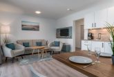 Zu Ihrem Apartment gehört ein großzügiger Wohn- und Essbereich mit offener Küche. Hier befindet sich eine der zwei Schlafmöglichkeiten. Das bequeme Schlafsofa überzeugt mit einer großen Liegefläche von 1,70 m x 1,95 m. Zur Sitzgruppe gehören neben dem Sofa noch 2 Sessel, so dass für 4 Personen ausreichend Sitzfläche vorhanden ist. Zum Zeitvertreib gibt es neben einem Fernseher noch eine große Spielesammlung. Die sehr gut ausgestattete Küchenzeile mit Geschirrspüler, 4-Platten-Cerankochfeld, Backofen mit zusätzlicher Mikrowellenfunktion, Kühlschrank mit Gefrierfach, Kaffeemaschine, Kapselkaffeemaschine „Dolce Gusto“, Wasserkocher, Toaster und Eierkocher lässt keine Wünsche offen. Vom Eierlöffel über den Pizzaschneider bis zur Salatschleuder ist alles vorhanden. Der Essbereich bietet ebenfalls genügend Raum für 4 Personen. Der Wohn-/Essbereich verfügt über Verdunklungsvorhänge, Plissees und ein Fliegengitter.
