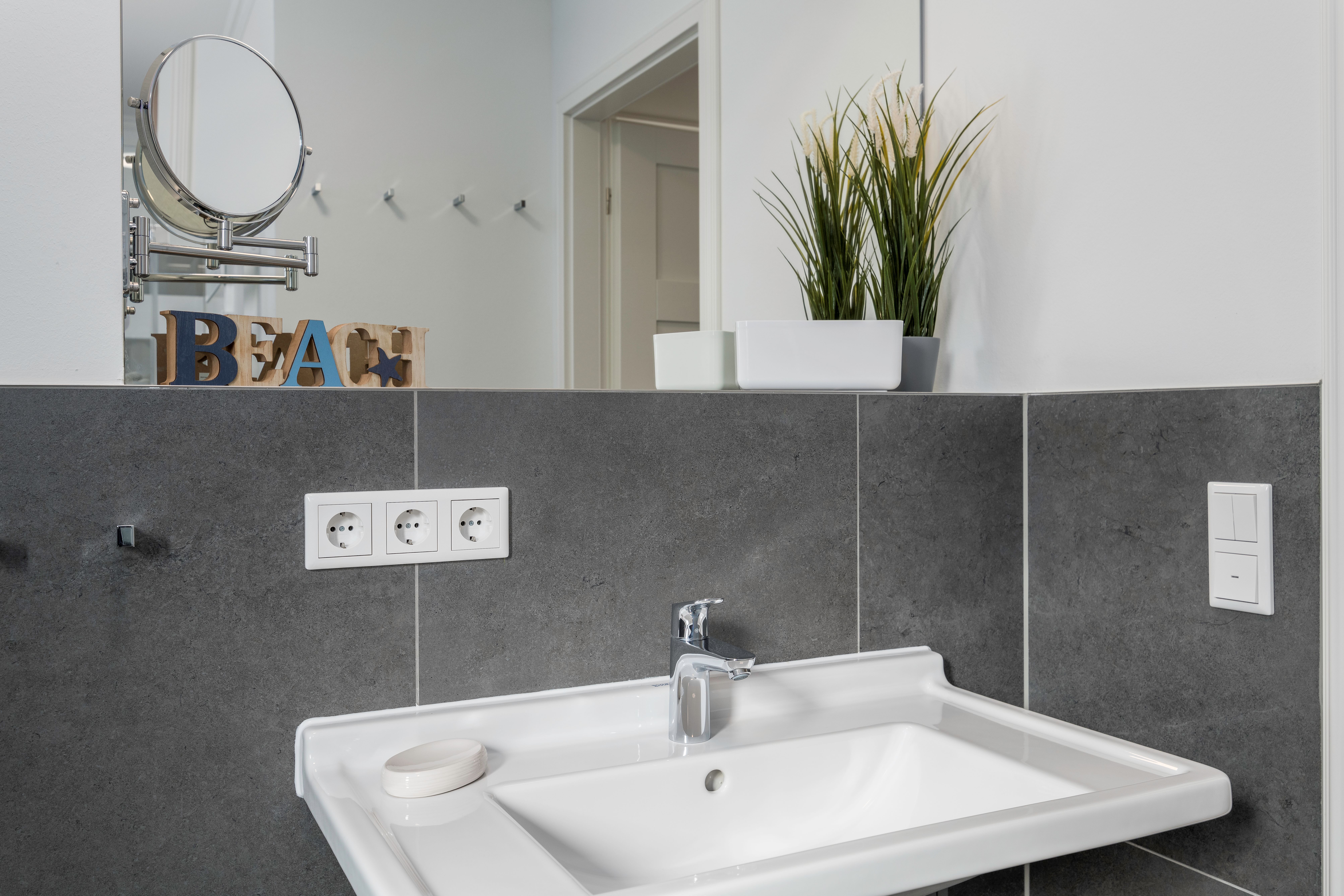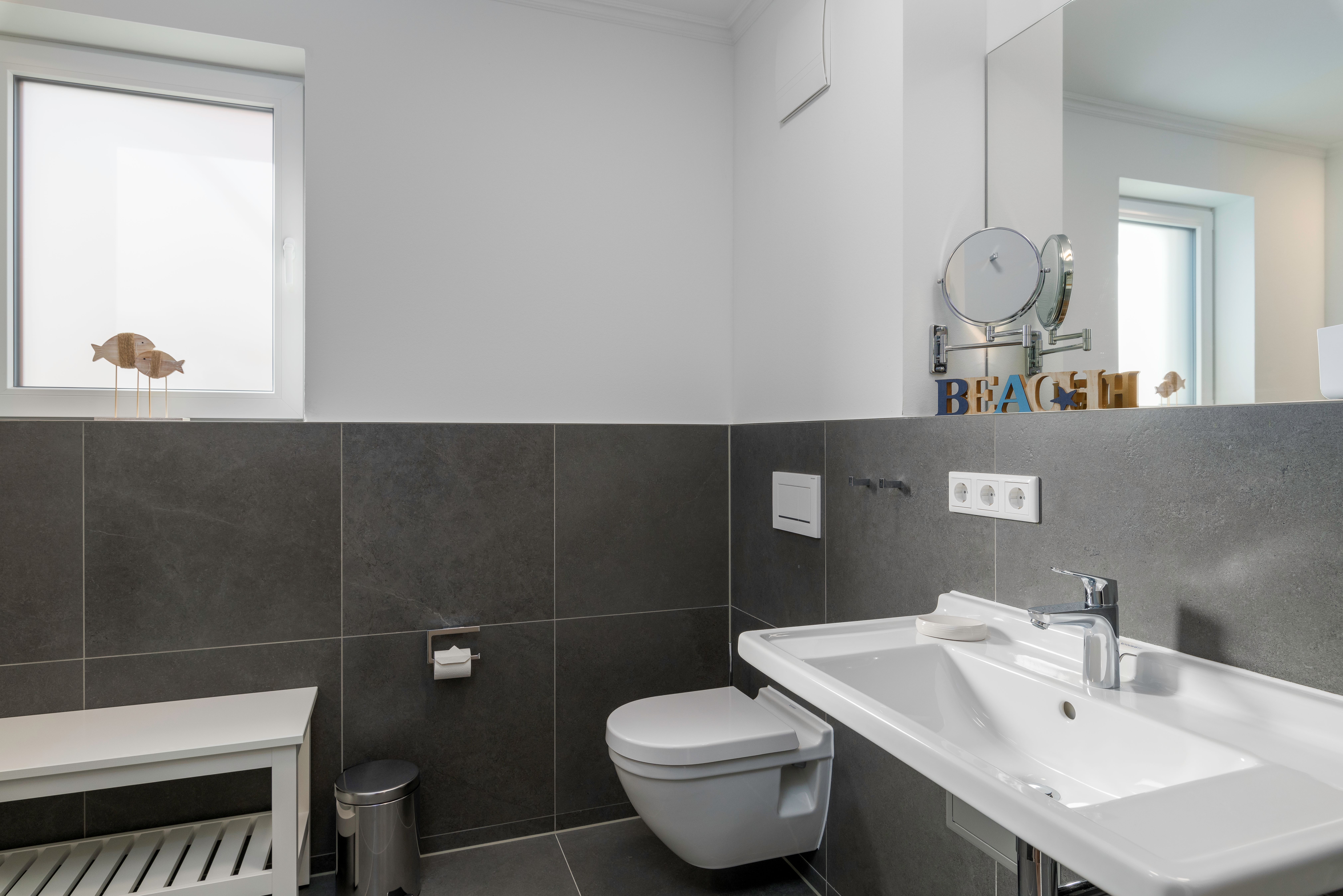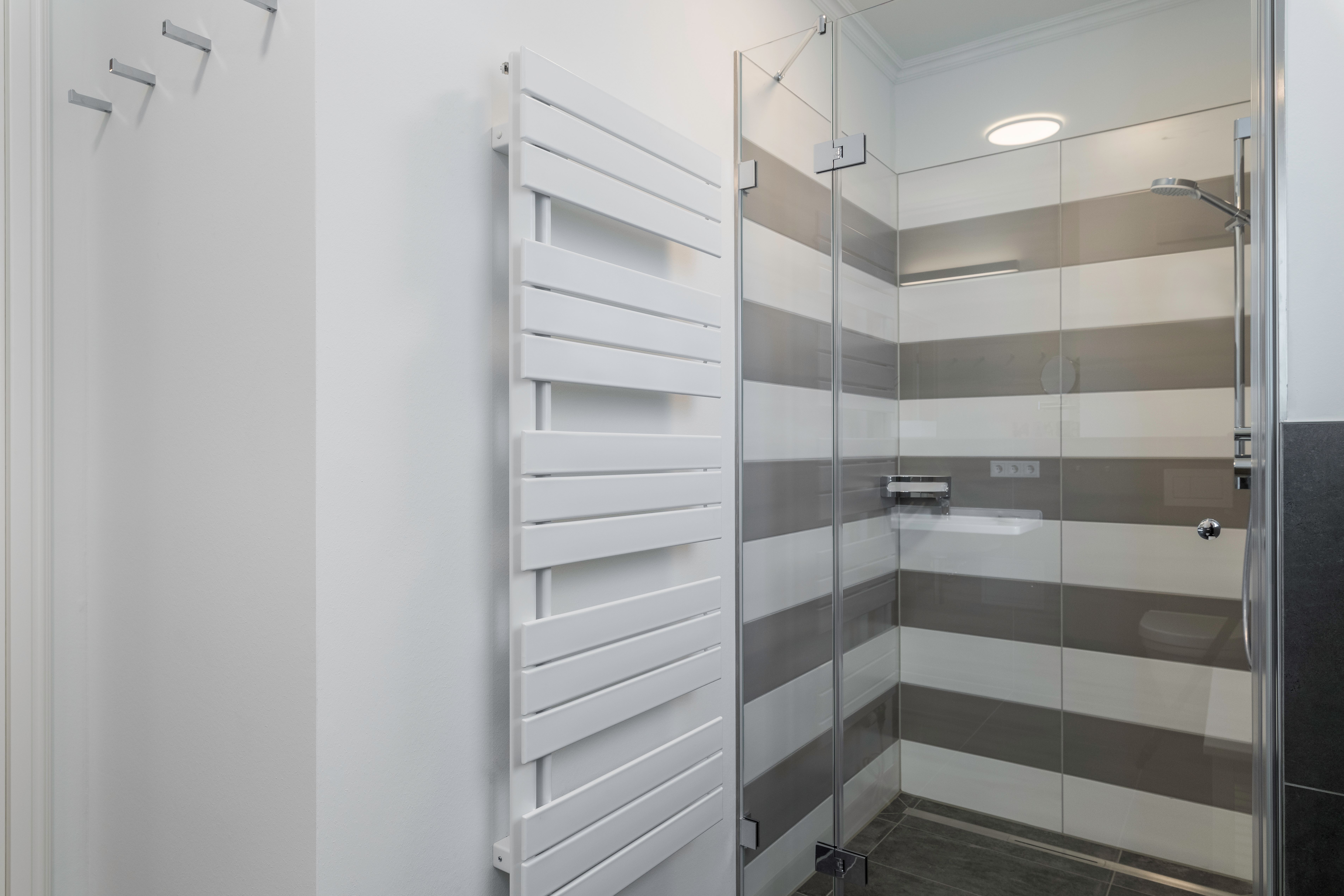 Das Tageslichtbad verfügt über Dusche/WC mit Fußbodenheizung, einen Haartrockner, Kosmetikspiegel und einen Handtuchtrockner. Es gibt eine kleine Bank, die eine zusätzliche Ablagefläche bietet.
