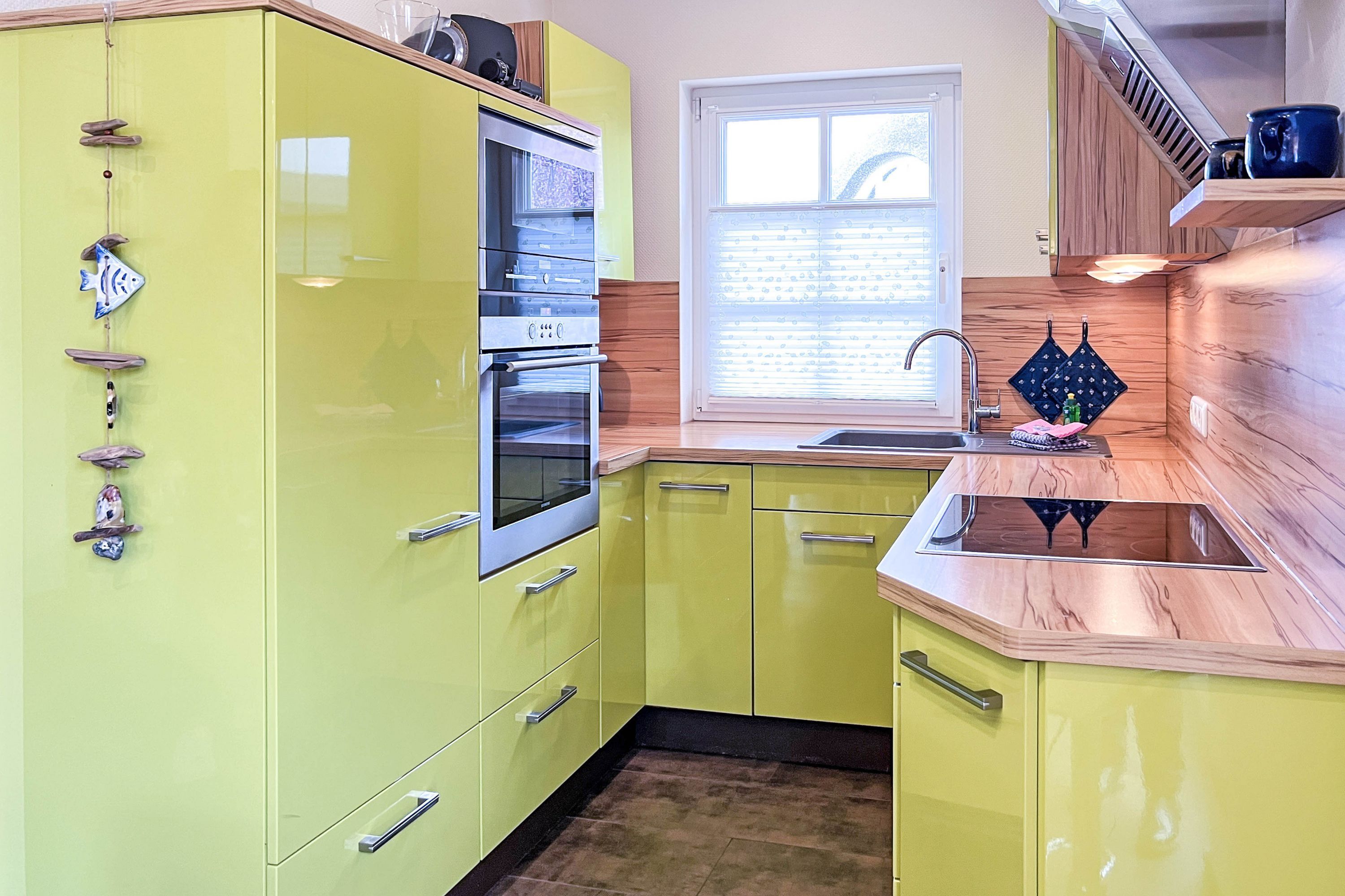 • Voll ausgestattete Küche mit Geschirrspüler, Backofen, Kochfeld, Kühlschrank, Mikrowelle, Filterkaffeemaschine, Toaster und Wasserkocher