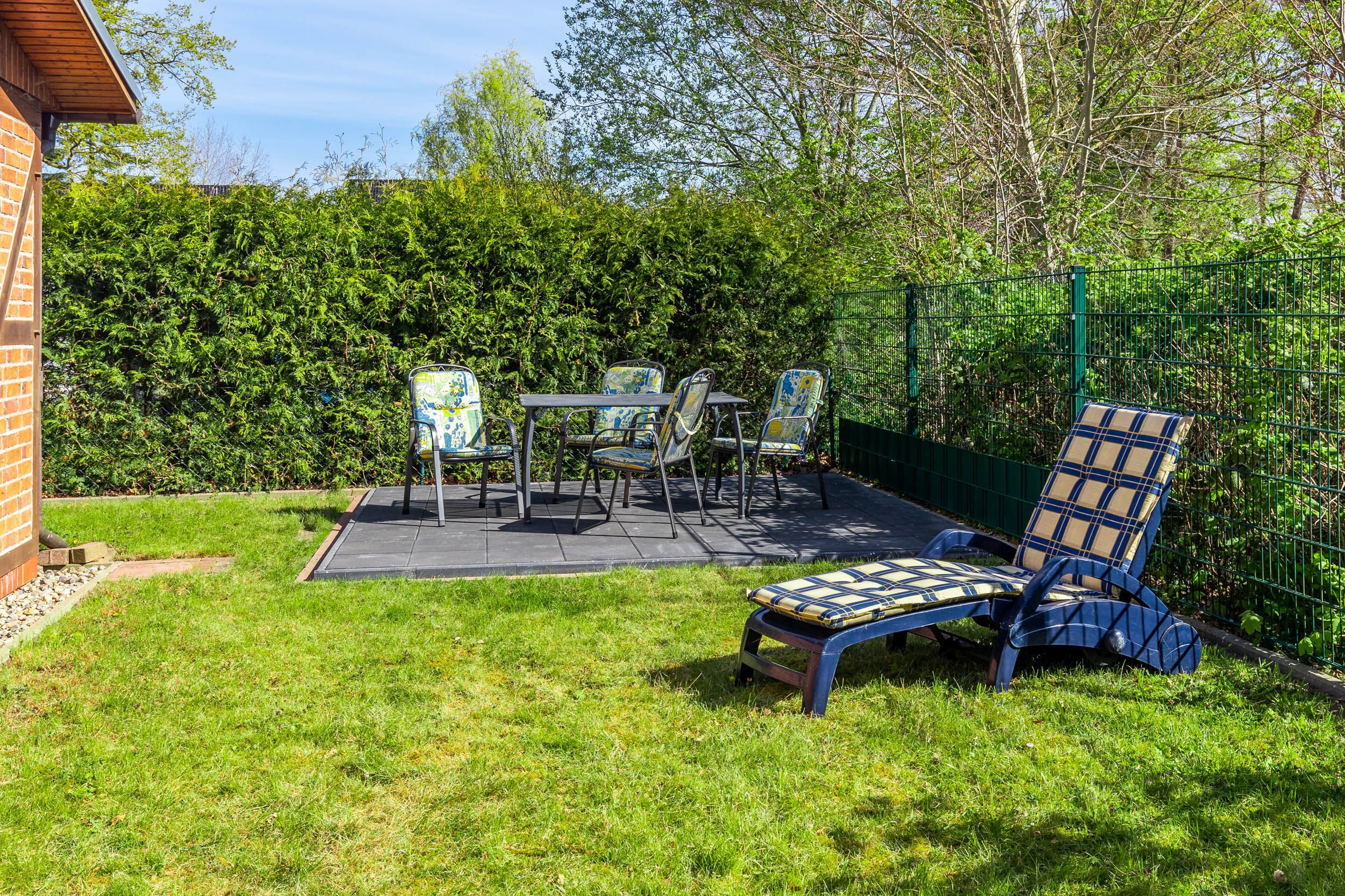 Neben dem Carport befindet sich eine eigene möblierte Terrasse für diese Nichtraucher-Ferienwohnung.