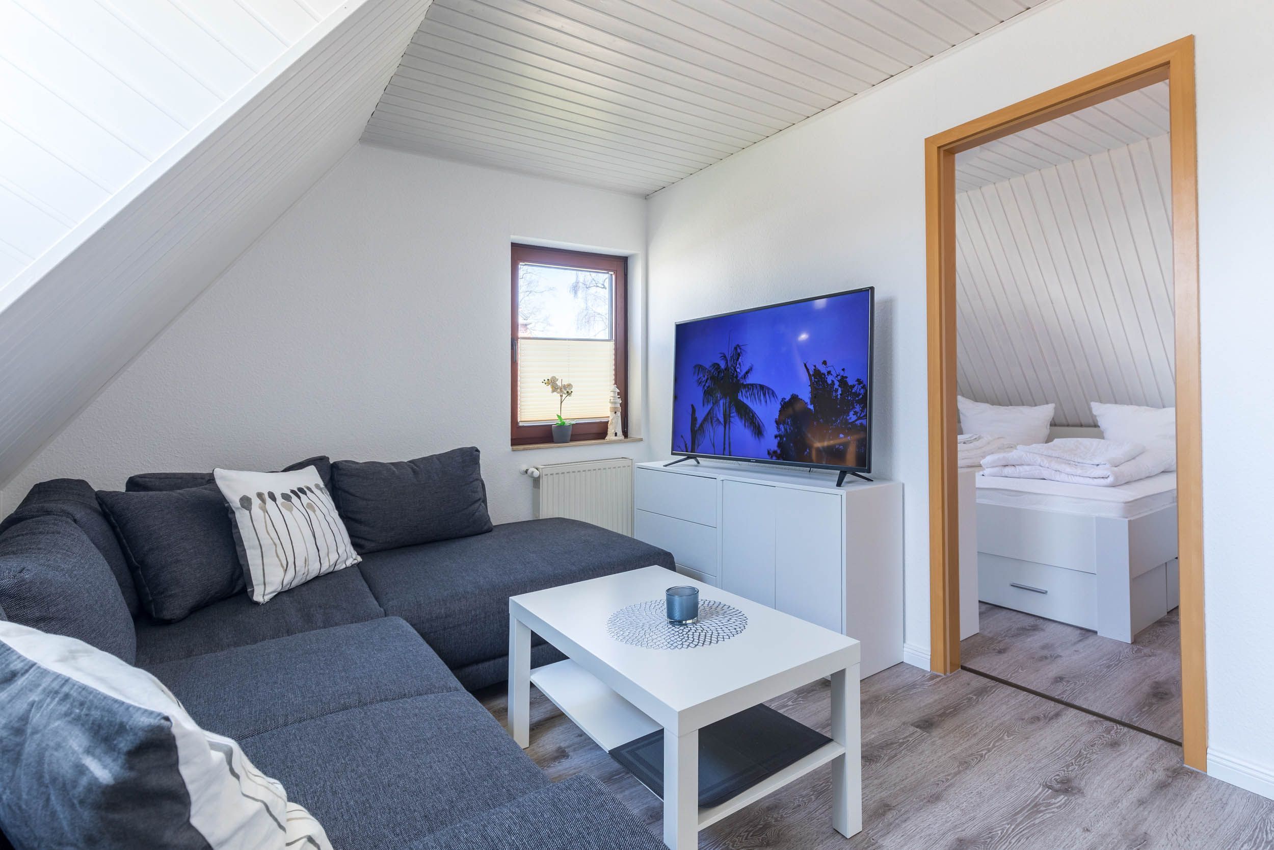 Die 2-Zimmer-Ferienwohnung befindet sich in der 1.Etage des Hauses und ist über eine Treppe zu erreichen. Sie bietet eine komfortable Ausstattung für 3 Gäste.