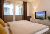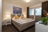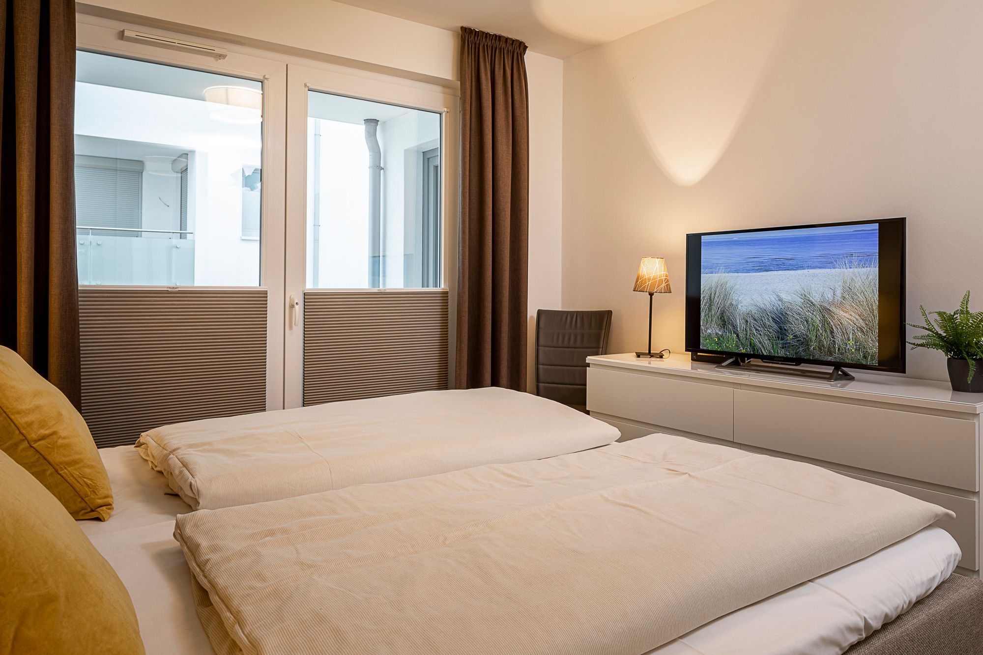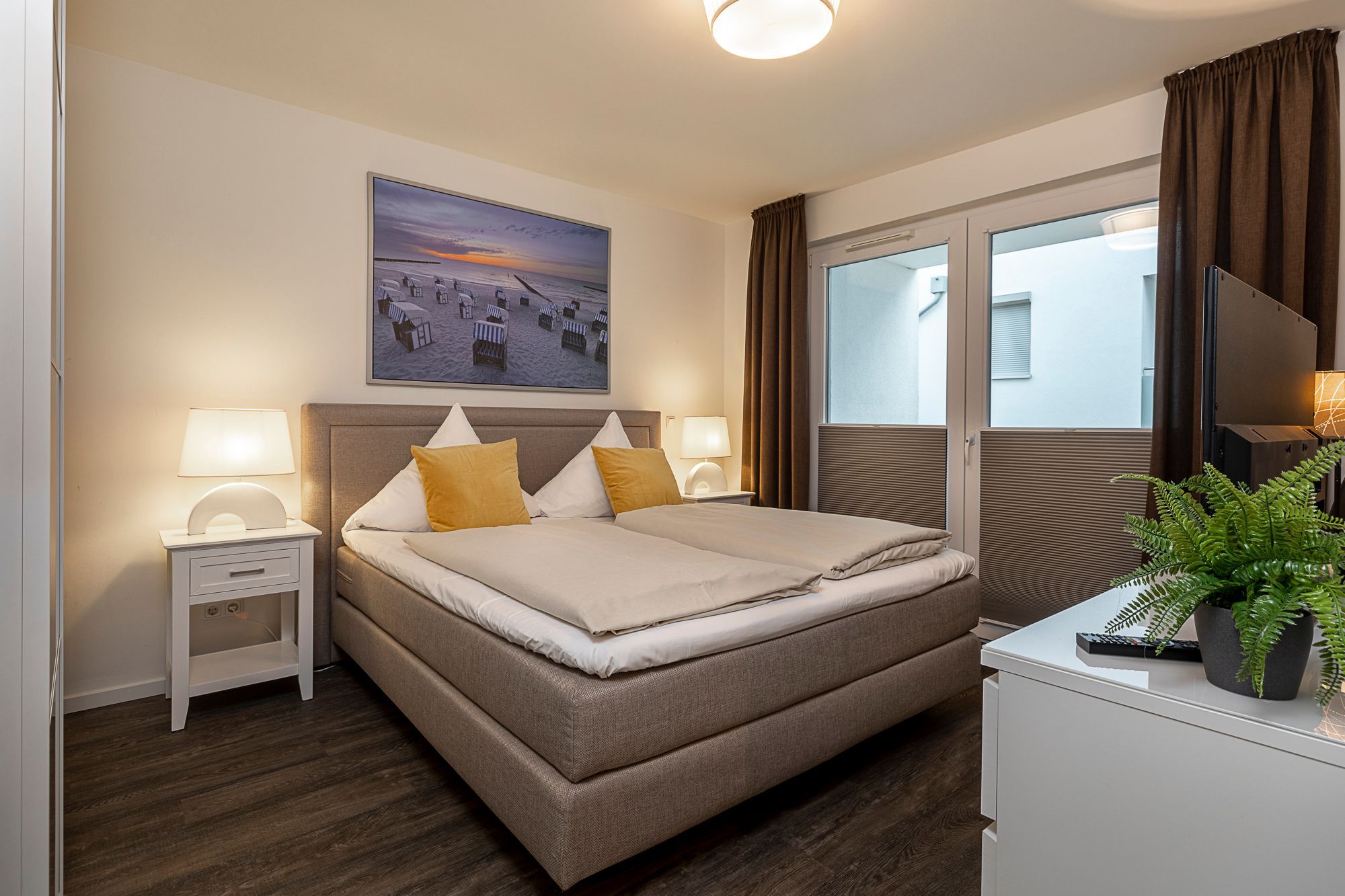 Das Schlafzimmer ist mit einem Kleiderschrank, einem bequemen Bett (2,00 x 1,80m, durchgehender Topper) und einem Flachbildfernseher ausgestattet. Zur Verdunkelung sind Plissees angebracht. Das Badezimmer verfügt über eine bodentiefe Dusche, einen großen Spiegel sowie einen Handtuchheizkörper.