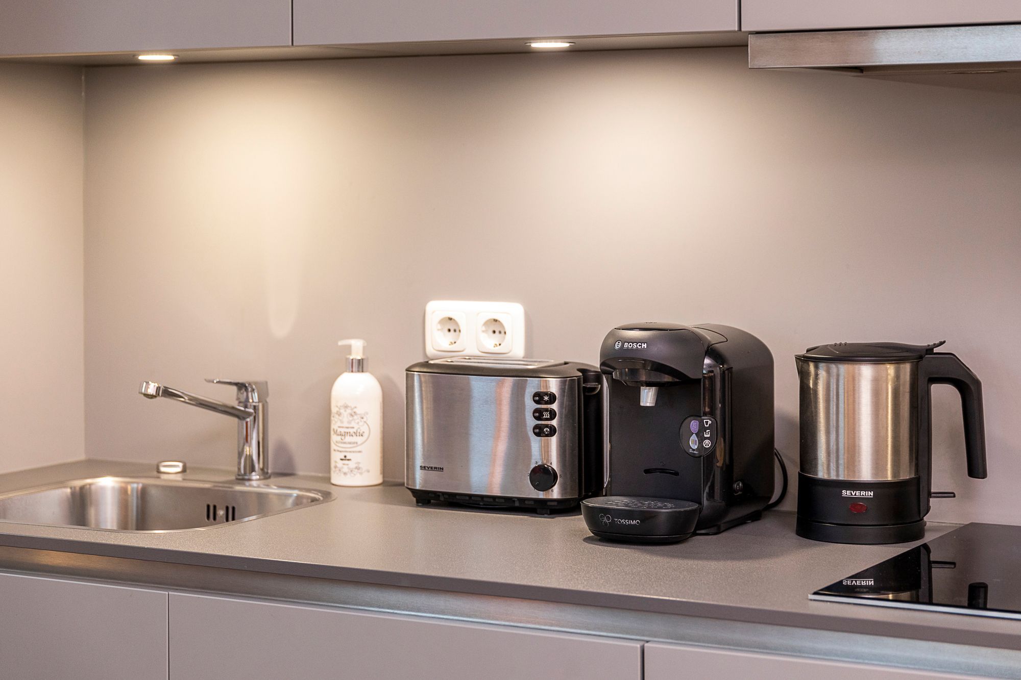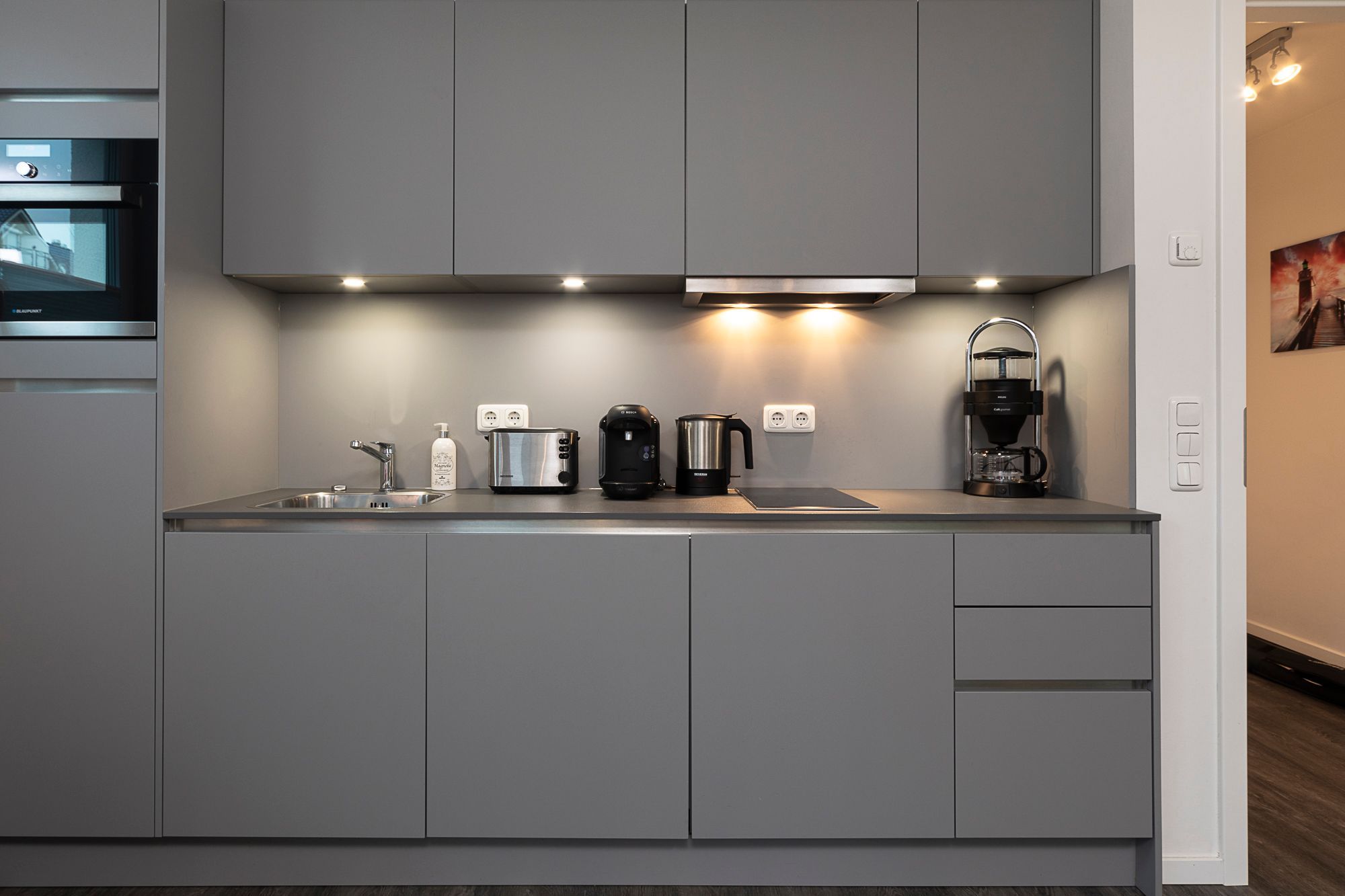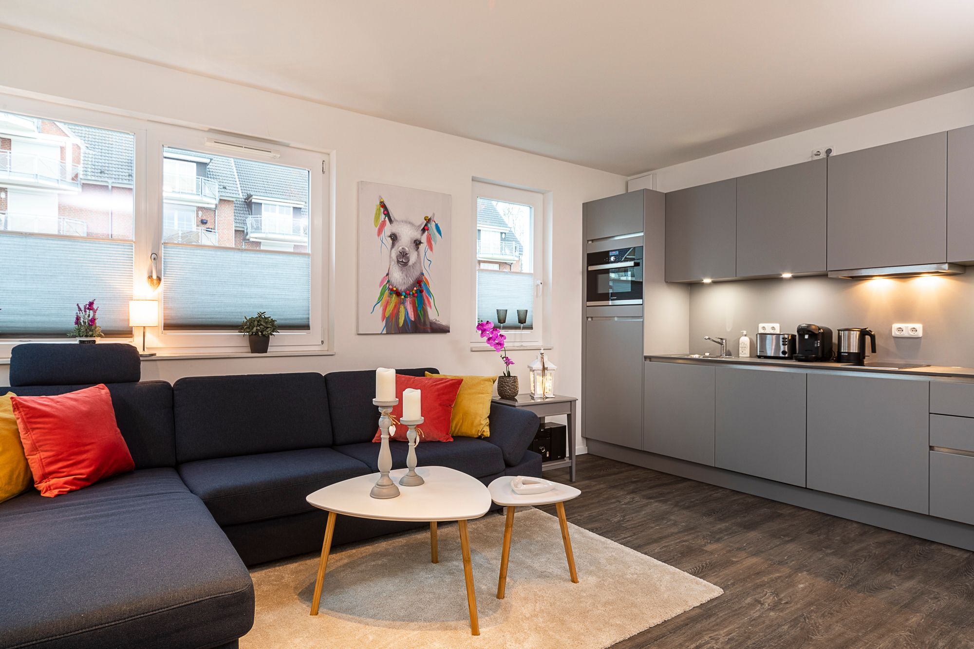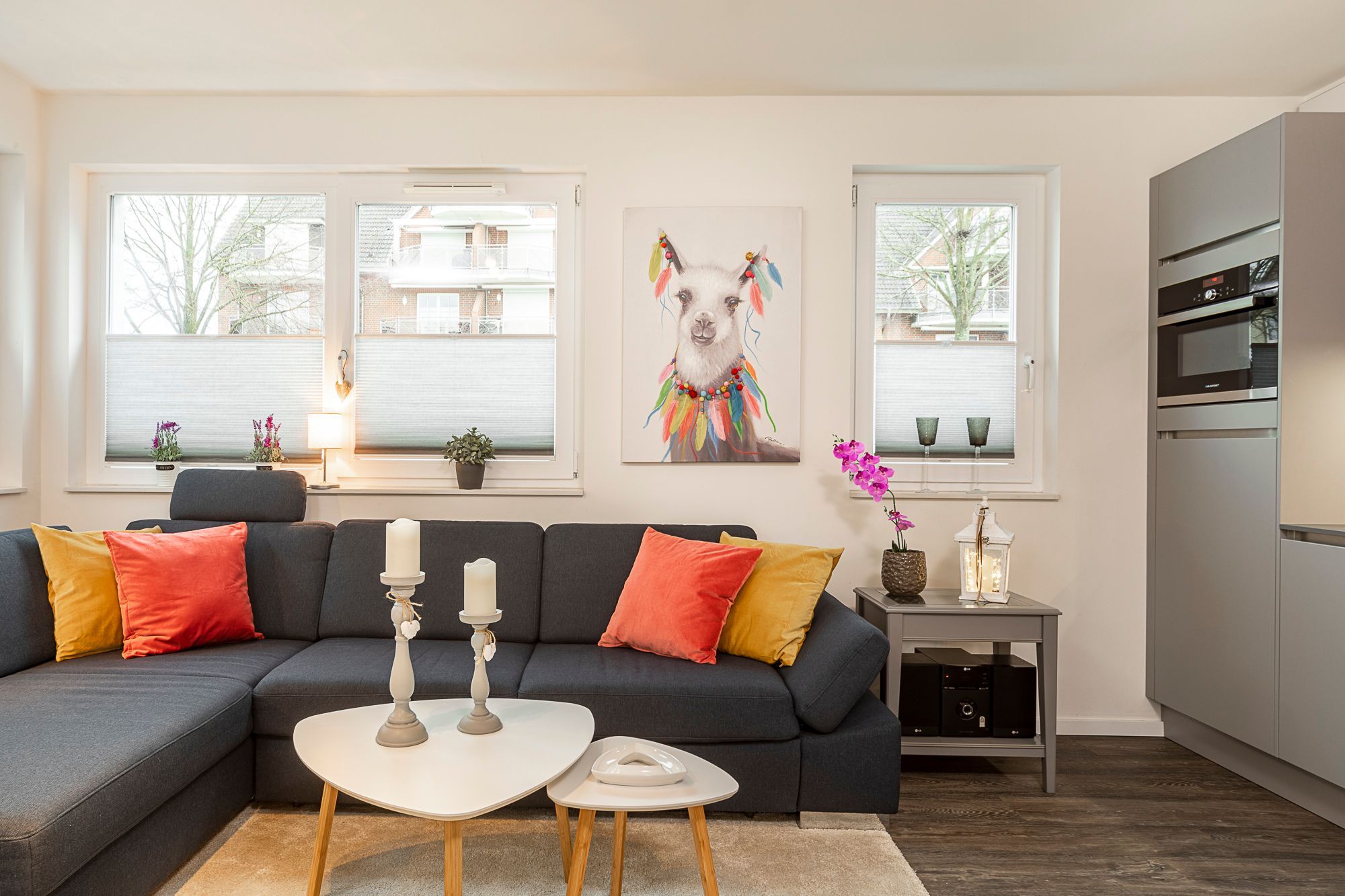 Diese moderne Ferienwohnung hält alles bereit, was für einen schönen Urlaub nötig ist. Herrliches, lichtdurchflutetes Wohnzimmer mit einem bequemen Sofa, das mit wenigen Handgriffen zu einem Schlafsofa umfunktioniert werden kann und einem Wohn-Essbereich. Es stehen hier ein moderner Flach-TV , eine Musikanlage sowie kostenloses WLAN für Sie bereit. Die Terrasse ist mit Tisch und Stühlen ausgestattet. Komplett ausgestattete Küchenzeile mit Pads-Kaffeemaschine, Filter-Kaffeemaschine, Toaster, Wasserkocher, Eierkocher und vieles mehr.