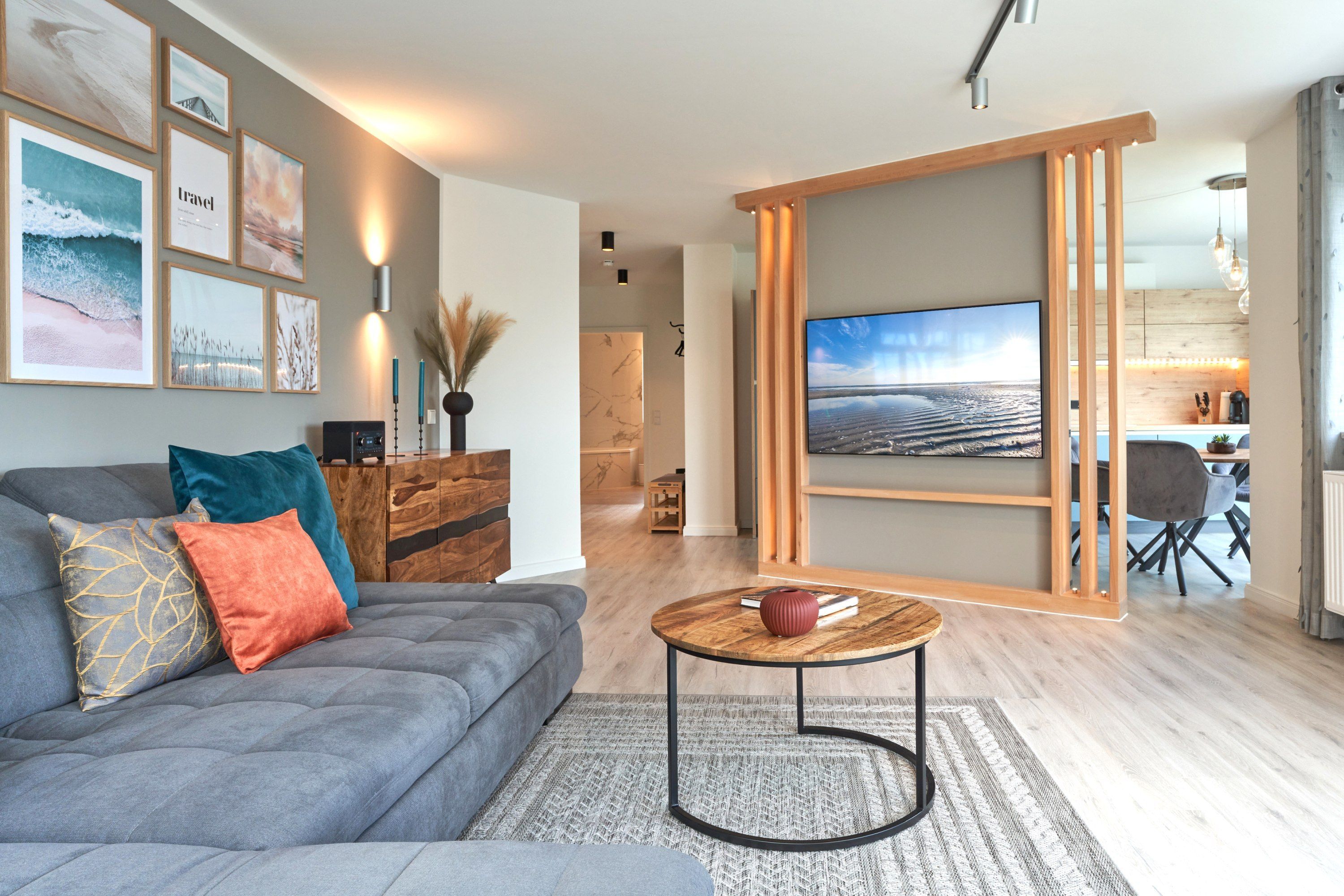 Die 3-Zimmer-Ferienwohnung ist mit bodentiefen Fenstern ausgestattet. An allen Fenstern befindet sich Licht- und Sichtschutz. Die hochwertige Einbauküche im Wohn-Essbereich ist komplett ausgestattet und lässt keine Wünsche offen; Küchenzeile mit erhöhtem Backofen, Ceran-Kochfeld, Mikrowelle, Geschirrspüler, Kühlschrank mit Gefrierfach, Filterkaffeemaschine mit Thermoskanne, Senseo-Kaffeemaschine, Senseo-Milchaufschäumer, Eierkocher, Mixer, Toaster und Wasserkocher. Der Küchenbereich ist optisch vom Wohnbereich abgetrennt. Der Wohnbereich ist mit einer hochwertigen Sofa-Landschaft, einem Wohnzimmertisch sowie mit einem Smart-TV ausgestattet. Aus dem Wohnbereich gelangen Sie auf den herrlichen, überdachten Süd-Ost-Balkon. Hier stehen Ihnen Tisch und Stühle zur Verfügung. Das 1. und 2. Schlafzimmer sind jeweils mit einem Doppelbett (Bettengröße 1,80mx2,00m) ausgestattet; Kleiderschrank, 2 Nachttische sowie ein Wand-TV. Sind Sie es gewohnt, im Dunkeln zu schlafen? Die Fenster haben Verdunklungsvorhänge. Die Duschbäder sind in heller Optik mit bodengleicher Dusche / Regendusche, mit separater Handbrause, Handtuchheizkörper, Fön und Kosmetikspiegel ausgestattet. Die Fußböden in den Bädern haben einen Wärmerücklauf.