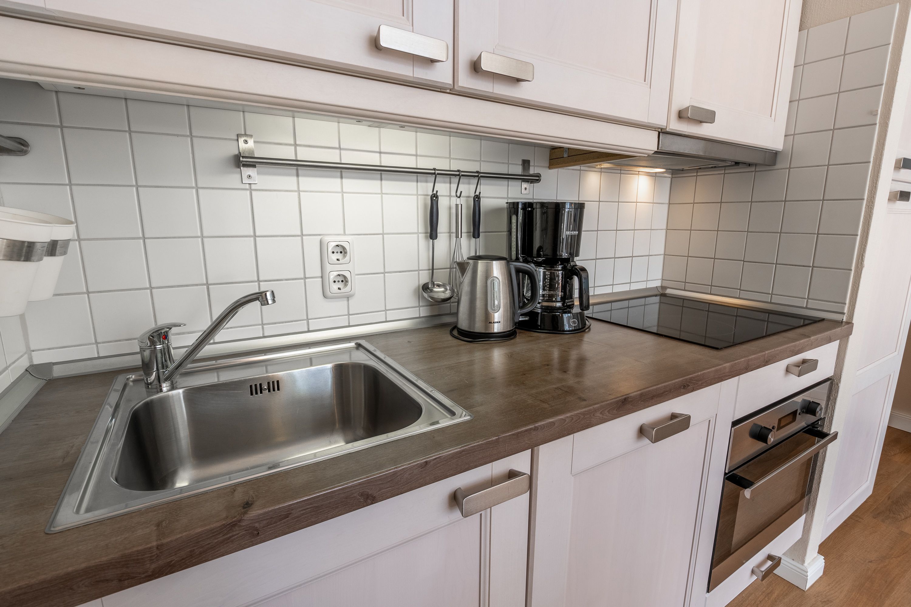 Die Küchenzeile ist vollständig ausgestattet mit Herd mit Cerankochfeld, Mikrowelle/Backofen, Geschirrspüler, Toaster und Wasserkocher. Zudem erwarten Sie eine Kaffeemaschine für Filterkaffee und eine Senseo-Maschine für Kaffee-Pads.