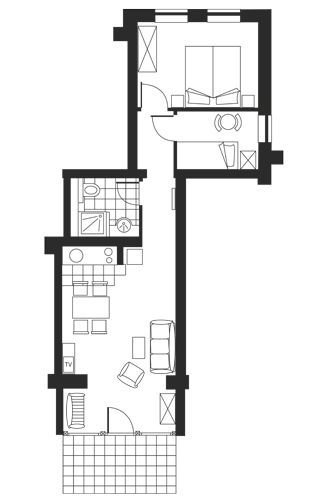 Die Wohnung bietet auf 45 qm genügend Platz für vier Personen und verfügt über ein Schlafzimmer mit Doppelbett und ein kleines Kinderzimmer mit Etagenbett. Neben dem geschmackvoll eingerichteten Wohnzimmer (ausgestattet mit einem Flatscreen-TV, DVD-Player und einer Musikanlage) bietet die Terrasse mit Terassenmöbeln Raum, die Seele baumeln zu lassen und vom Alltag abzuschalten.