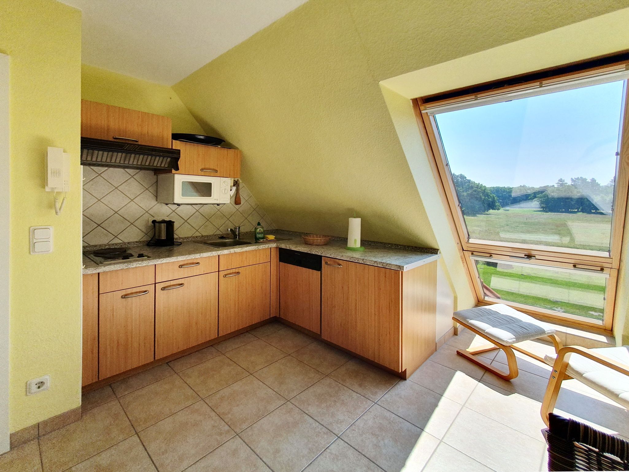 Die Wohnung befindet sich im obersten Stockwerk des Hauses und hat eine Grundfläche von 29 Quadratmetern. Die Zimmer haben Dachschrägen. Das Wohnzimmer verfügt über eine kleine Küchenecke sowie einen ausklappbaren Veluxbalkon, der für eine Person geeignet ist. Von dort aus hat man einen schönen Blick auf die angrenzende Wiese und den Wald.