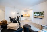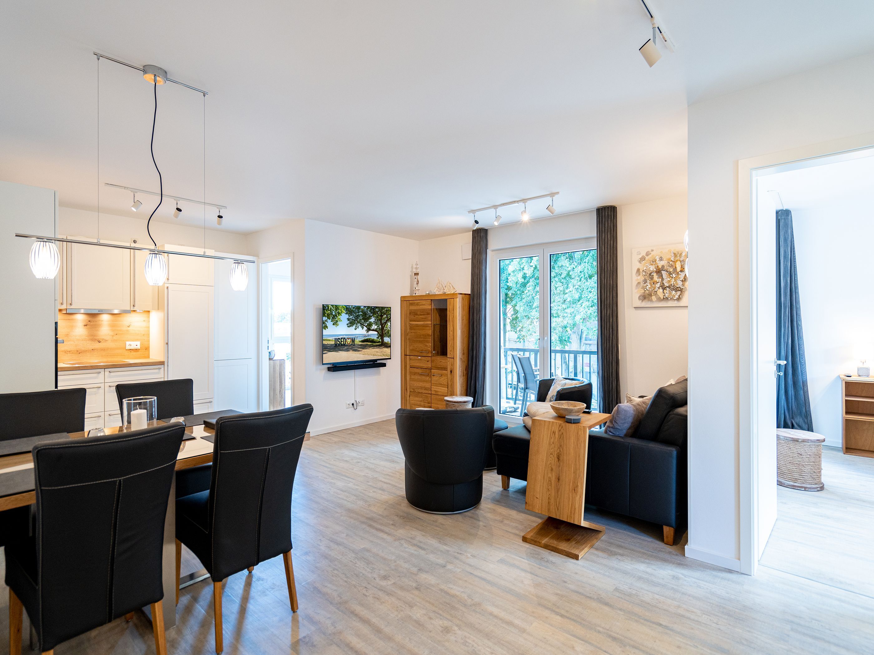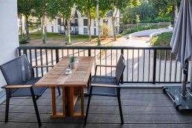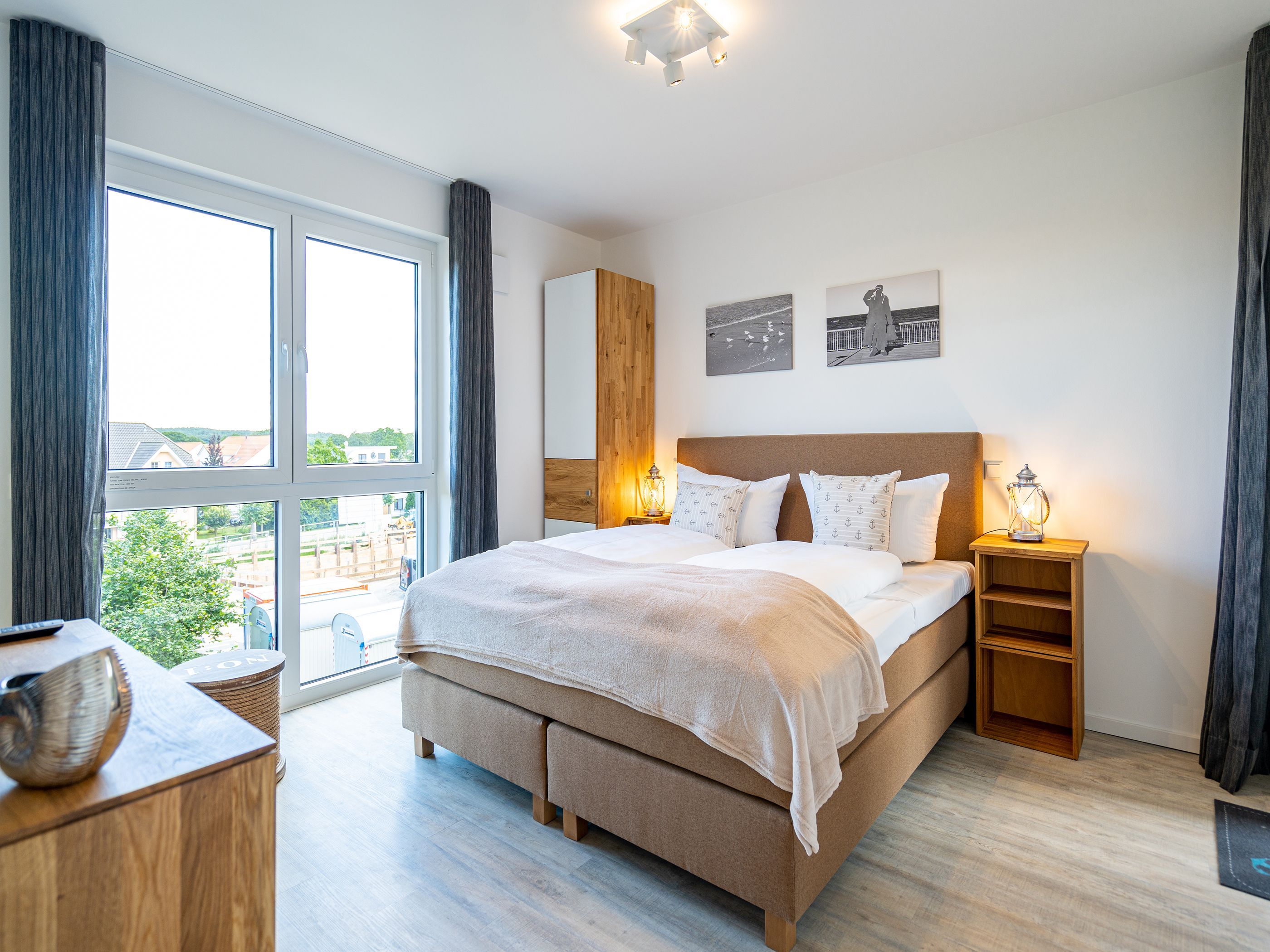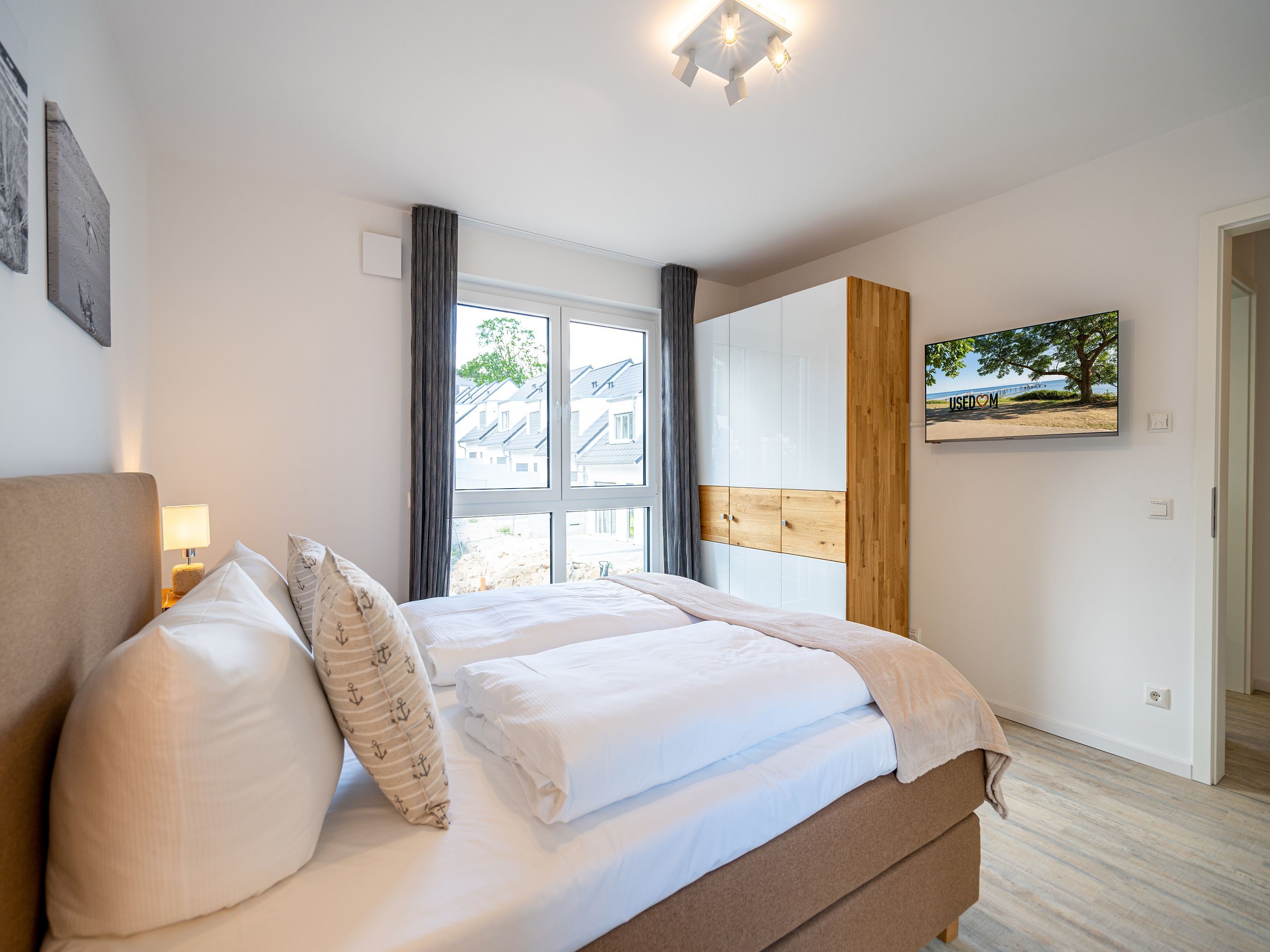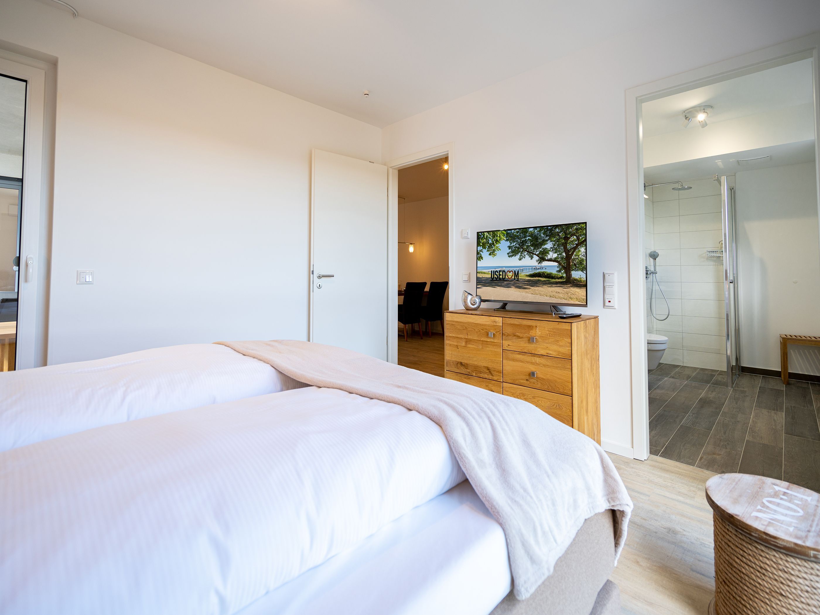 Fern ab von Trubel und Hektik finden in diesem 80qm großen Appartement bis zu 4 Erwachsene und ein Kleinkind (bis 2 Jahre im Kinderreisebett) Ruhe und Entspannung. Das 3-Raum-Appartement im 1. Obergeschoss eignet sich mit seinen 2 Schlafzimmern und 2 Bädern perfekt für einen Familienurlaub oder eine Auszeit mit Freunden. Lichtdurchflutete Räume und ein helles Interieur sorgen beim Betreten direkt für Urlaubsfeeling. Der großzügige Wohn-Essbereich verfügt neben einem erstklassigen Ledersofa über einen Essbereich für bis zu 4 Personen (ein Hochstuhl ist auf Wunsch gegen Aufpreis erhältlich). Nach einem ausgefüllten Tag auf der Insel Usedom finden Sie vor dem 50 Zoll Flat-TV entsprechende Entspannung. Die hochwertige Küchenausstattung (Backofen mit integrierter Mikrowelle, Cerankochfeld, Spülmaschine, Kühlschrank mit Gefrierfach und Kleinküchengeräte) lässt keine Wünsche beim Zubereiten Ihrer Speisen offen. Auf Ihren erholsamen Schlaf müssen Sie auch im Urlaub nicht verzichten. Die Schlafzimmer sind jeweils mit bequemen Boxspringbetten (1,80m x 2,00m) und 40-Zoll Flat-TV ausgestattet. Einen direkten Zugang zu einem Duschbad haben Sie von einem der beiden Schlafzimmer aus. Ein weiteres Duschbad ist vom Wohnzimmer aus begehbar. Beide Bäder verfügen neben einer Dusche über einen Waschtisch und ein WC. Ein Highlight ist der Süd-West-Balkon, den Sie jeweils von beiden Schlafzimmern aus begehen können. Einen Tisch sowie Sitzmöglichkeiten für bis zu 4 Personen sind ebenfalls in der Ausstattung enthalten. Für einen optimalen Start hin den Urlaub sind die Betten bereits bezogen und Handtücher liegen für Sie bereit. Ein kostenloser Stellplatz sowie kostenfreies W-Lan runden dieses Appartement ab.