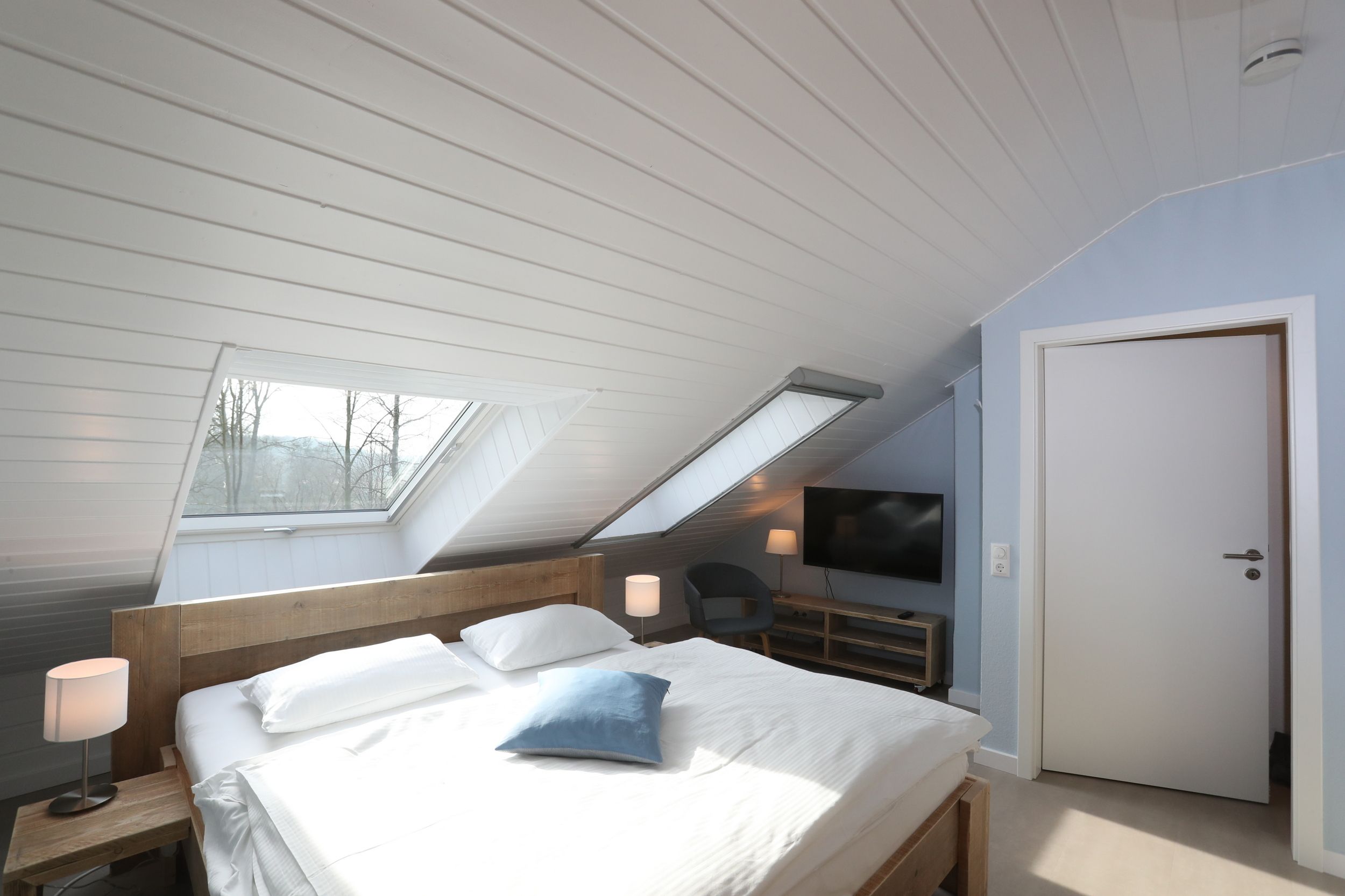 Das Haus bietet zwei separate Schlafzimmer. Insgesamt stehen ein Doppelbett (im 1.Obergeschoss/ DG) sowie 2 Einzelbetten (im Erdgeschoss) zur Verfügung. Kleiderschrank und Kommode können in diesen Räumen für die Urlaubsgarderobe genutzt werden. Im Schlafzimmer mit dem Doppelbett ist zudem ein weiterer Flatscreen-TV aufgestellt.