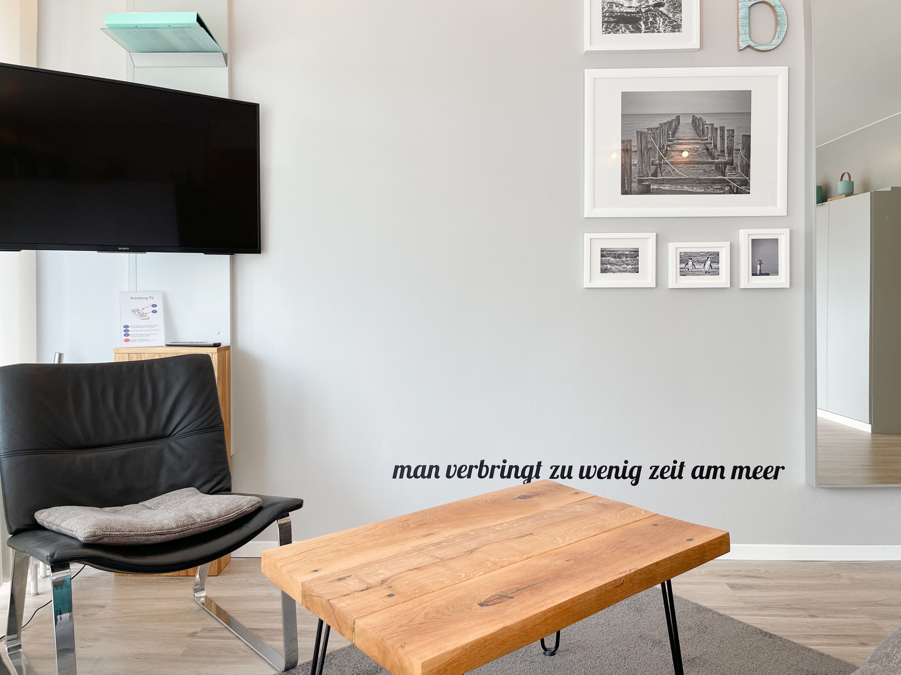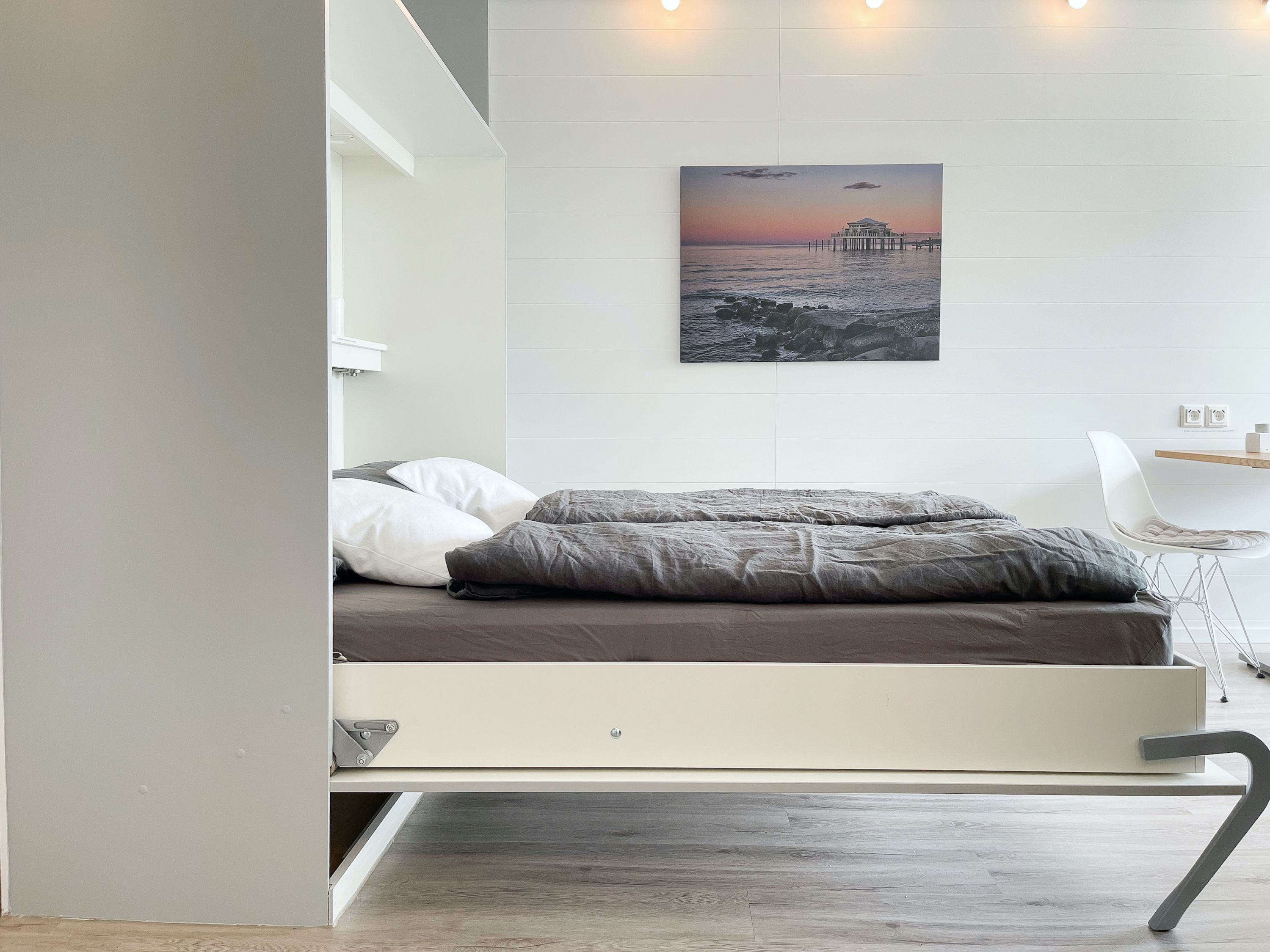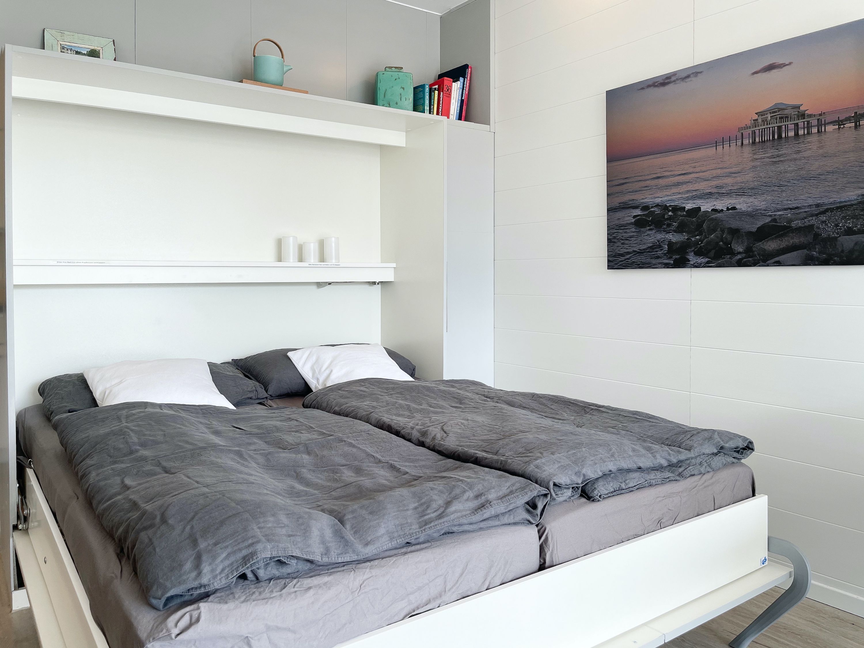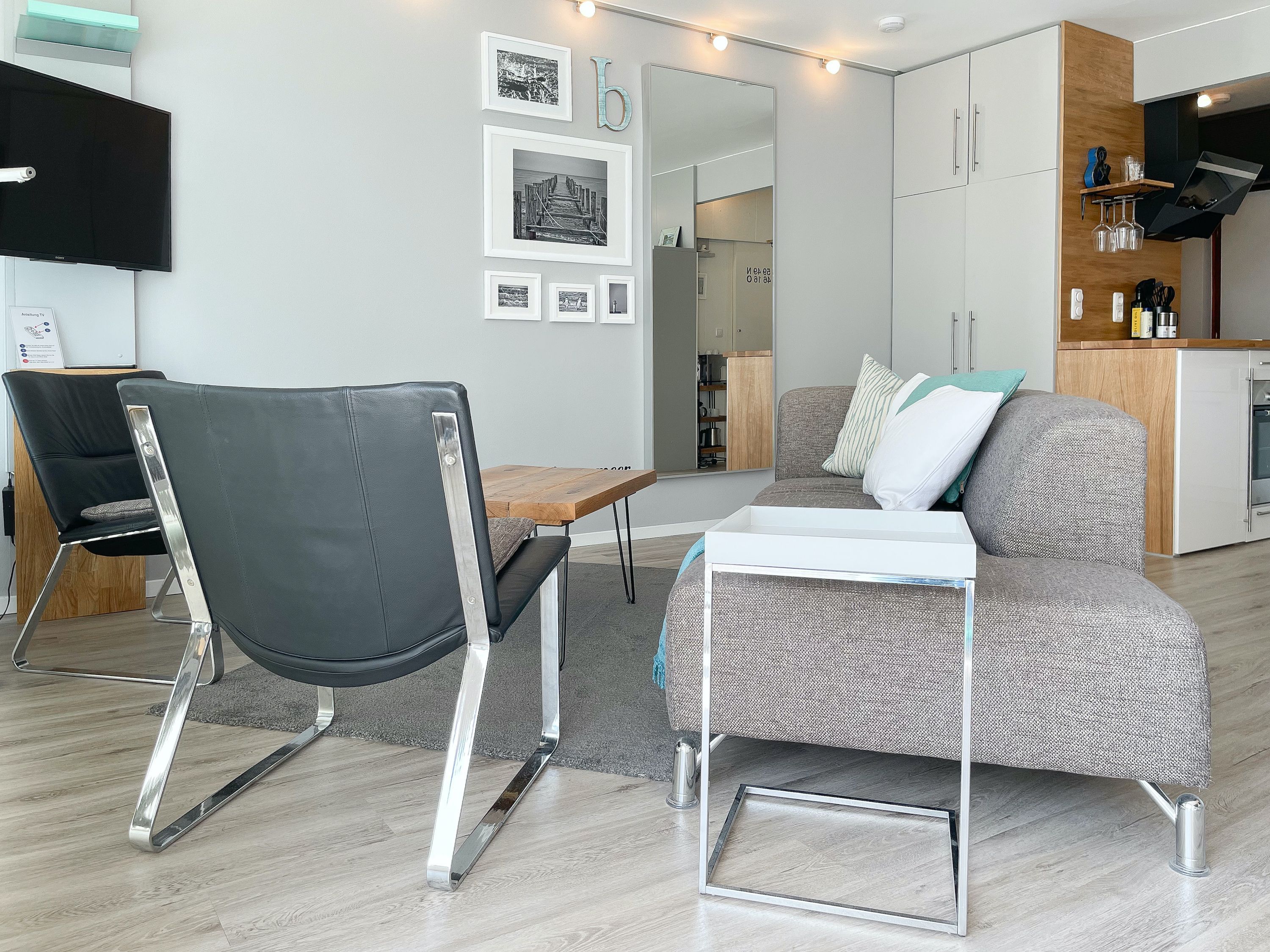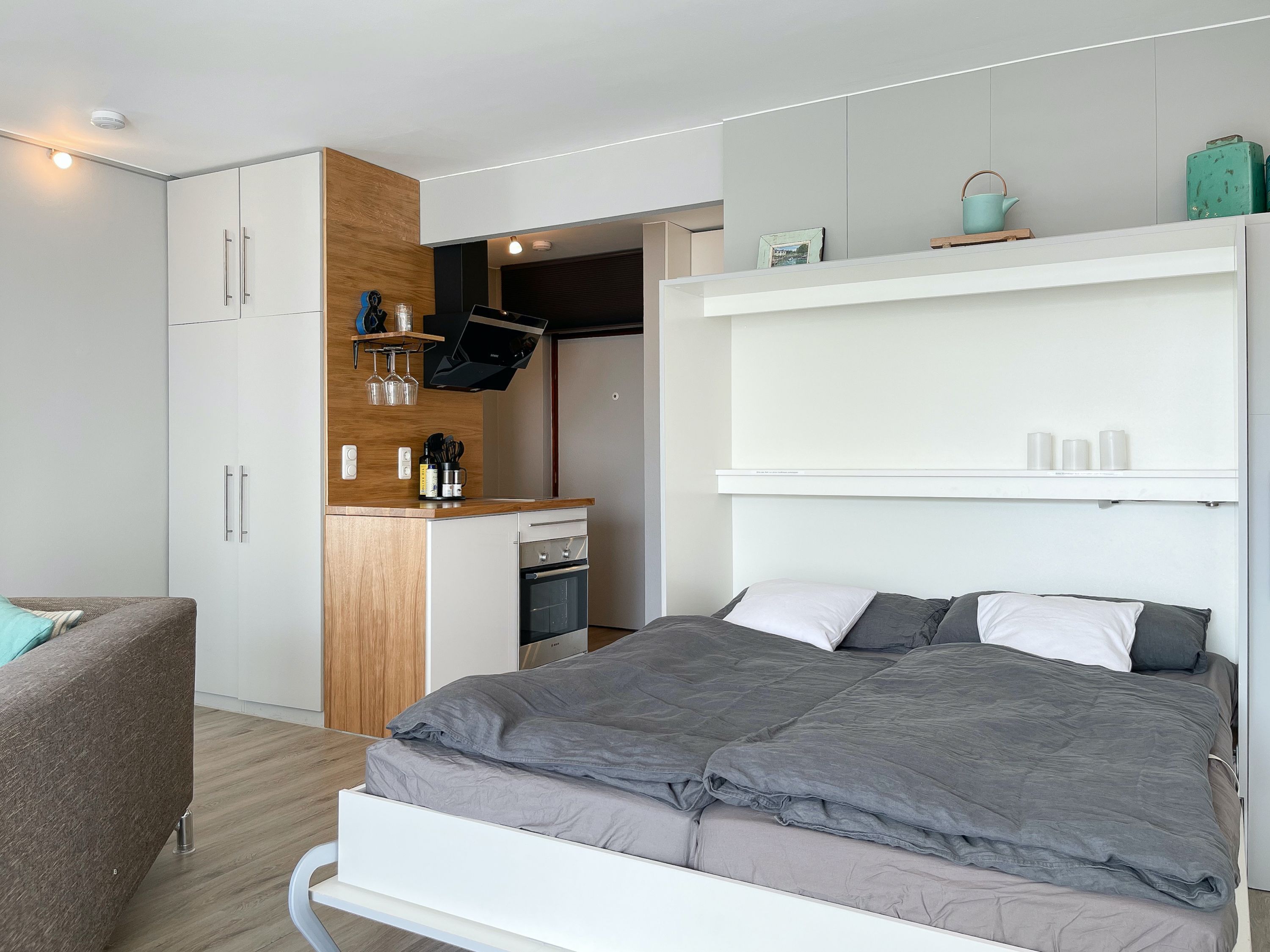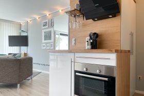 Das mit Herz und Seele gestaltete Studio ist klein aber fein und liegt im 1. Obergeschoss einer terrassenförmigen Wohnanlage zur lichtdurchfluteten Südseite. Ein kleines Raumwunder mit Liebe zum Detail und reichlich Staufläche, da jeder qm optimal genutzt wurde. Der stylische Wohnbereich mit Sofa, TV, Bluetoothradio, Schrankbett und einem Essbereich für 2 Personen, präsentiert sich lichtdurchflutet dank bodentiefer Fensterelemente. Das Doppelbett verschwindet tagsüber im Schrank und ist mit nur einem Handgriff zur Schlafenszeit bereit. Ein Highlight ist der äußerst großzügige Sonnenbalkon mit elektrischer Markise, Gartenmöbeln und Sonnenliege. Die kleine Küche fügt sich perfekt ein und ist mit allen technischen Geräten wie Spülmaschine, Backofen und 2er Induktionsfeld ausgestattet. WLAN steht selbstverständlich zur kostenlosen Nutzung zur Verfügung. Es gibt ein kleines Duschbad und einen Garderobenschrank im Eingangsbereich. Der kleine Strandräuber liegt direkt neben der Freibeuter-Höhle, ideal zum Urlauben unter Freunden, ganz nah beieinander mit Privatsphäre.