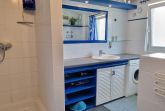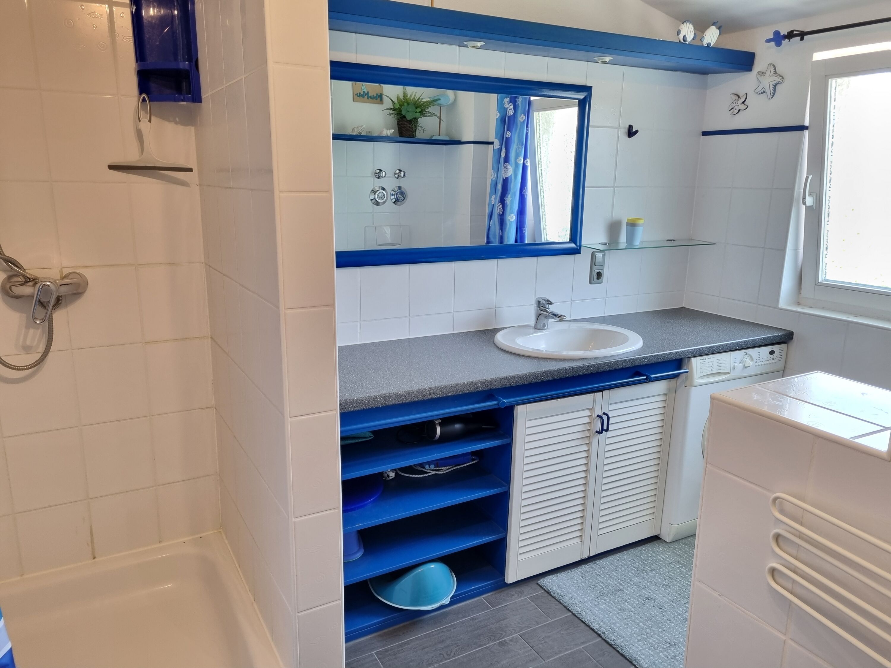 Das Badezimmer beinhaltet neben Dusche und WC auch einen Waschtisch mit reichlich Ablageflächen und einer Waschmaschine.