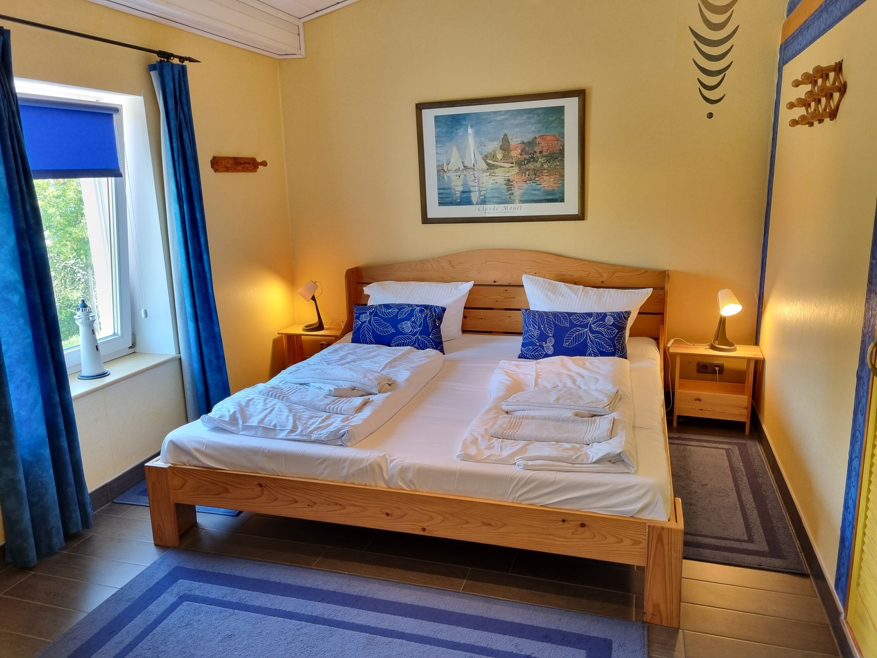 In der Ferienwohnung finden Sie 2 Schlafzimmer vor, eins mit einem Doppelbett und ein weiteres mit zwei Einzelbetten.