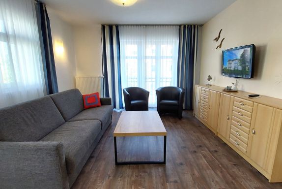 Diese freundliche Wohnung ist aufgeteilt in einen Wohnraum mit Balkon und integrierter Küchenzeile, zwei Schlafzimmer und ein Bad mit Dusche, Waschtisch und WC. Das Wohnzimmer begrüßt Sie mit einem Schlafsofa und Sessel sowie Flachbild-TV. Das Hauptschlafzimmer verfügt über ein Doppelbett (1,80m x 2m) sowie einen Kleiderschrank. Der zweite Schlafraum ebenso mit Balkon begrüßt Sie mit einem Etagenbett, Kleiderschrank und TV. Die Küchenzeile ist mit Backofen, Geschirrspüler, Cerankochfeld, Kühlschrank mit kleinem Gefrierfach, Cerankochfeld, Mikrowelle, Kaffeemaschine, Wasserkocher und Toaster ausgestattet. Highlights: Kostenfreies WLAN sowie ein frei wählbarer PKW-Stellplatz direkt am Haus. Haustiere sind in dieser Wohnung herzlich willkommen.