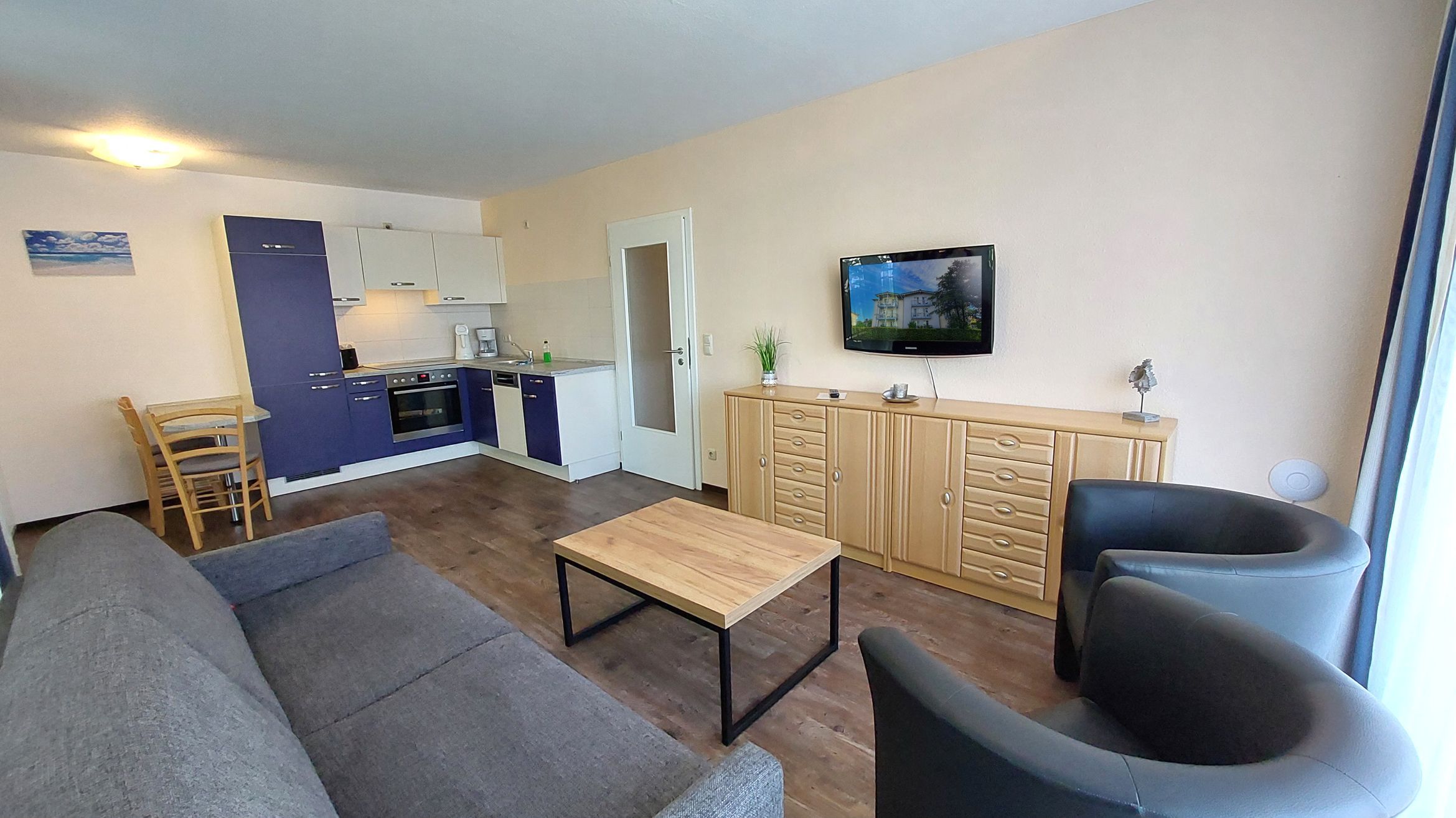 Diese freundliche Wohnung ist aufgeteilt in einen Wohnraum mit Balkon und integrierter Küchenzeile, ein Schlafzimmer ebenso mit Balkon und ein Duschbad mit Waschtisch und WC. Das Wohnzimmer begrüßt Sie mit einem Schlafsofa und Sessel sowie Flachbild-TV. Das Schlafzimmer verfügt über ein Doppelbett (1,80m x 2m) sowie einen Kleiderschrank. Die Küchenzeile ist mit Backofen, Geschirrspüler, Cerankochfeld, Kühlschrank mit kleinem Gefrierfach, Cerankochfeld, Mikrowelle, Kaffeemaschine, Wasserkocher und Toaster ausgestattet. Highlights: Kostenfreies WLAN sowie ein frei wählbarer PKW-Stellplatz direkt am Haus. Haustiere sind in dieser Wohnung herzlich willkommen.