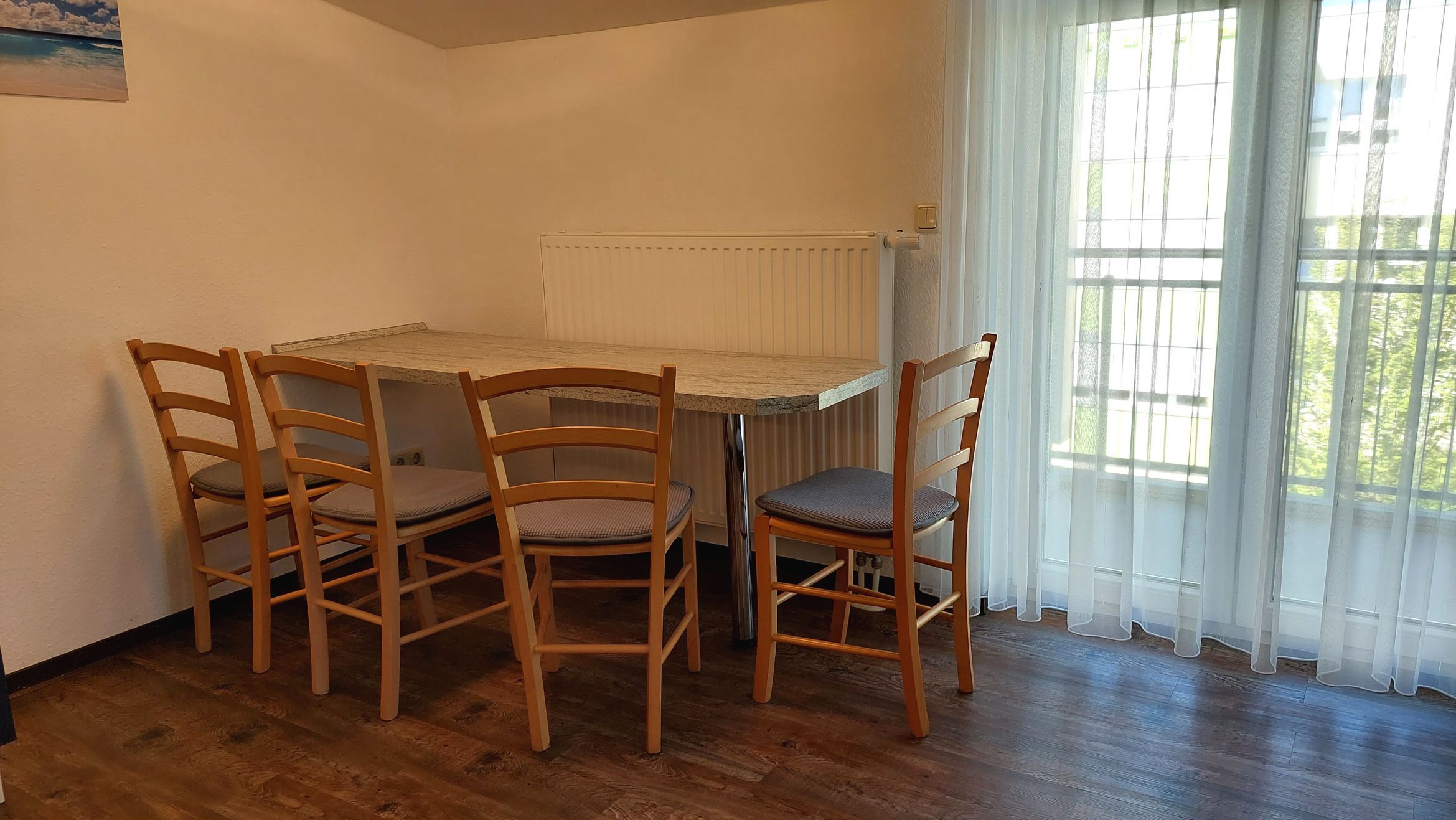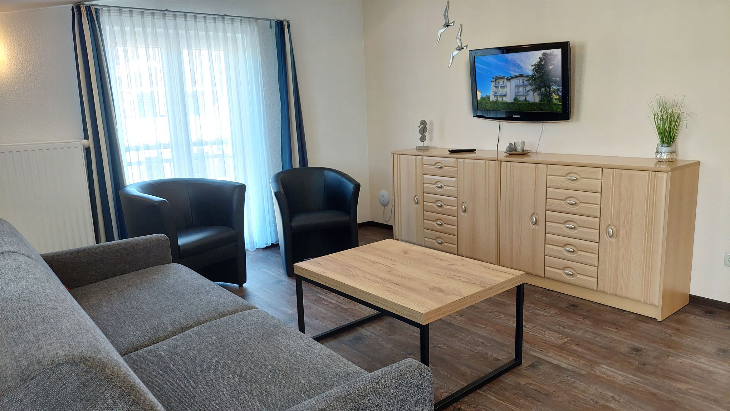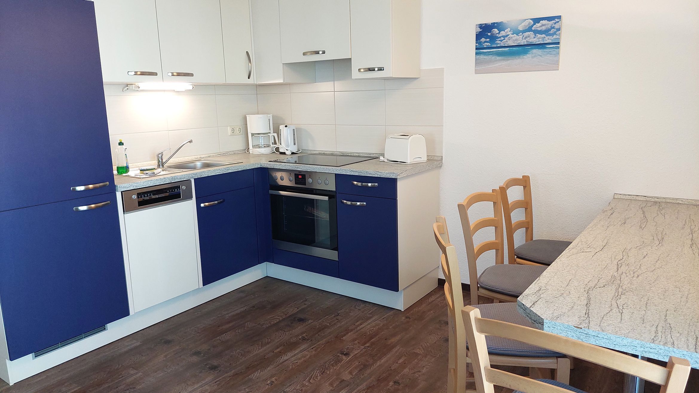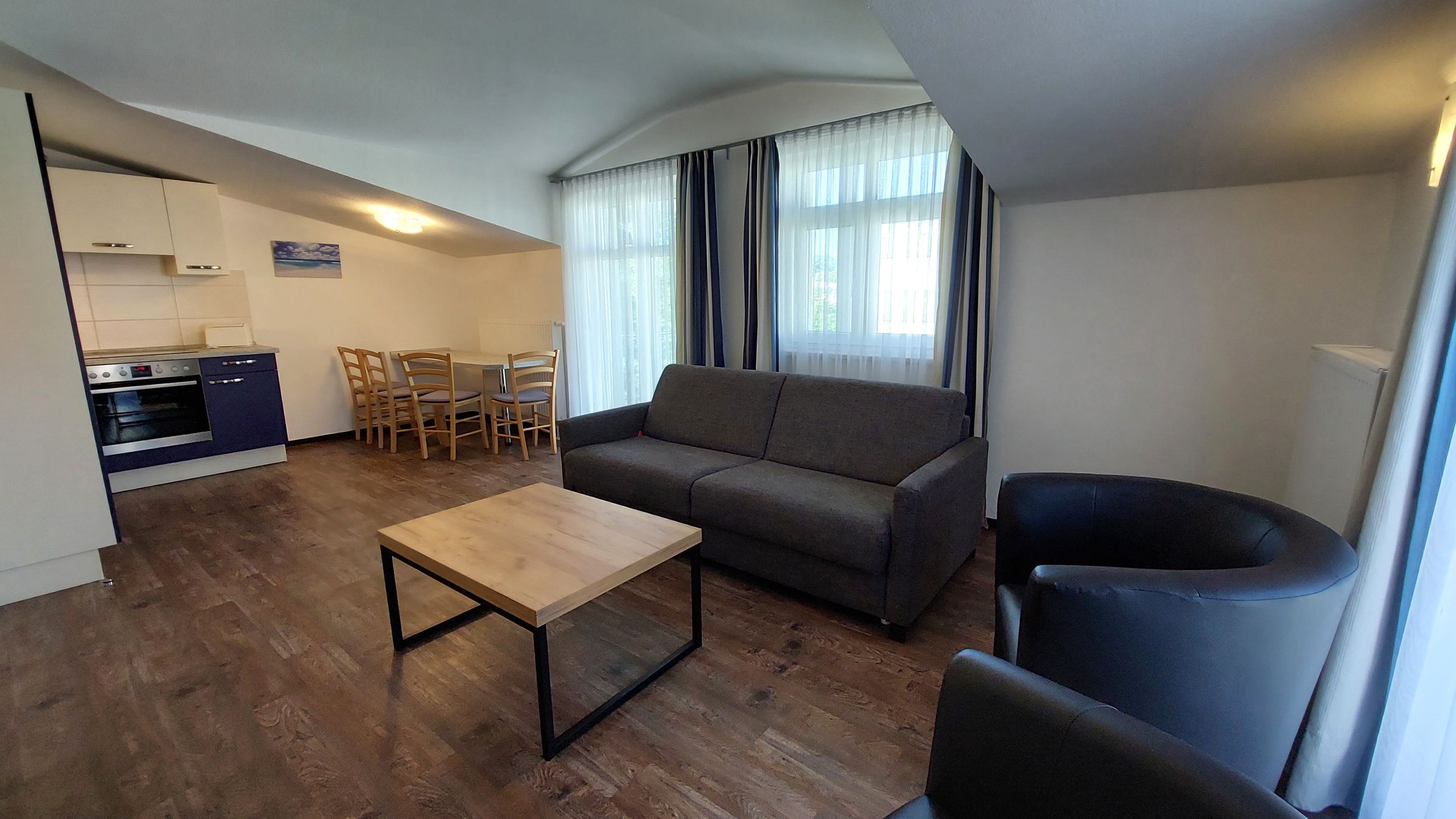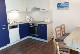 Diese freundliche Wohnung ist aufgeteilt in einen Wohnraum mit Balkon und integrierter Küchenzeile, zwei Schlafzimmer und ein Bad mit Dusche, Waschtisch und WC. Das Wohnzimmer begrüßt Sie mit einem Schlafsofa und Sessel sowie Flachbild-TV. Das Hauptschlafzimmer verfügt über ein Doppelbett (1,80m x 2m) sowie einen Kleiderschrank. Der zweite Schlafraum ebenso mit Balkon begrüßt Sie mit einem Etagenbett, Kleiderschrank und TV. Die Küchenzeile ist mit Backofen, Geschirrspüler, Cerankochfeld, Kühlschrank mit kleinem Gefrierfach, Cerankochfeld, Mikrowelle, Kaffeemaschine, Wasserkocher und Toaster ausgestattet. Highlights: Kostenfreies WLAN sowie ein frei wählbarer PKW-Stellplatz direkt am Haus.