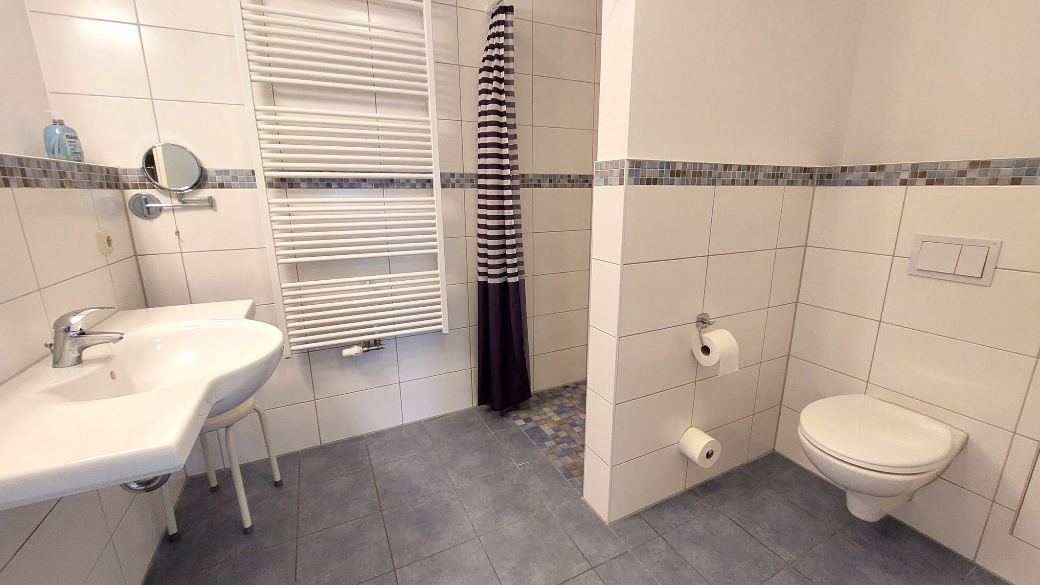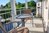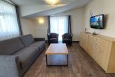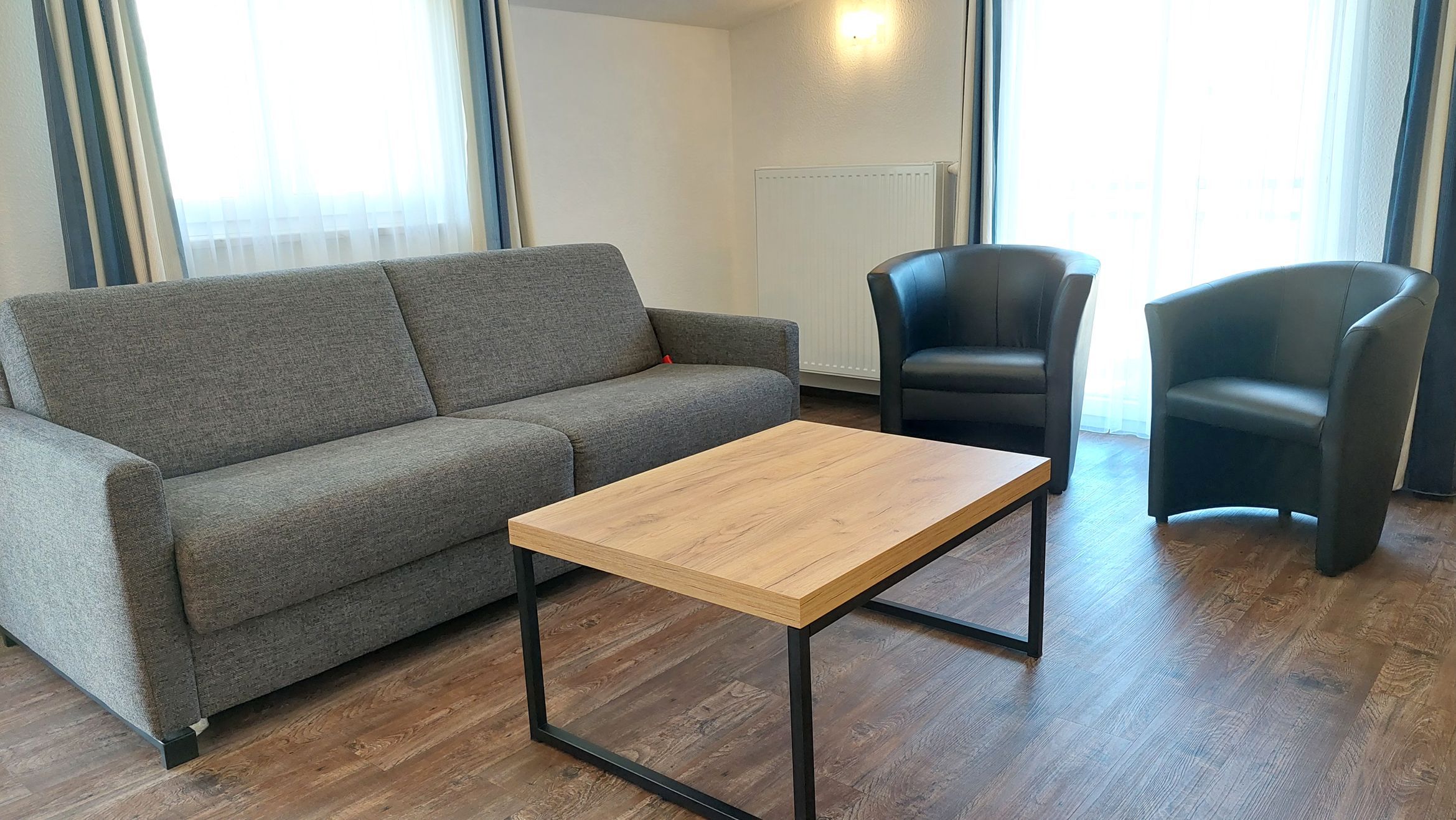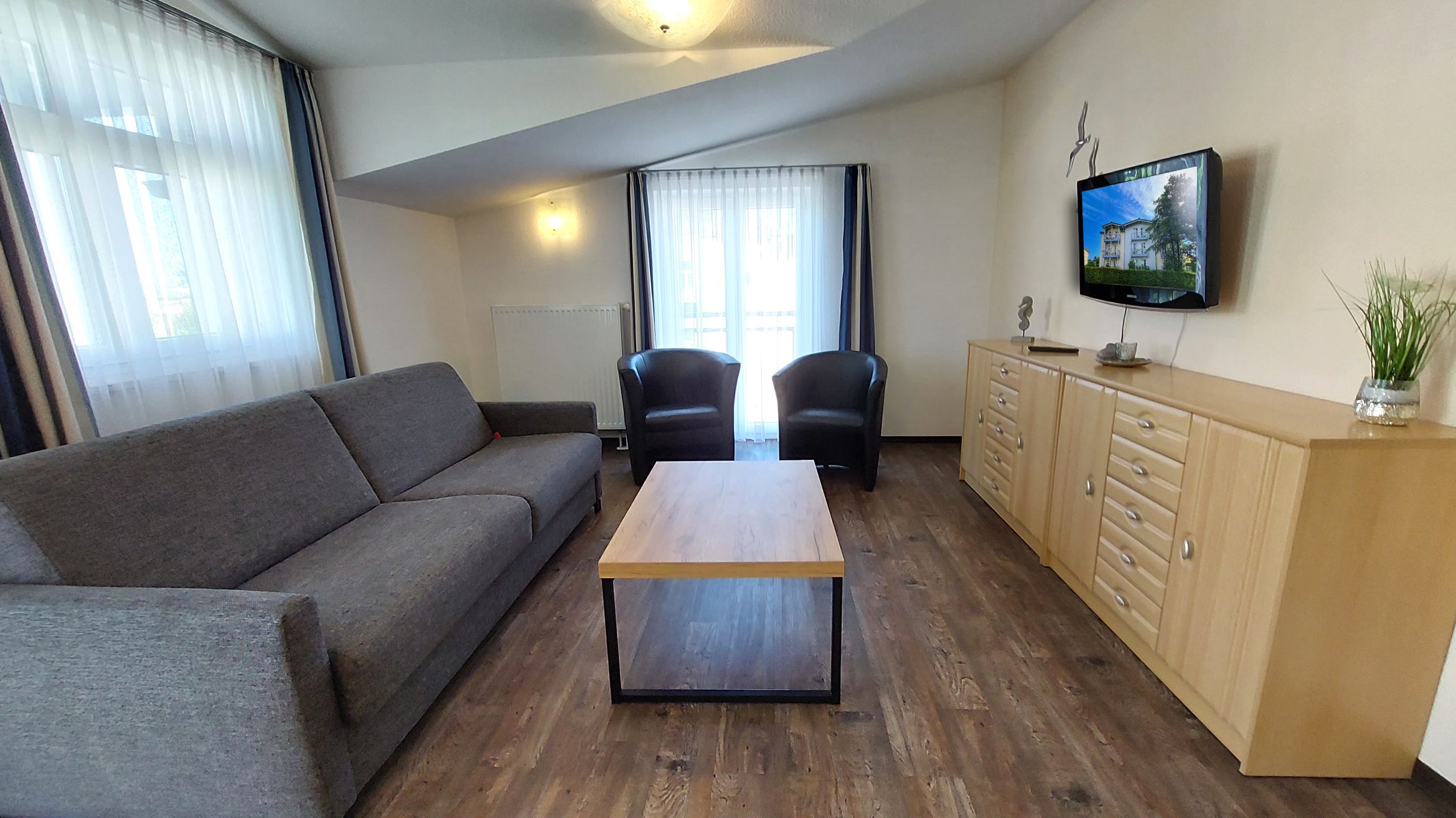 Diese freundliche Wohnung ist aufgeteilt in einen Wohnraum mit Balkon und integrierter Küchenzeile, zwei Schlafzimmer und ein Bad mit Dusche, Waschtisch und WC. Das Wohnzimmer begrüßt Sie mit einem Schlafsofa und Sessel sowie Flachbild-TV. Das Hauptschlafzimmer verfügt über ein Doppelbett (1,80m x 2m) sowie einen Kleiderschrank. Der zweite Schlafraum ebenso mit Balkon begrüßt Sie mit einem Etagenbett, Kleiderschrank und TV. Die Küchenzeile ist mit Backofen, Geschirrspüler, Cerankochfeld, Kühlschrank mit kleinem Gefrierfach, Cerankochfeld, Mikrowelle, Kaffeemaschine, Wasserkocher und Toaster ausgestattet. Highlights: Kostenfreies WLAN sowie ein frei wählbarer PKW-Stellplatz direkt am Haus.