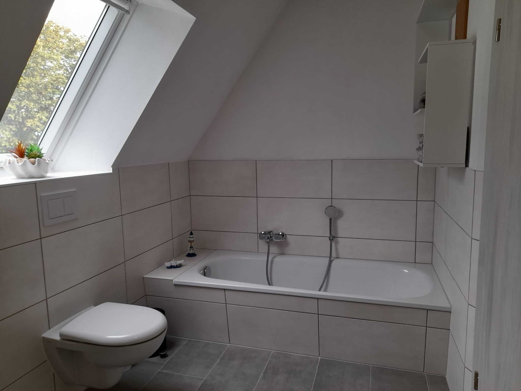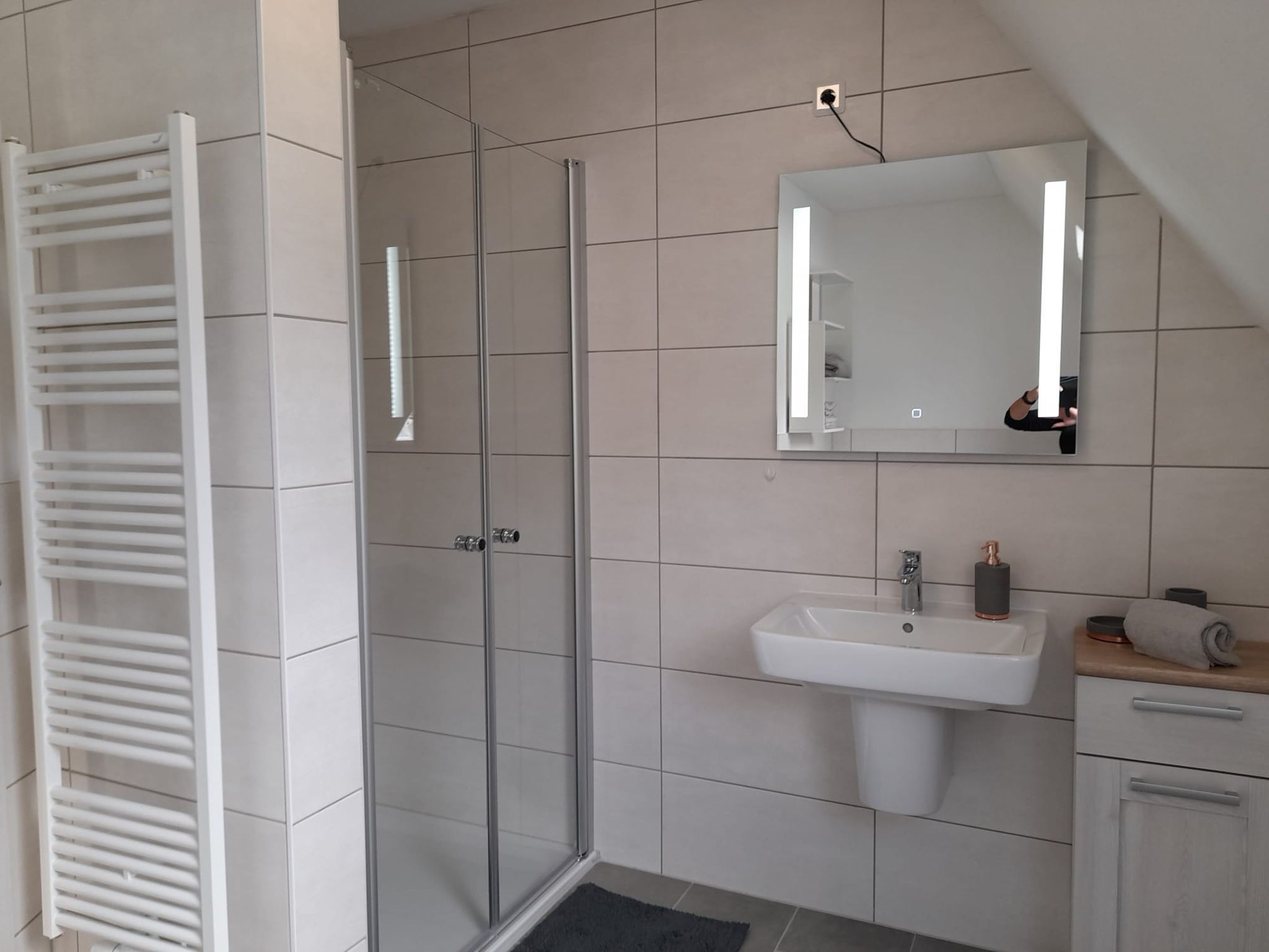 - Duschbad mit großzügiger ebenerdiger Dusche, Waschbecken, Spiegel, Badewanne sowie WC, Handtücher zubuchbar.