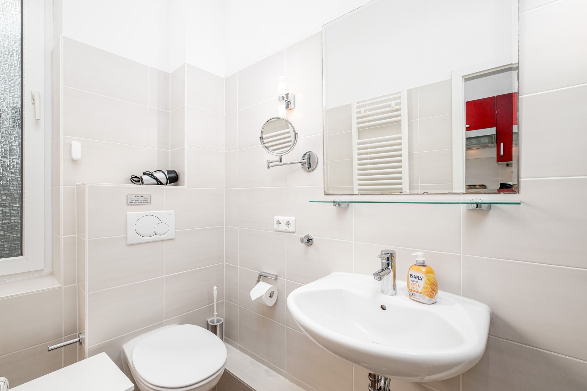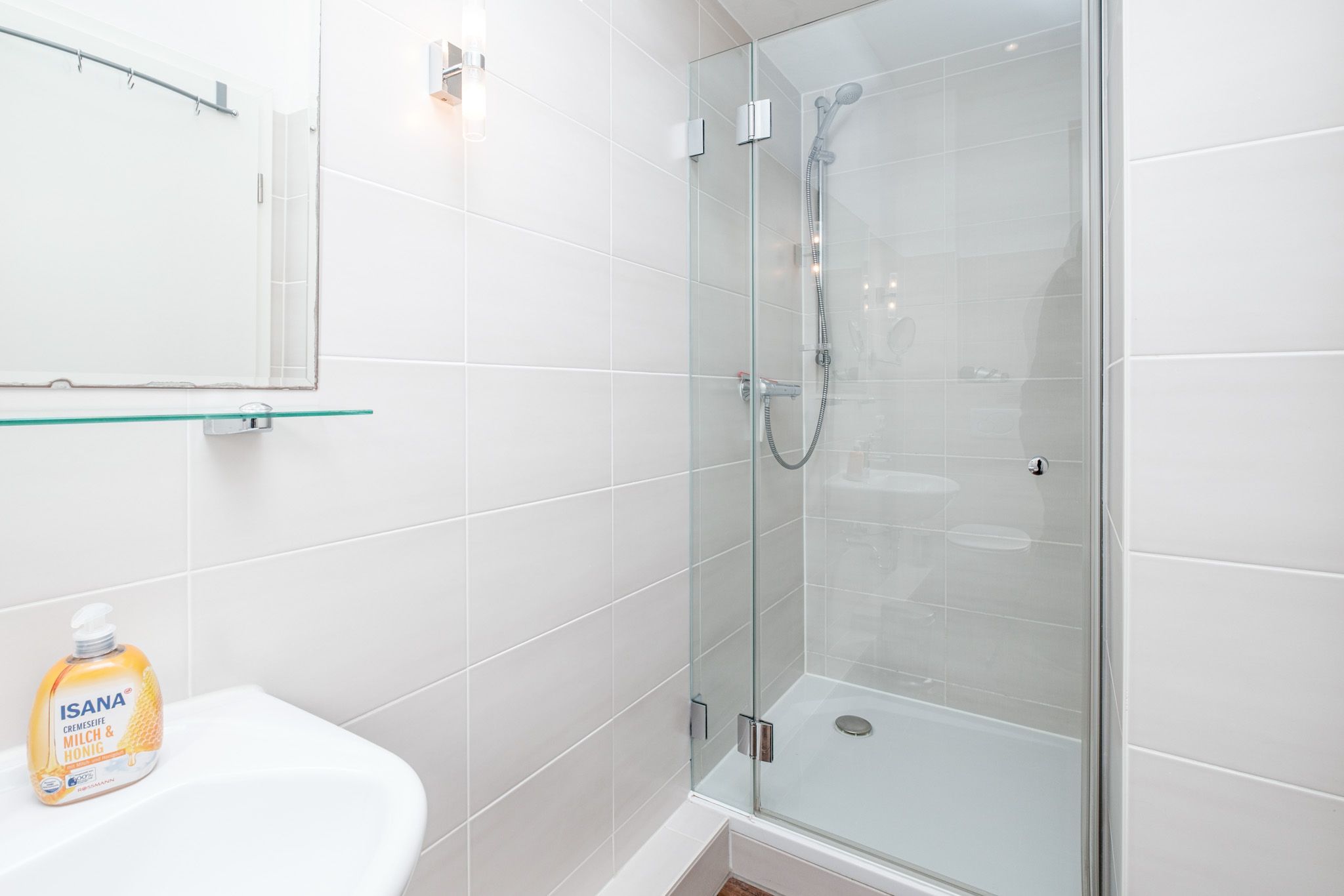 Im Badezimmer mit Dusche, WC, Fön und Kosmetikspiegel sowie einem Handtuchwärmer können Sie nach einem entspannten Tag an der Ostsee erfrischen.
