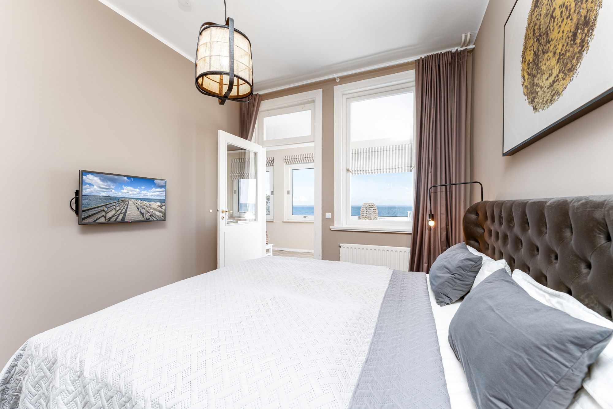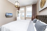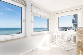 Hell und modern eingerichtet, verfügt das Wohnzimmer für eine bequeme Couchgarnitur mit Flachbild-TV, Blu-Ray-Player und HiFi-Anlage sowie eine integrierte Einbauküche mit Geschirrspüler und Mikrowelle. Von hier aus betreten Sie die Wohnveranda, wo sich ein geräumiger Essbereich befindet und Sie einen traumhaften Meerblick auf die Ostsee genießen können.