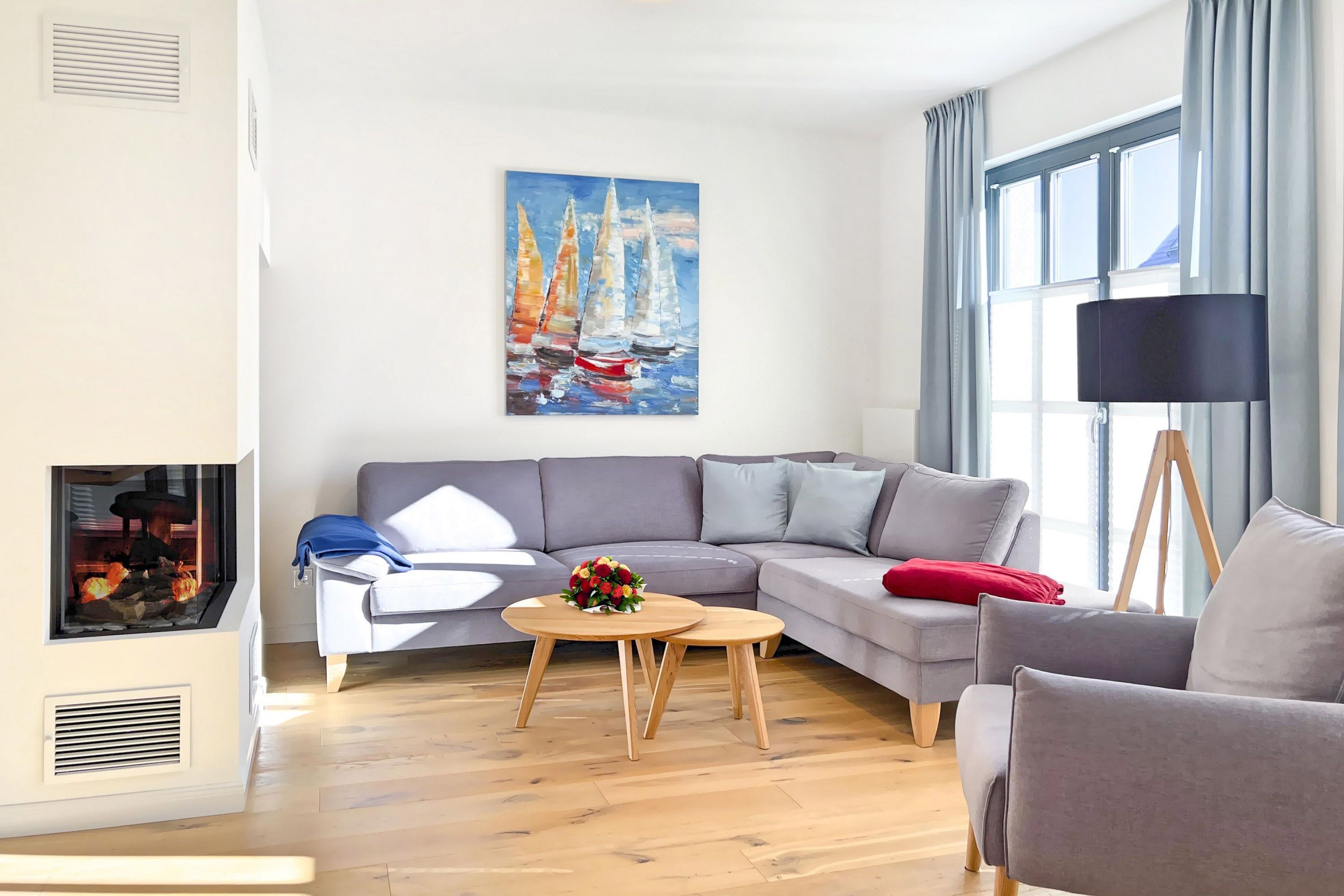 • Gemütlicher Wohnbereich mit Kamin und bequemen Sofas