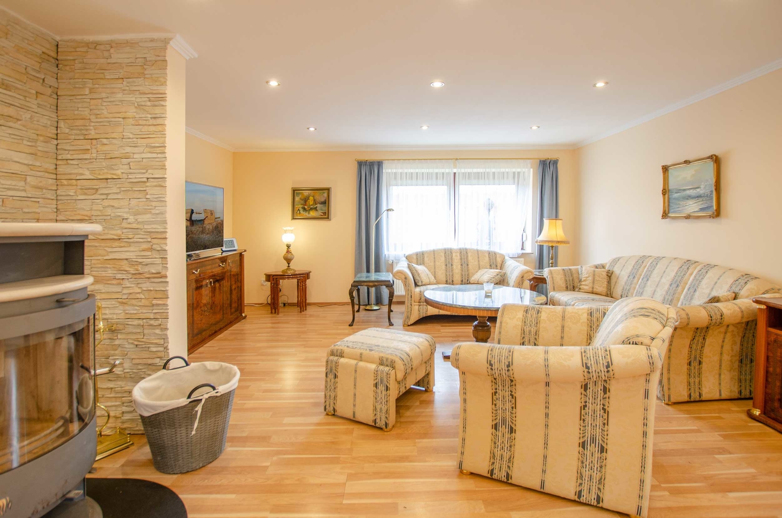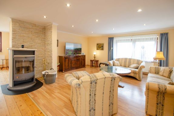 Hier befindet sich eine große Couchgarnitur, Couchtisch, Kommode mit großem Fernseher sowie ein Kamin der in den kalten Jahreszeiten für eine wohlige Atmosphäre sorgt.