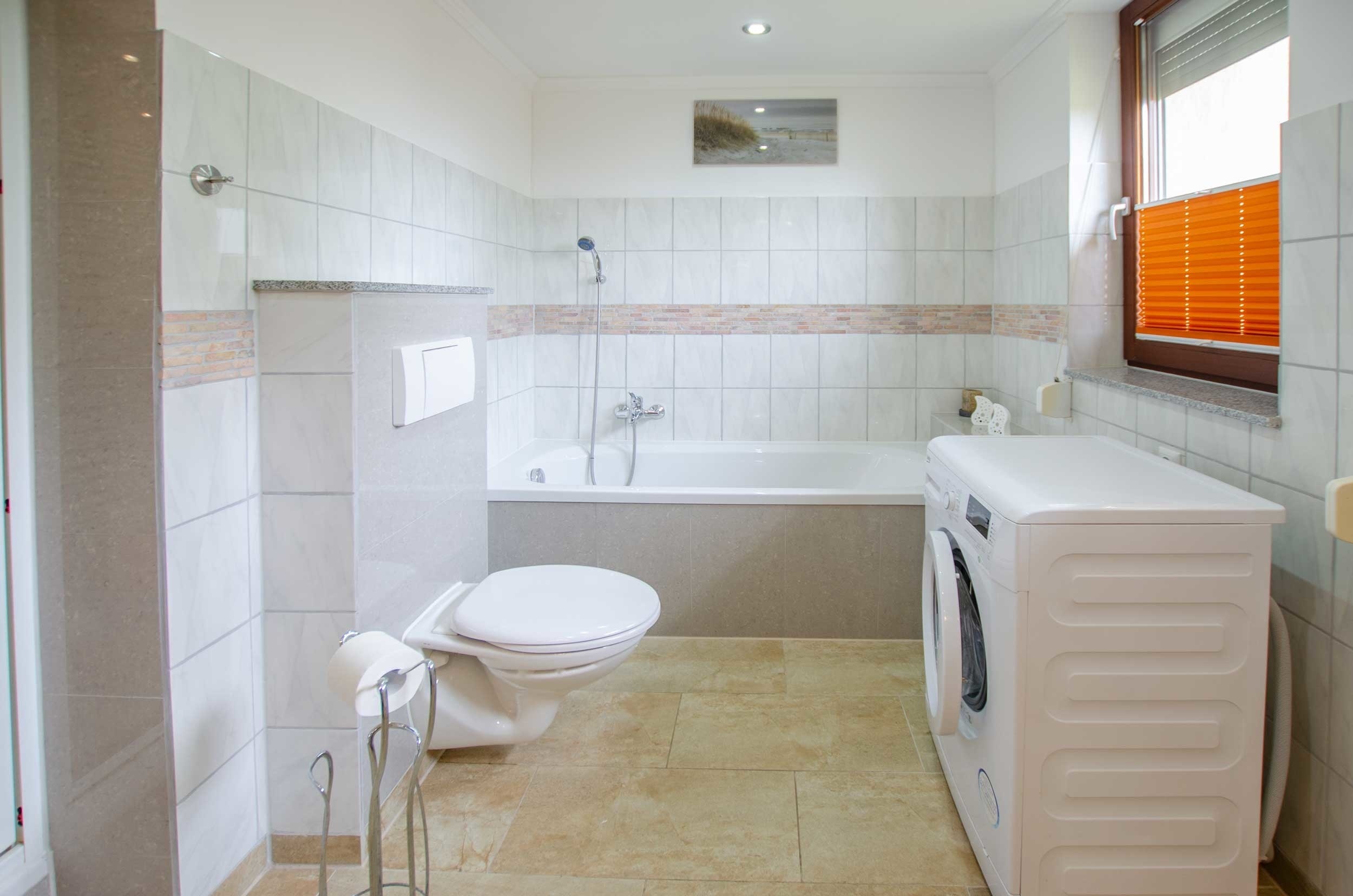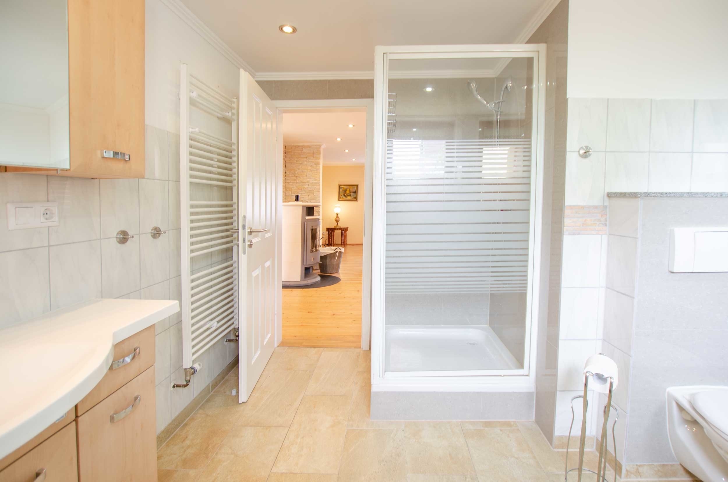 Das Badezimmer ist mit großer Dusche, Badewanne, Waschmaschine und Waschtisch eingerichtet.
