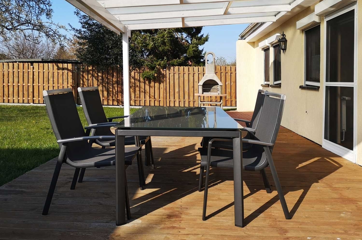 Die große Terrasse auf der Sonnenseite des Hauses und der Garten sind vom Wohnraum aus zu erreichen.