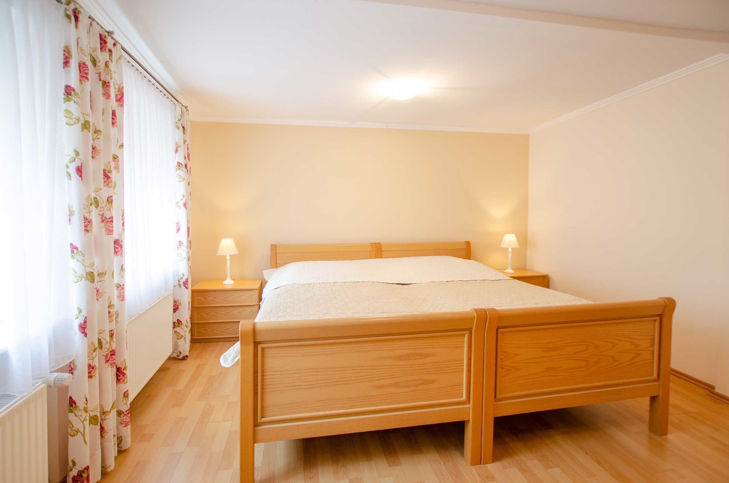 Die zwei separaten Schlafzimmer sind mit Doppelbetten, Nachttischen und Leseleuchten ausgestattet.