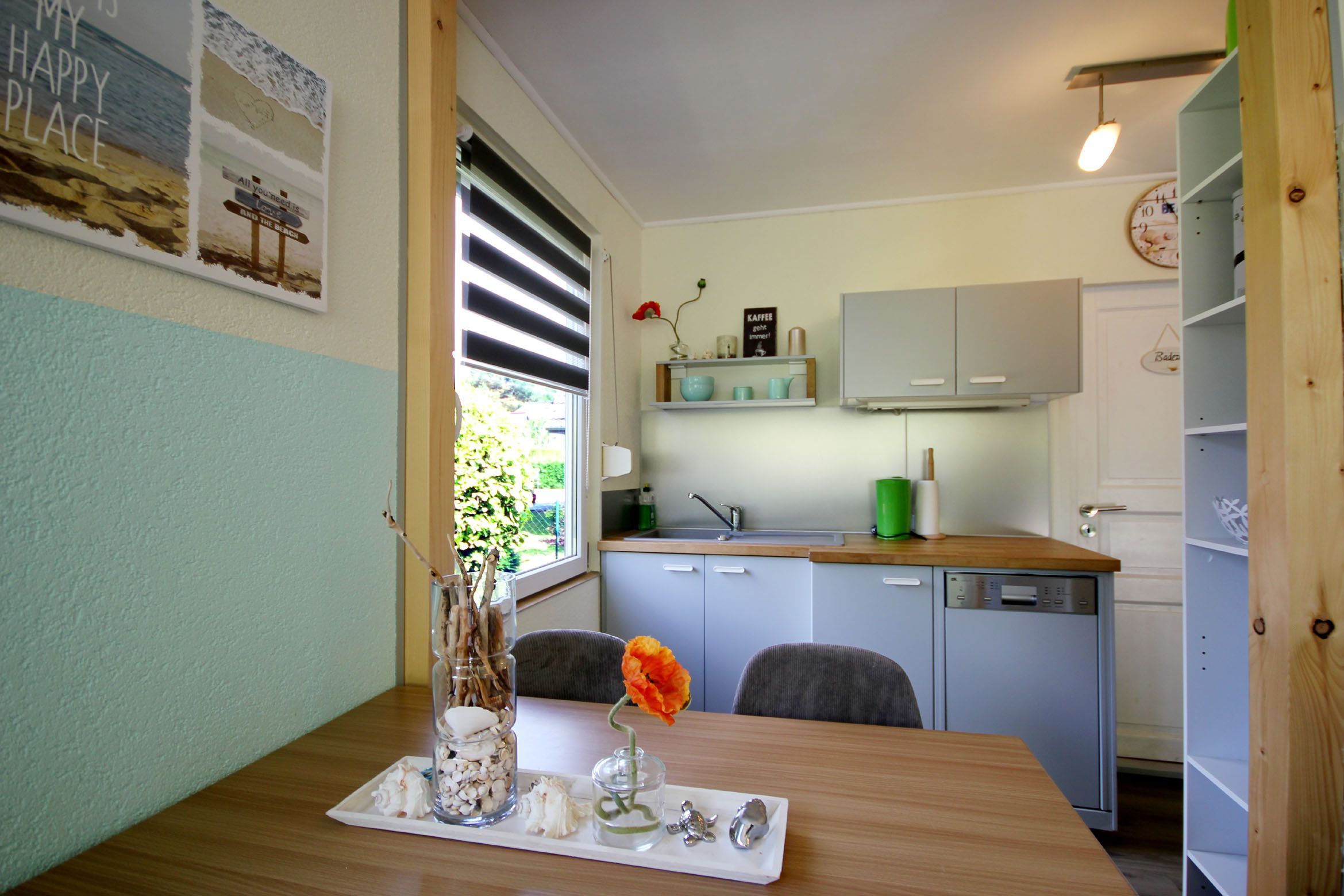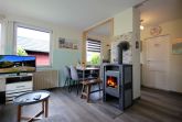 Der Bungalow teilt sich auf in ein Wohnzimmer mit Kamin, einem Essbereich, einer separaten Küche, ein Tageslichtbad sowie zwei Schlafzimmer. Eine angrenzende Terrasse mit Strandkorb und Blick ins Grüne lädt zum Verweilen und Sonnenbaden ein. Im gemütlichen Wohnraum erwartet Sie eine bequeme Sitzecke sowie ein separater Essbereich, ein Kamin und ein Flachbild-TV. Die integrierte Küche verfügt über ein 2-Platten-Kochfeld, einen Kühlschrank mit kleinem Gefrierfach, Geschirrspüler, Kaffeemaschine, Toaster, Mikrowelle und Wasserkocher. Im Tageslichtbad finden Sie eine Dusche, Waschtisch sowie WC. Das Hauptschlafzimmer ist mit einem Doppelbett und einem Kleiderschrank ausgestattet. Das zweite Schlafzimmer verfügt über ein Etagenbett für 2 Personen. Durch den eigenen abschließbaren Garten und die grüne Umgebung ist diese Wohnung ideal für Familien mit Kindern und Haustieren geeignet. Ihren PKW können Sie direkt am Haus abstellen. Hier haben bis zu 2 PKW´s Platz. Fahrräder können Sie im hauseigenen Raum unterstellen. Die unbefestigte Zufahrtsstraße ist für Autos mit geringer Bodenfreiheit nicht geeignet.