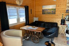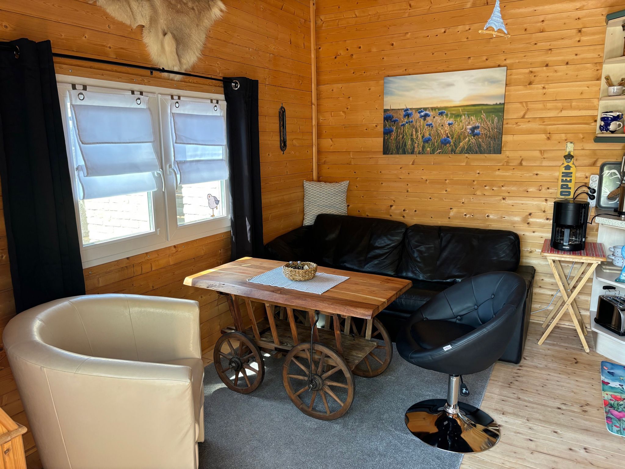 Das Wohnzimmer ist mit einer gemütlichen Couchgarnitur, Schrank, Flachbild-TV, W-LAN und integrieter Miniküche ausgestattet. Die Küche verfügt über einen 2-Plattenherd, Kühlschrank mit Gefrierfach, Mikrowelle, Wasserkocher, Kaffeemaschine, Toaster und diversen Küchenutensilien.