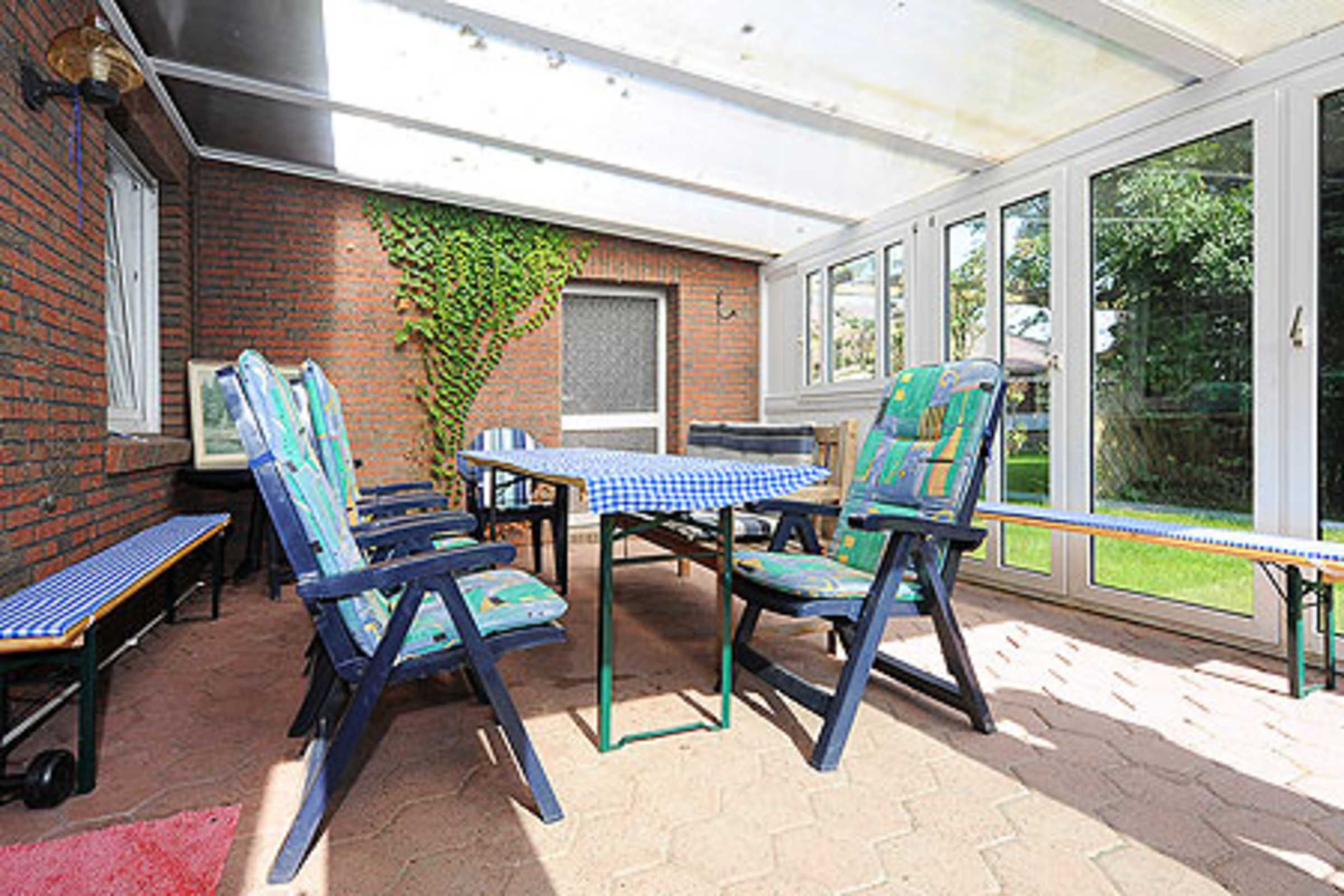 Größe ca. 60 Quadratmeter, Wohn- und Schlafraum mit räumlich abgeteiltem Küchenbereich, zweites separates Schlafzimmer/Kinderzimmer, Badezimmer mit Doppel-Waschtisch, Dusche, Bidet und WC, Obergeschoss, Terrasse im Garten, Wintergarten am Garten, optimal für 2 bis 5 Personen und zusätzlich ein Kleinkind.