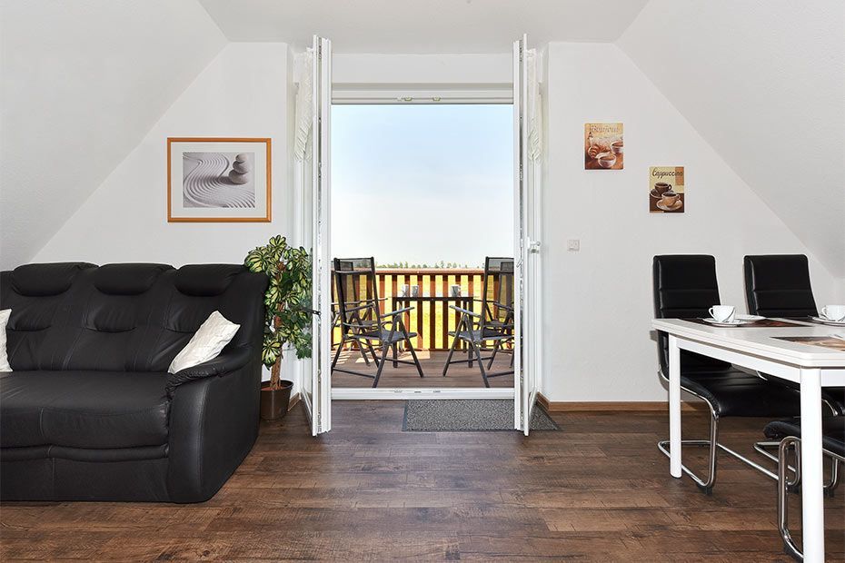 Größe ca. 58 Quadratmeter, Wohnraum mit integrierter Küche, Schlafzimmer, zweites separates Schlafzimmer, Badezimmer mit Dusche, Waschtisch und WC, Obergeschoss, Balkon, überdachte Terrasse (am Garten, kein direkter Wohnungszugang), optimal für 2 bis 4 Personen und zusätzlich ein Kleinkind.