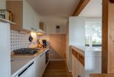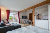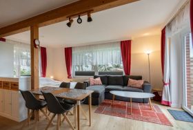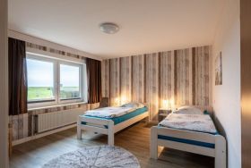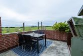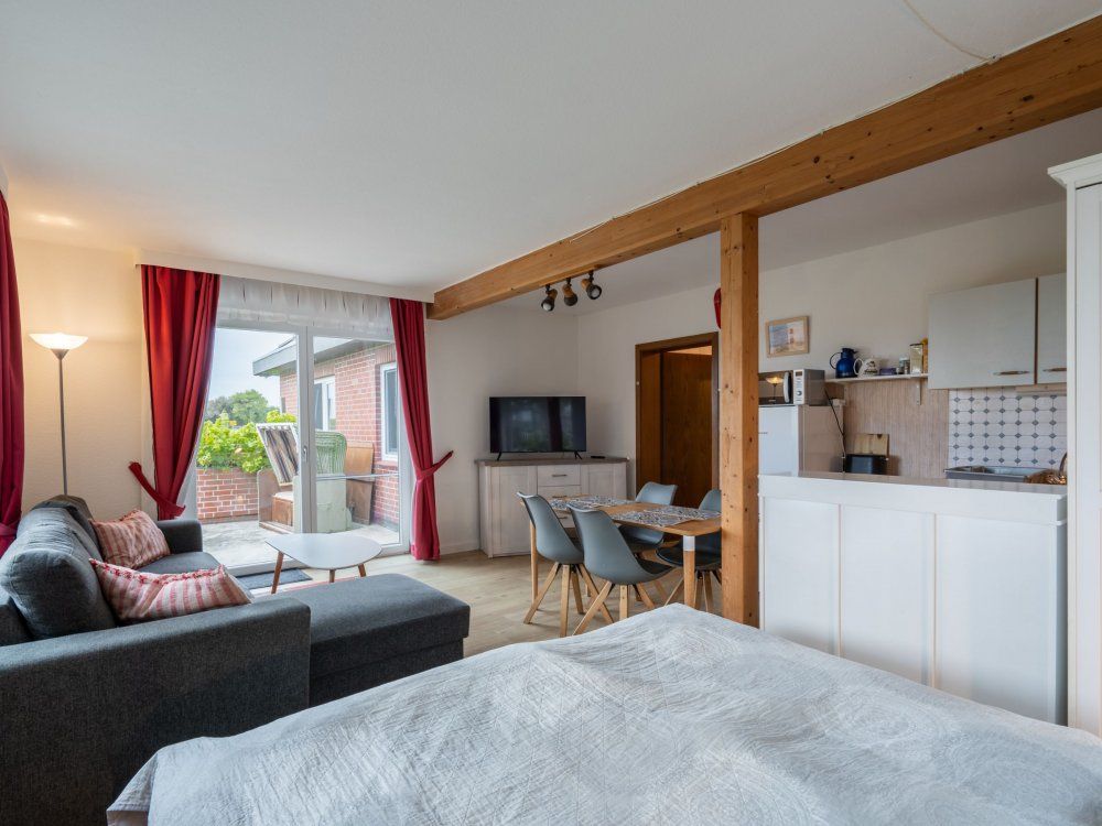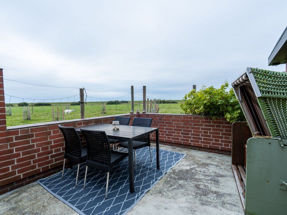 Ebenerdige Wohnung mit Blick über Wiesen auf den Nordseedeich. Terasse mit Gartenmöbeln und Strandkorb. , Wohnzimmer mit Küchenzeile, Esstisch und etwas optisch abgetrennt ein Doppelbett. und Kleiderschrank. Das Kinderzimmer hat 2 Einzelbetten mit 1 m Breite. Verdunklungsplissee und Fliegengitter vor den Fenstern. Bad mit begehbarer Dusche,