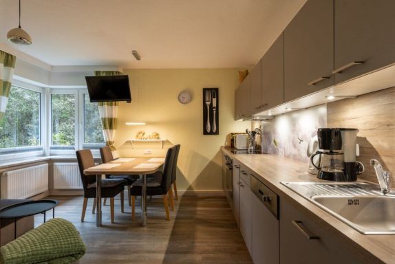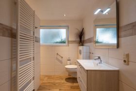 Parterrewohnung mit einer Wohnküche, Schlafzimmer mit TV und Boxspringbett, Kinderzimmer mit 3 Einzelbetten, Bad mit begehbarer Dusche, seperates WC, großer Spielflur vor den Zimmern. Verdunklungsplissee und Flegengitter vor den Fenstern.i