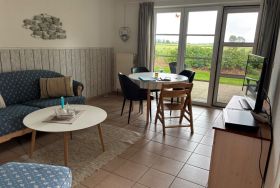 Die Wohnung ist ebenerdig mit seperatem Eingang und direktem Zugang zur Südterrasse. Durch die bodentiefen Fenster im Wohnzimmer haben Sie einen herrlichen Panoramablick in die schöne Eiderstedter Landschaft.